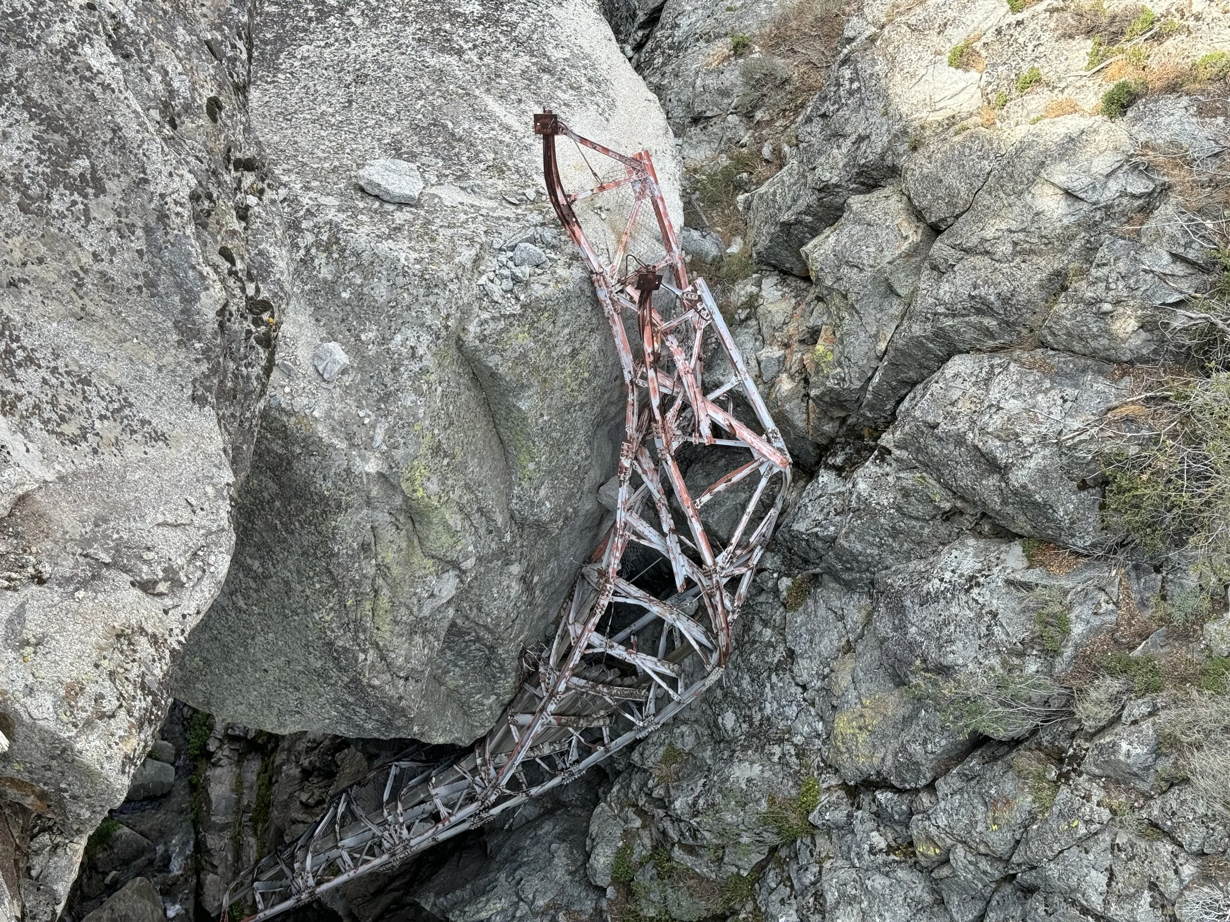 The original bridge was destroyed by an avalanche and can be seen in the canyon below!