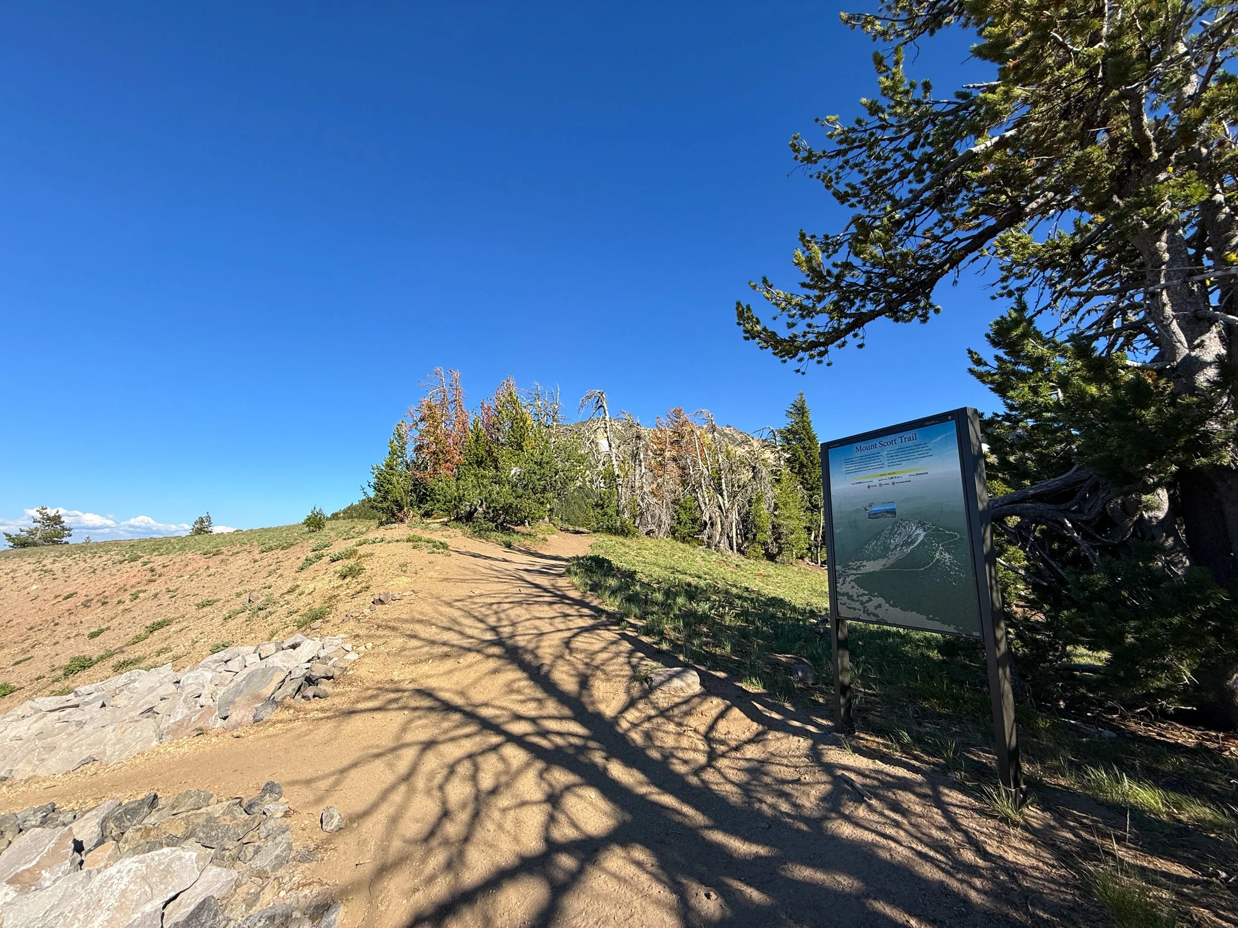 The Mt. Scott Trail begins just up the hill from the parking area, where it parallels the summit ridge on Mt. Scott, until it begins ascending the switchbacks on the south side of the mountain.
