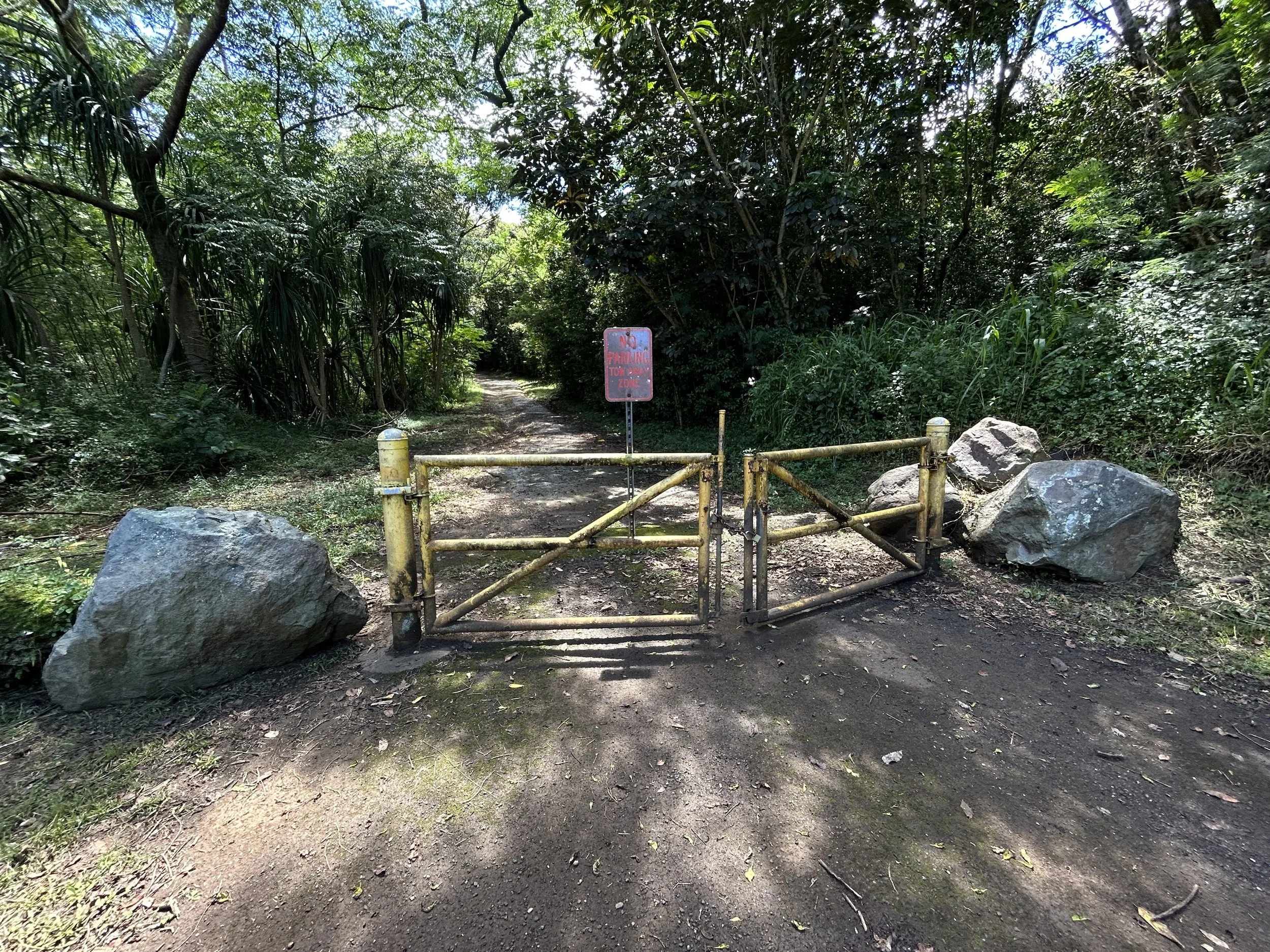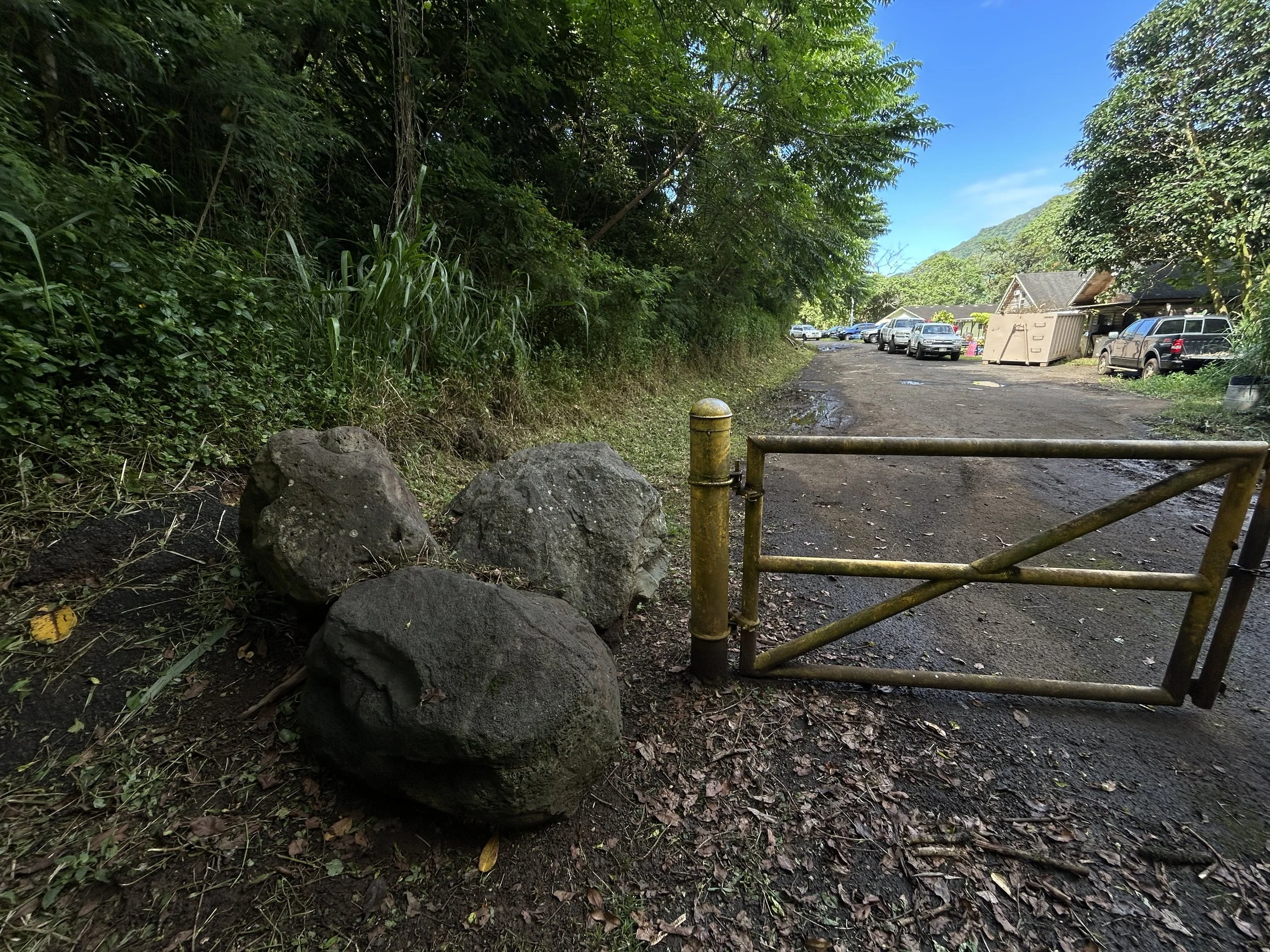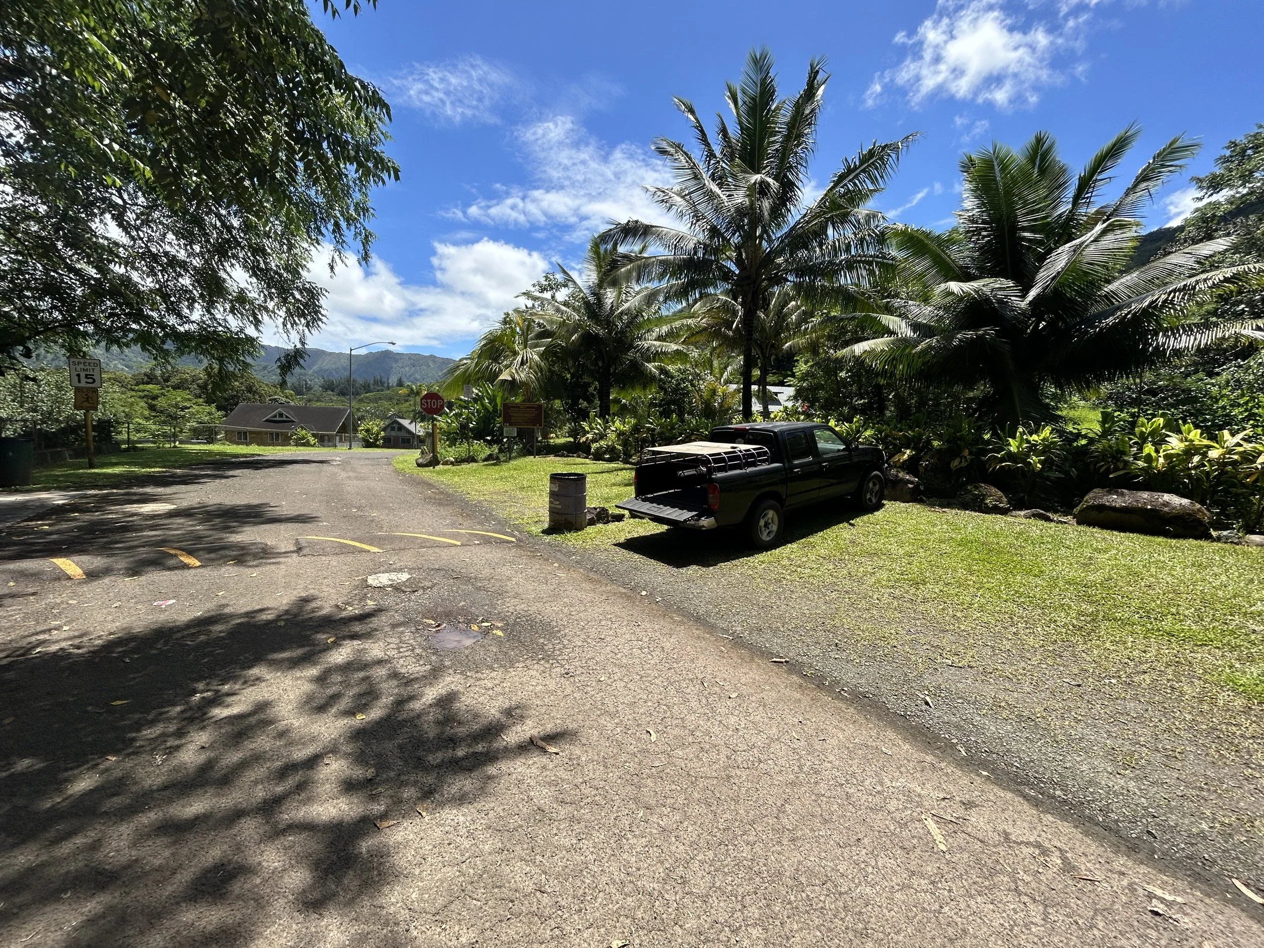 From the parking area, the Nākoa Trail doesn’t begin for another 0.6 miles (1.0 km) up Kahana Valley Road.