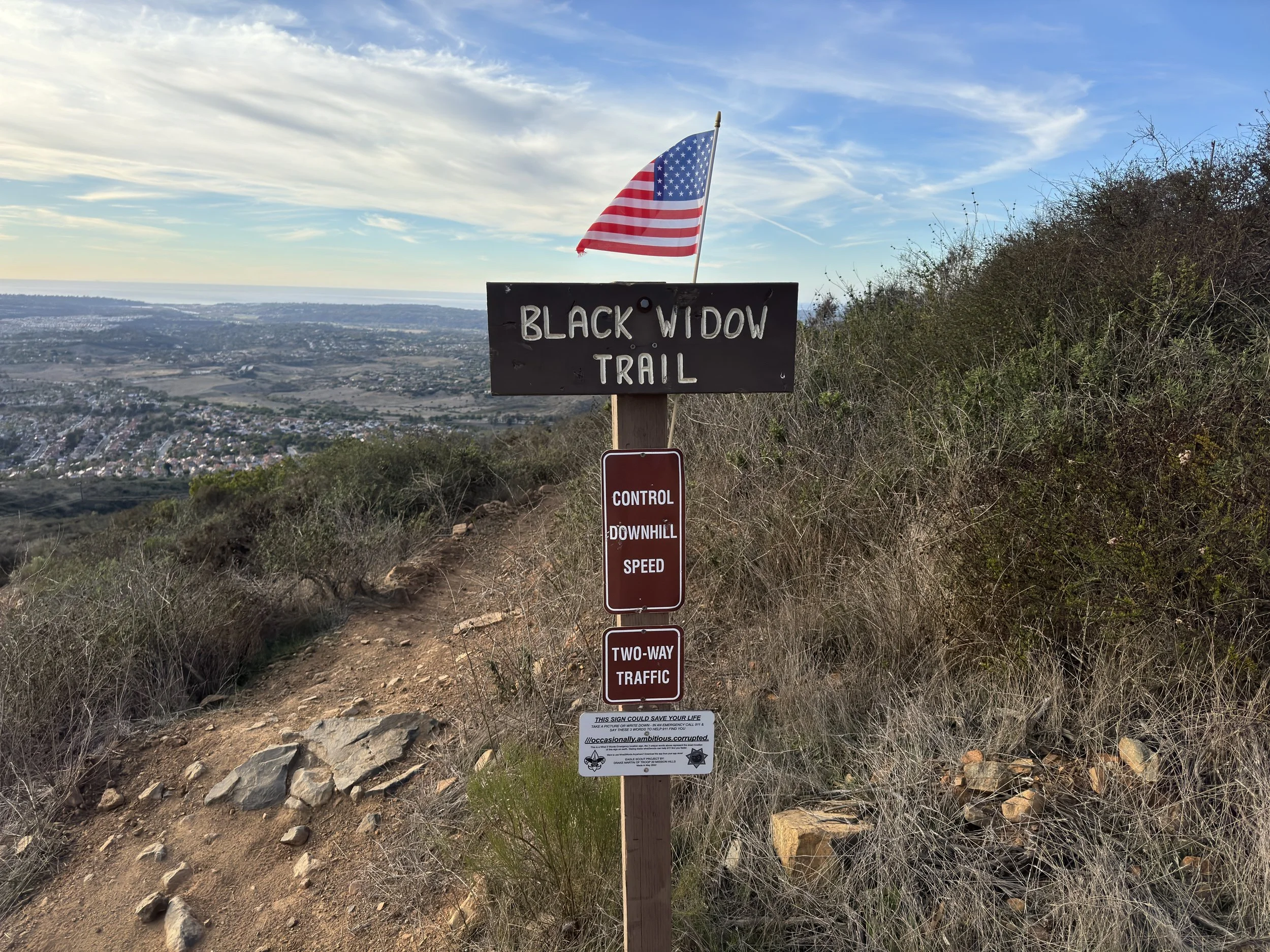 The last and final trail junction before Black Mountain Summit is the Black Widow Trail, off to the side of the service road.