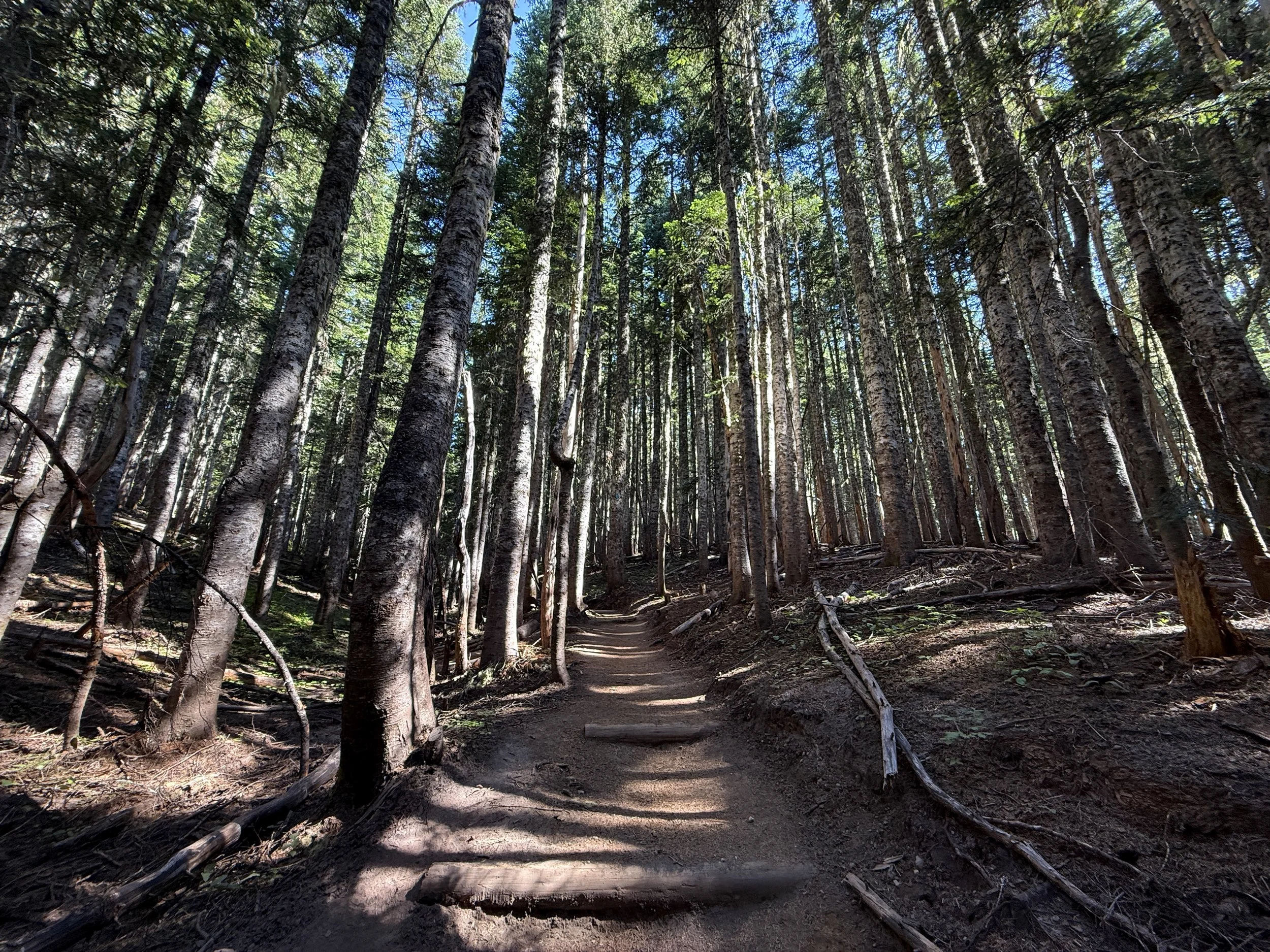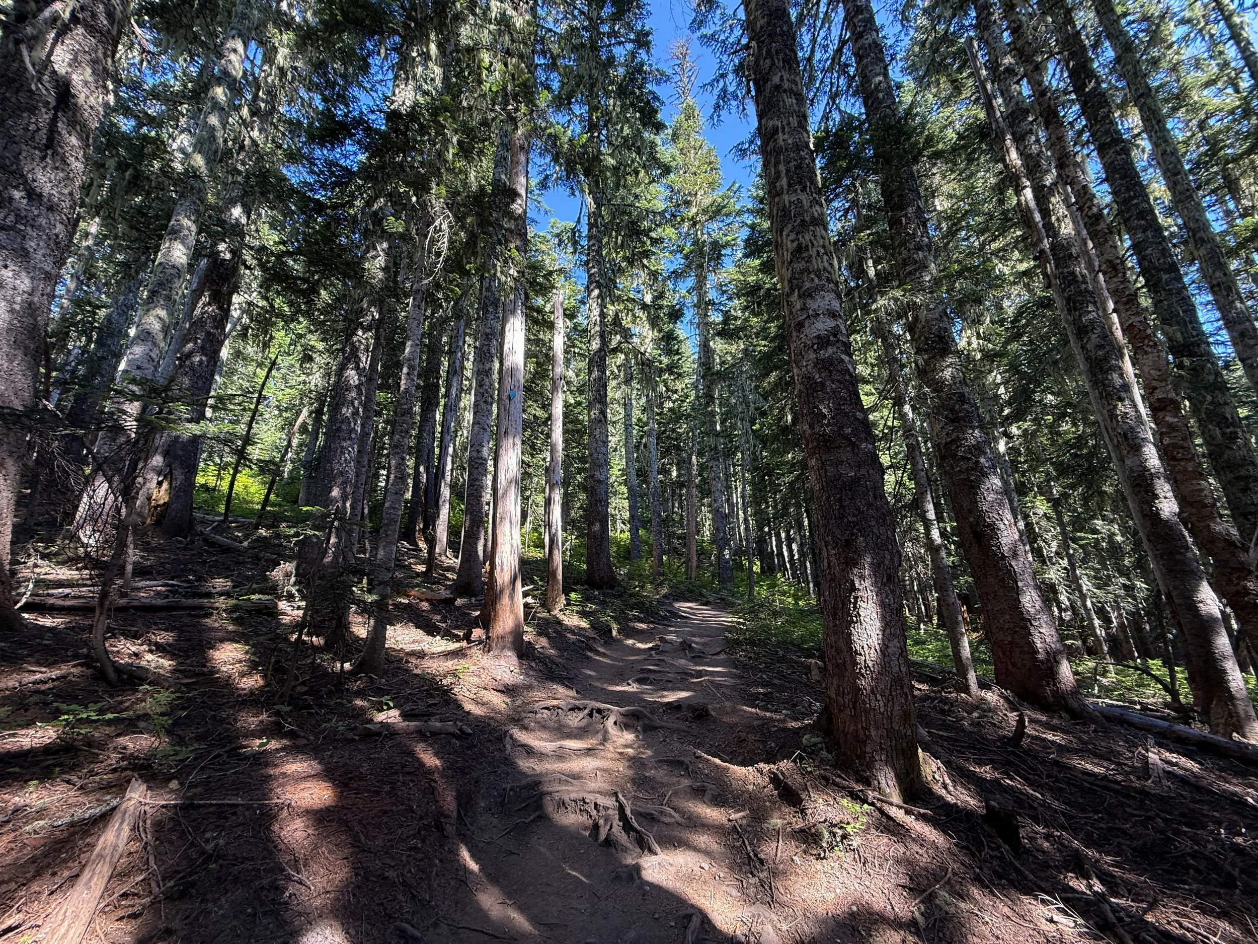 In my opinion, the lowest elevations of the Ptarmigan Trail take the longest to hike mentally, as there are no views through the dense Western Hemlock–Douglas Fir forests that dominate this part of the Pacific Northwest, until the trail starts to get close to the Monitor Ridge junction.