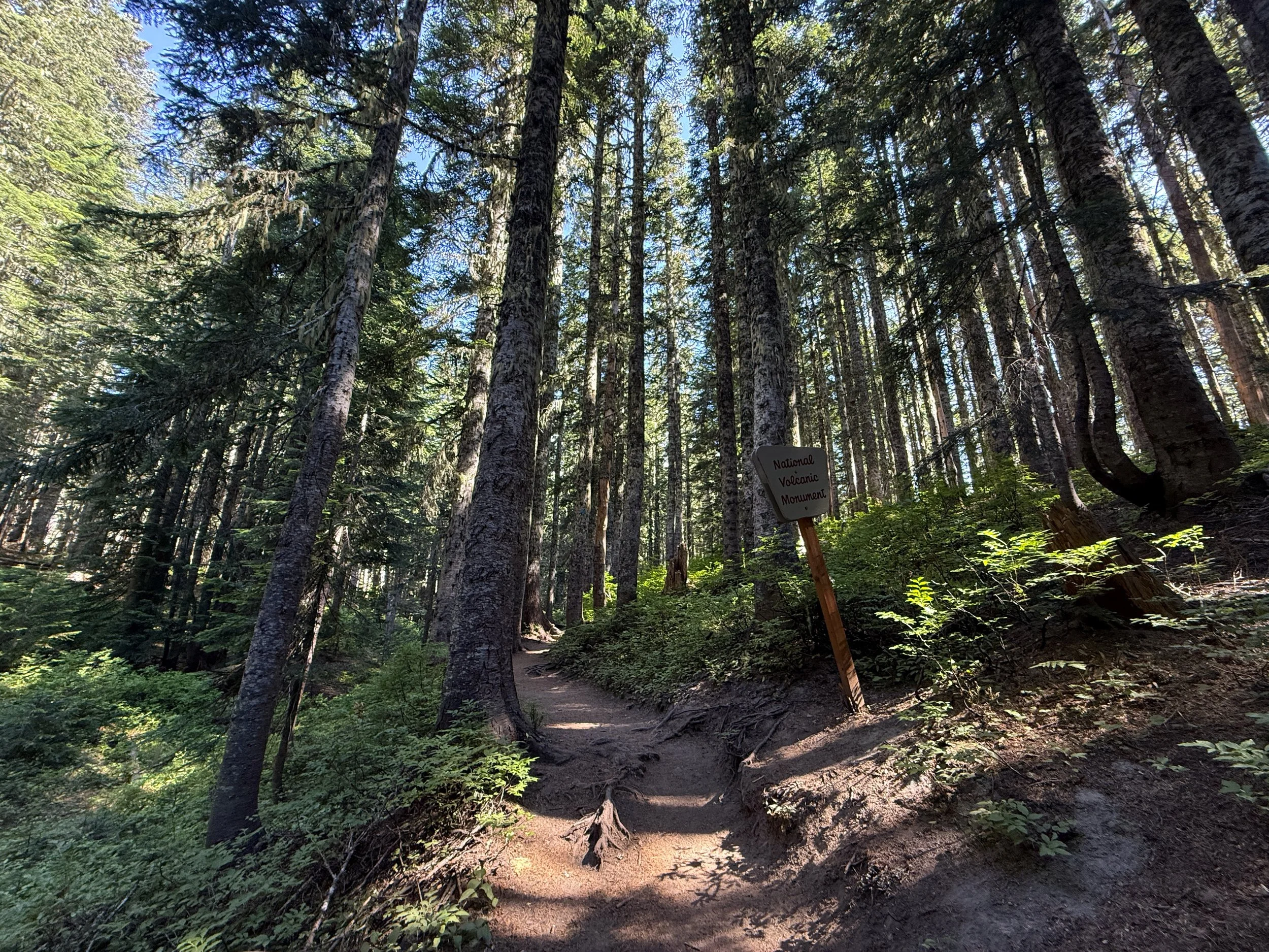 From here, the rest of the hike to the summit of Mount St. Helens follows the Monitor Ridge Trail, which reaches treeline and the permit zone just 0.2 miles (0.3 km) up the trail from this junction.
