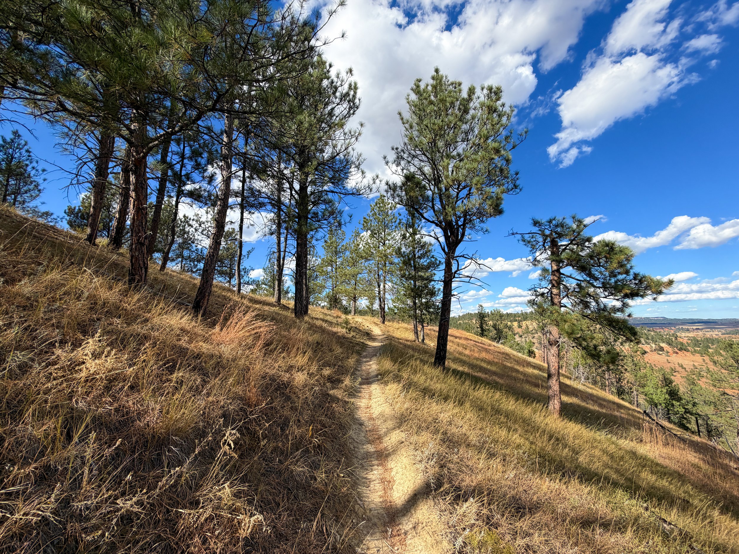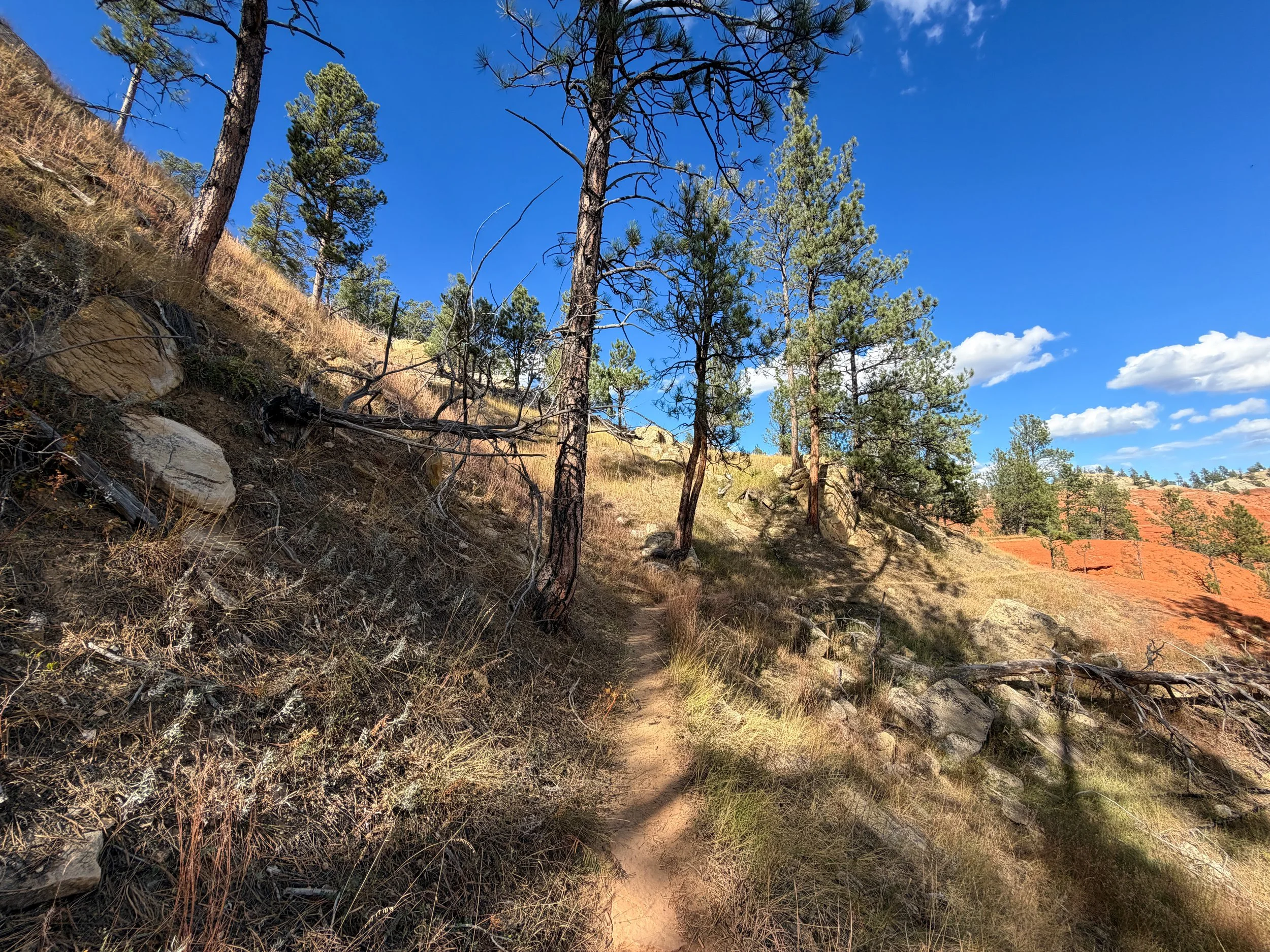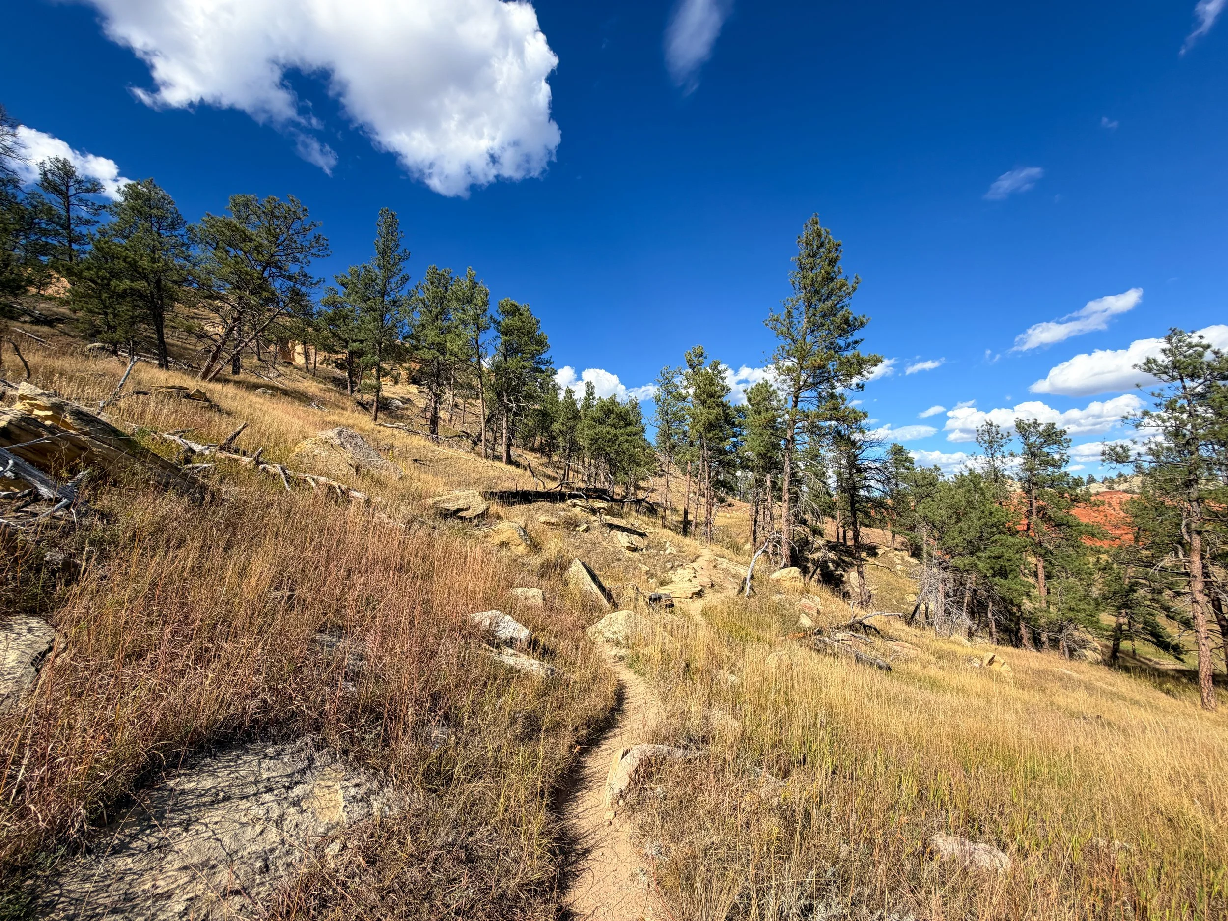 When the Red Beds Loop begins to turn toward the eastern side of Devils Tower, the trail descends much more noticeably toward the Belle Fourche River.