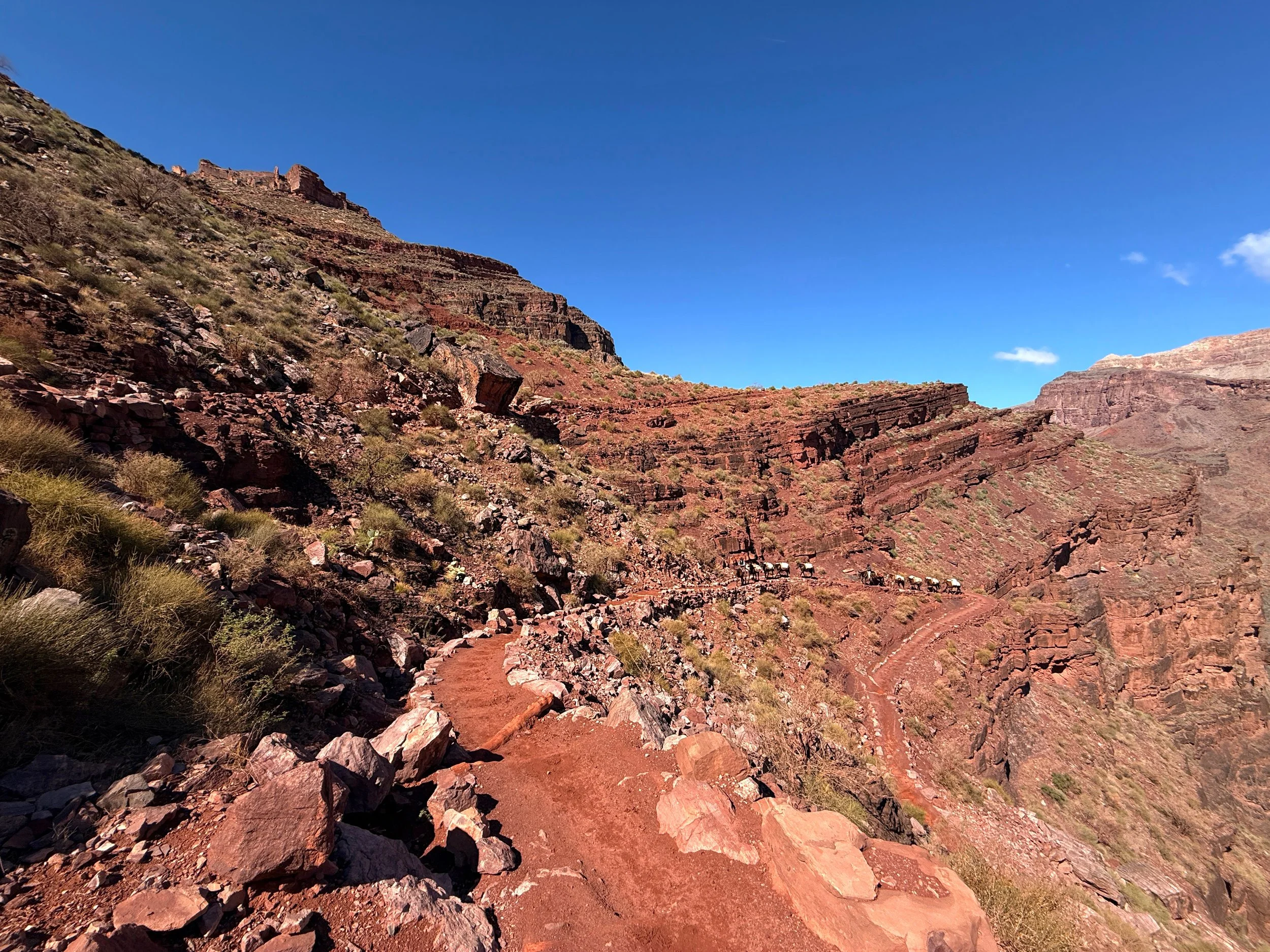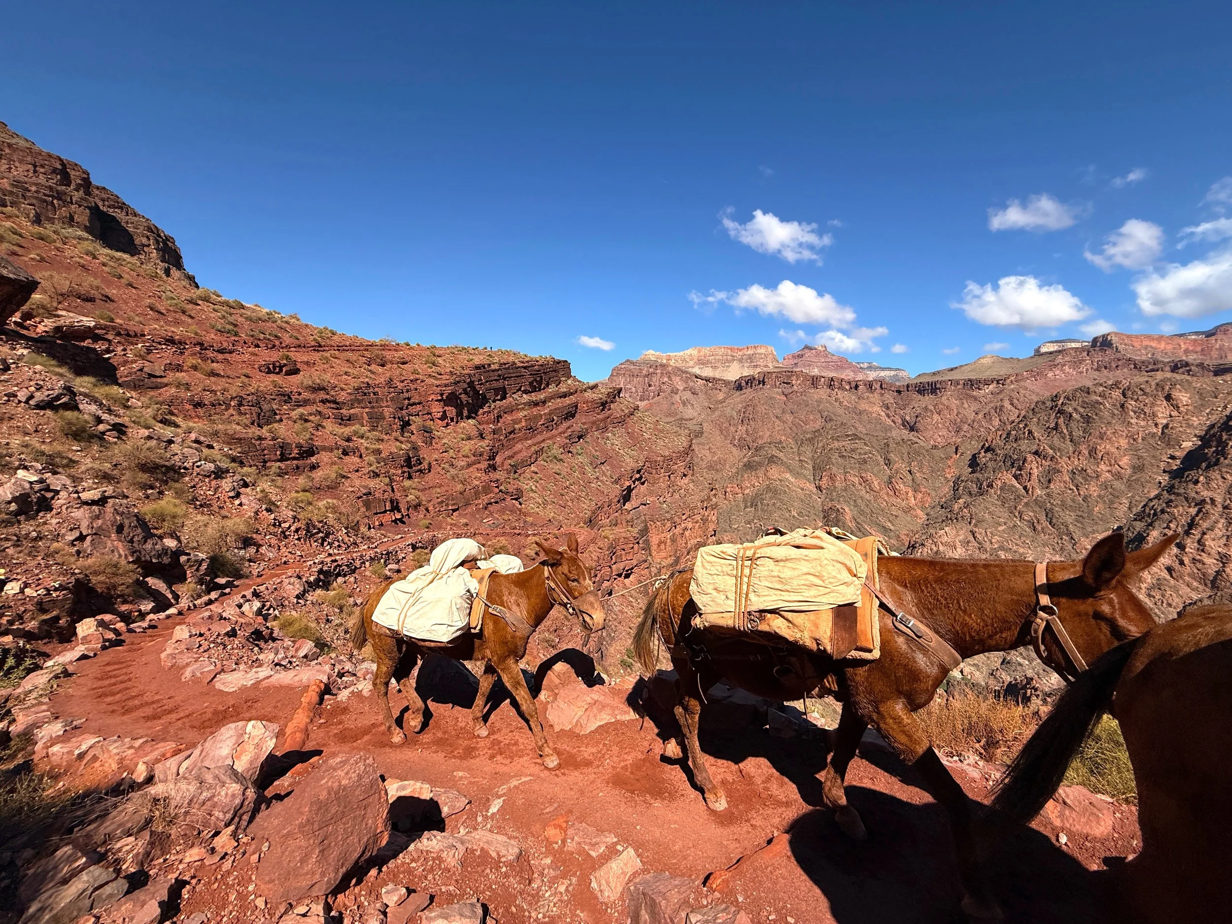 Mule teams on any of the three trails between Phantom Ranch and the canyon rim are fairly common to see, and in all of my experiences I’ve been told where to stand off to the side as they pass.