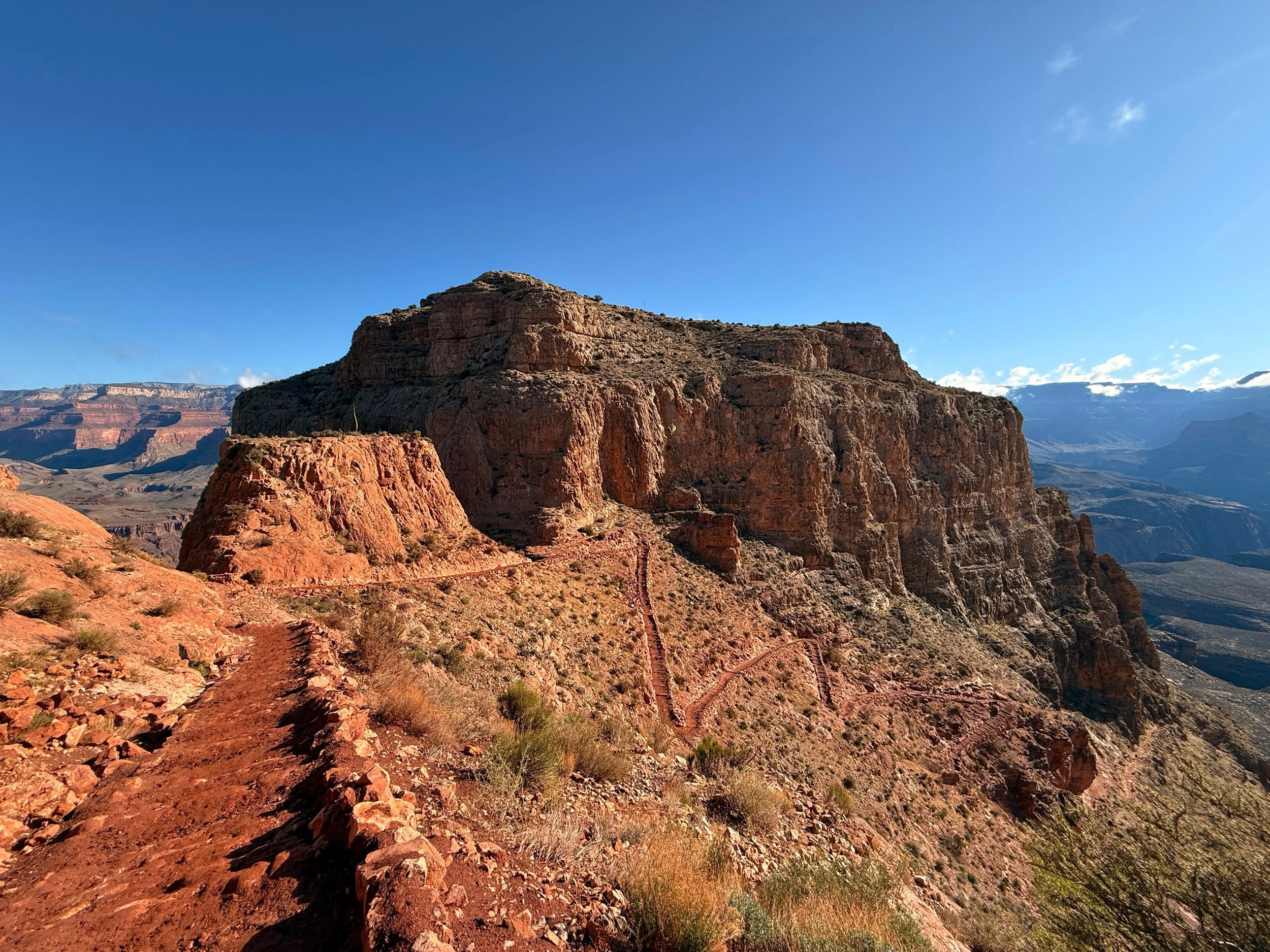 After rounding this corner, the South Kaibab–East Tonto junction (Tip-Off Point) becomes visible in the distance for the first time.