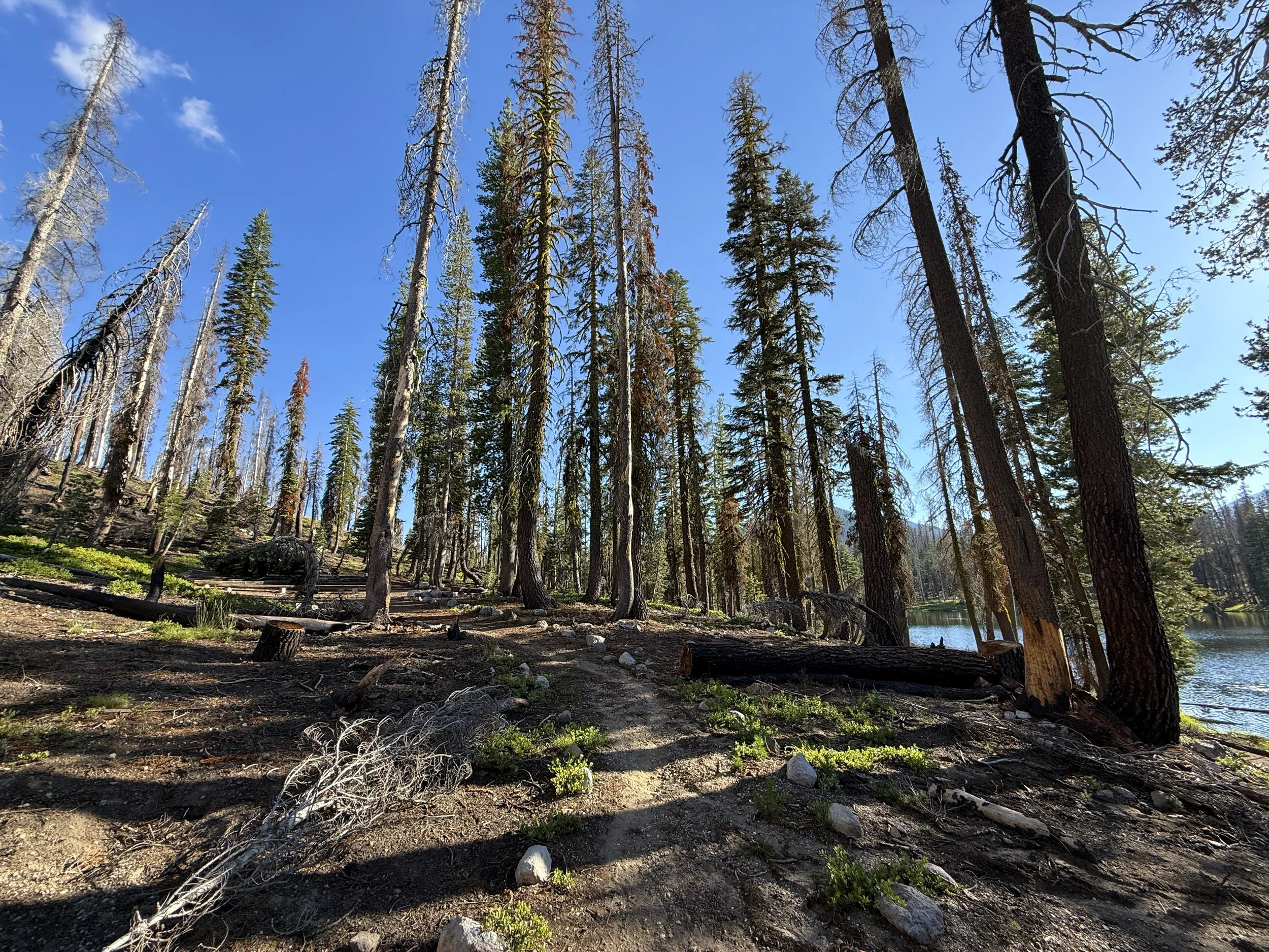 These photos at the beginning of the Summit Lake Trail reflect the remnants of the devastating 2021 Dixie Fire, taken several years after the actual fire.