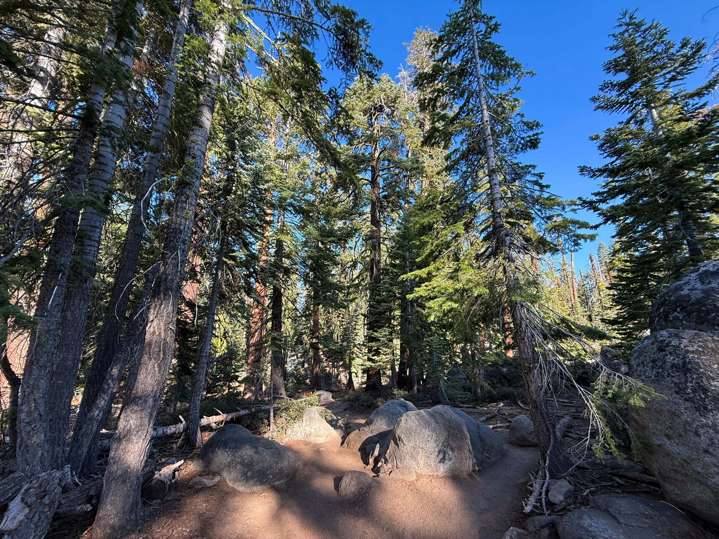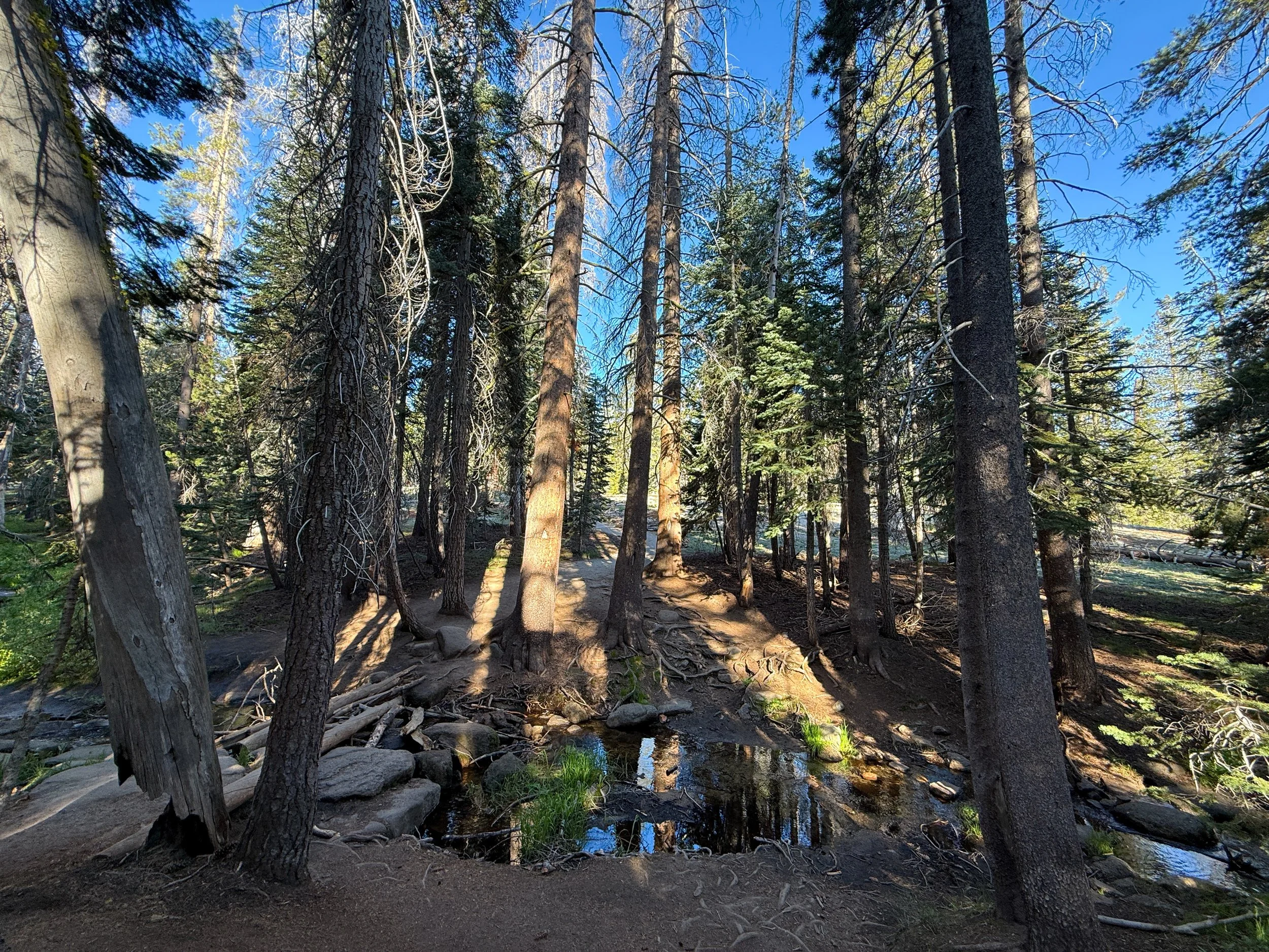 Immediately after the Sentinel Dome junction, the Taft Point Trail crosses Sentinel Creek, which can be tricky to cross when there is significant snowmelt flowing—unlike in this photo here.