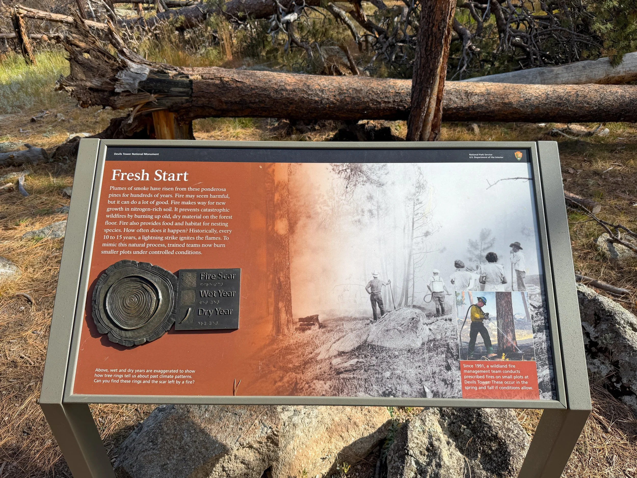 This split leads to the first viewpoint off the main Tower Loop Trail, which is a great place to see Devils Tower without being surrounded by the mixed Ponderosa-Aspen forest.