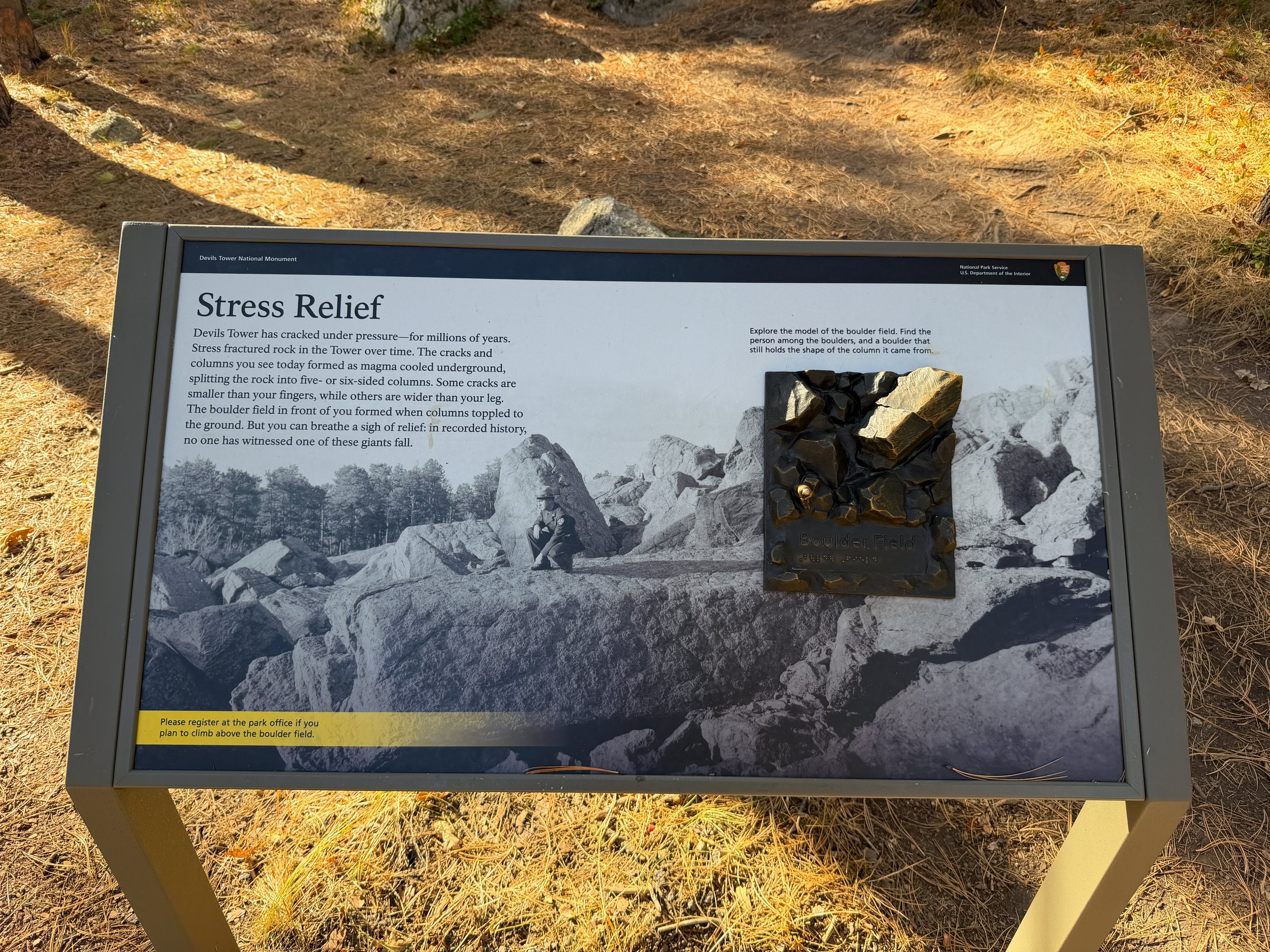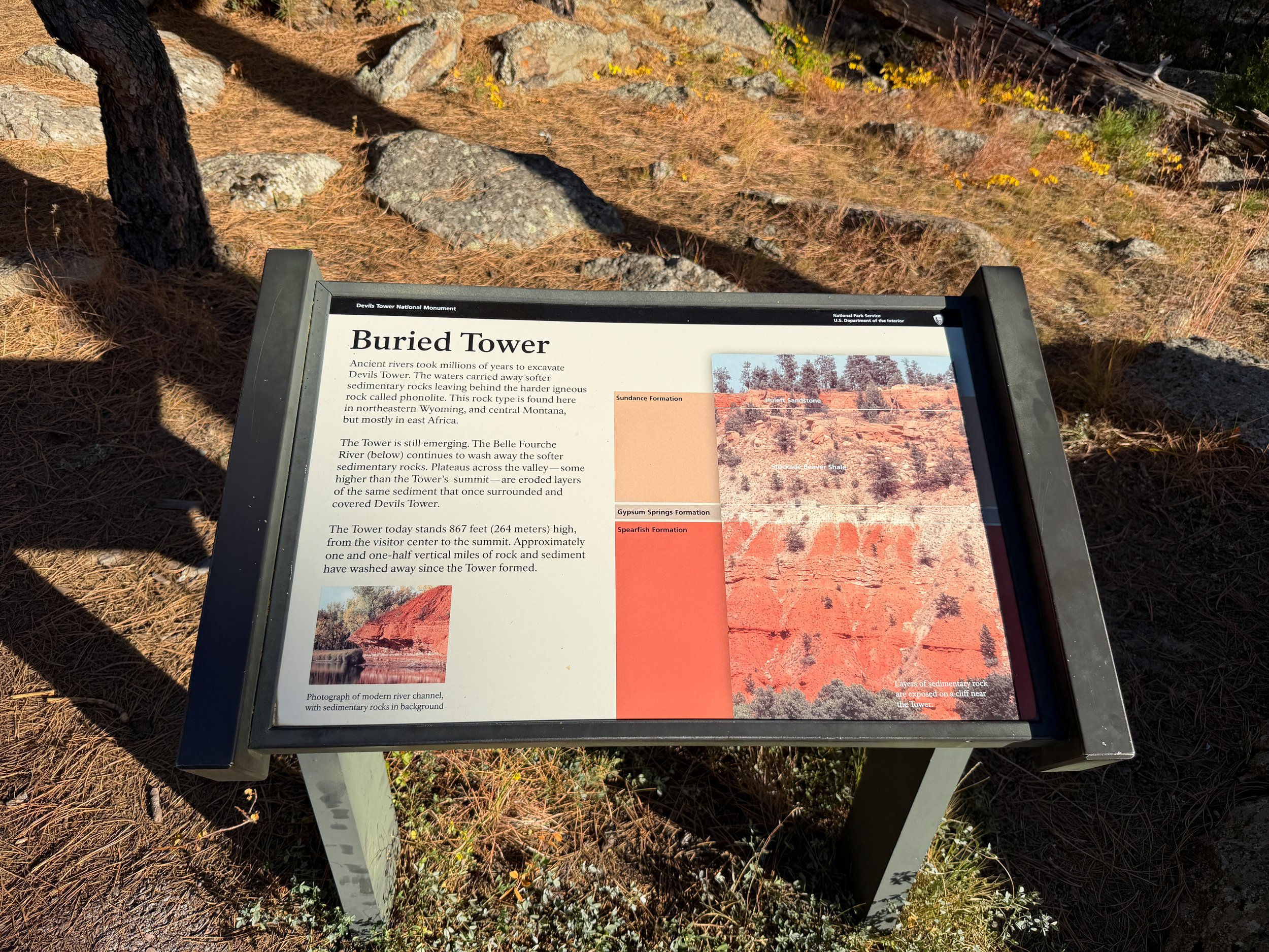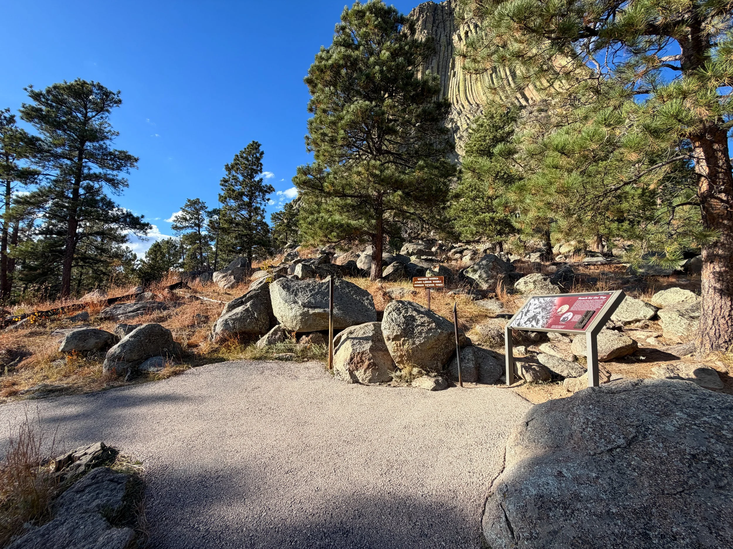 The halfway point is located along the eastern side of Devils Tower, and it means there is roughly 0.8 miles (1.3 km) left to return to the beginning of the loop.