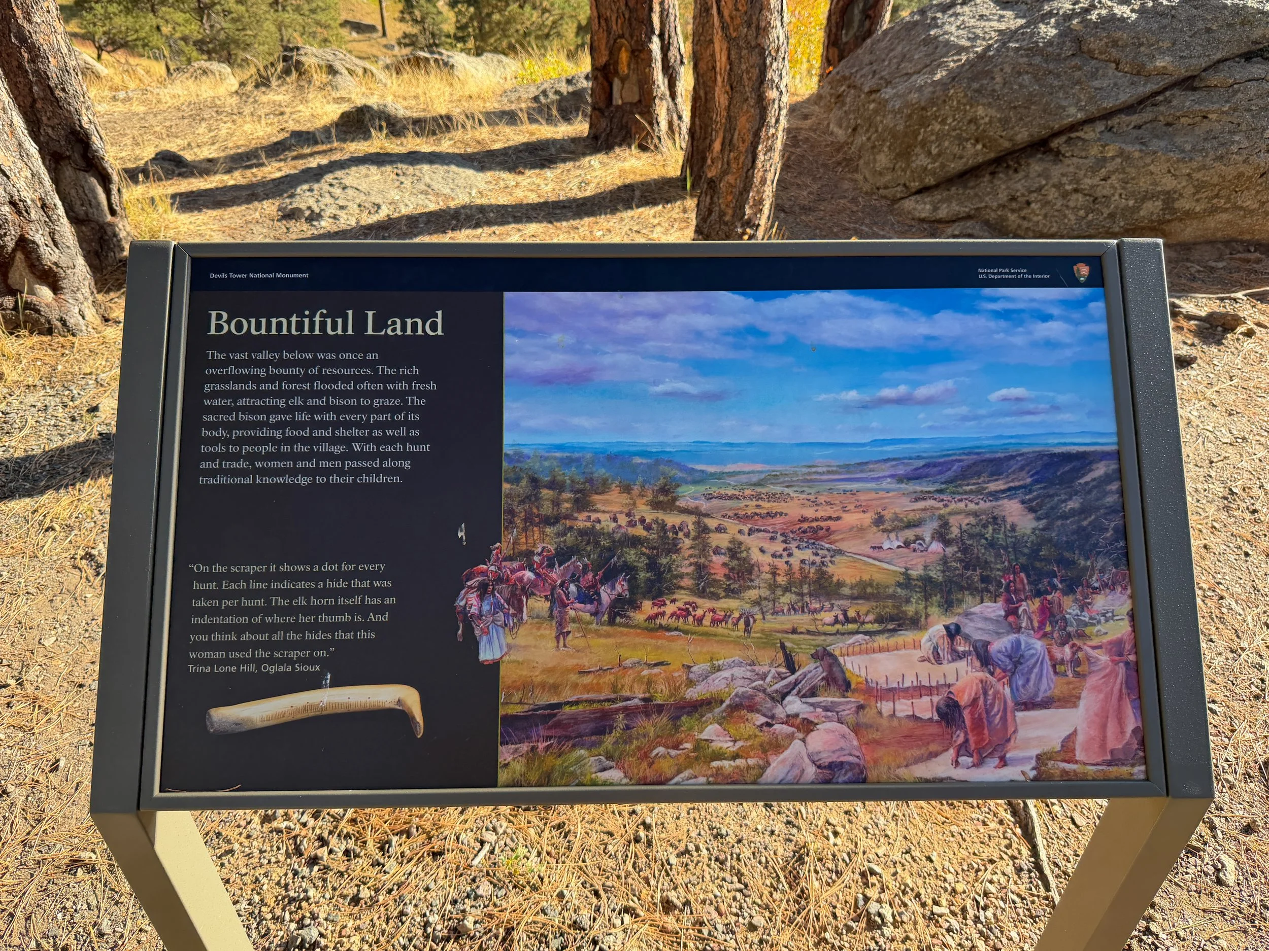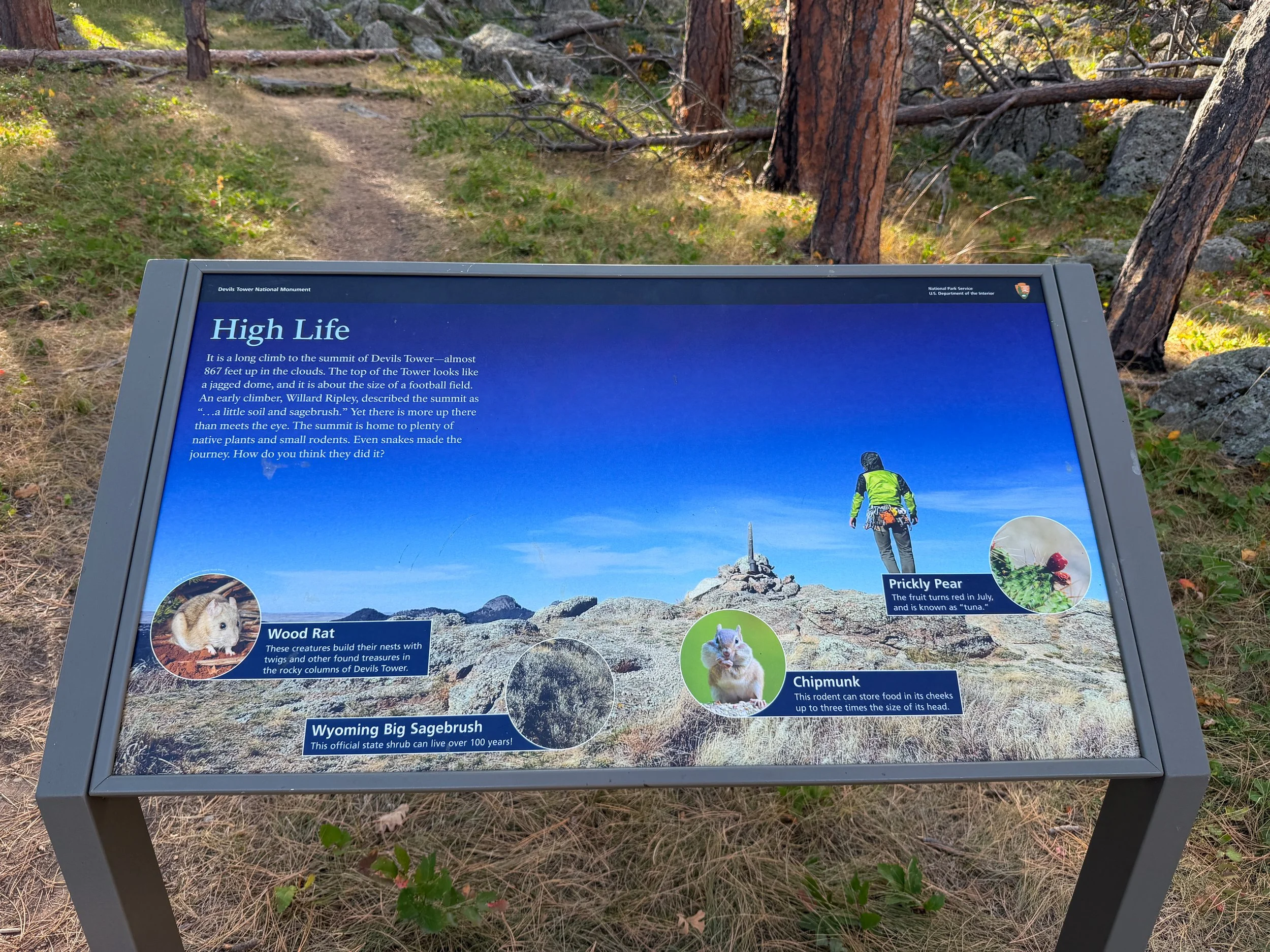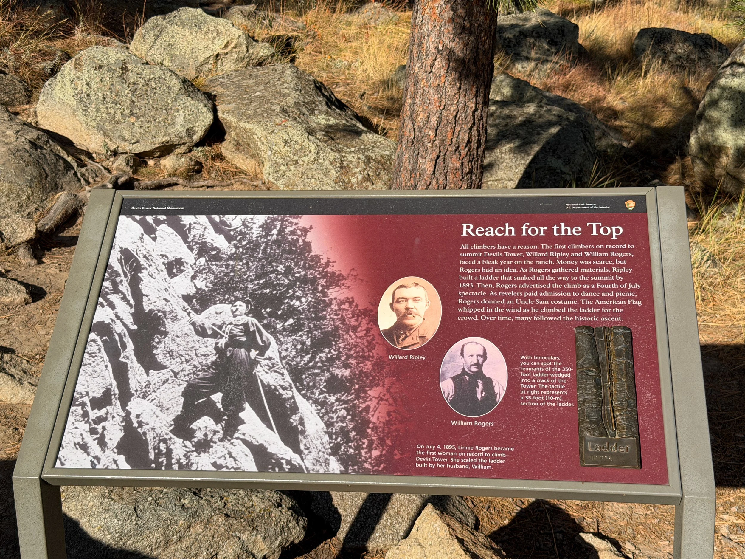 Almost immediately past the previous viewpoint, the Tower Trail passes another short side trail, where hikers can see and learn about what the first climbers did to reach the summit of Devils Tower before modern rock climbing became what we know it as today.