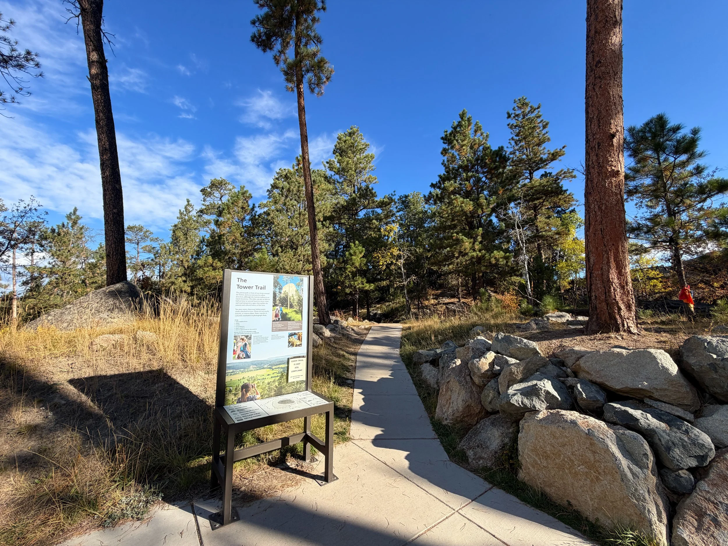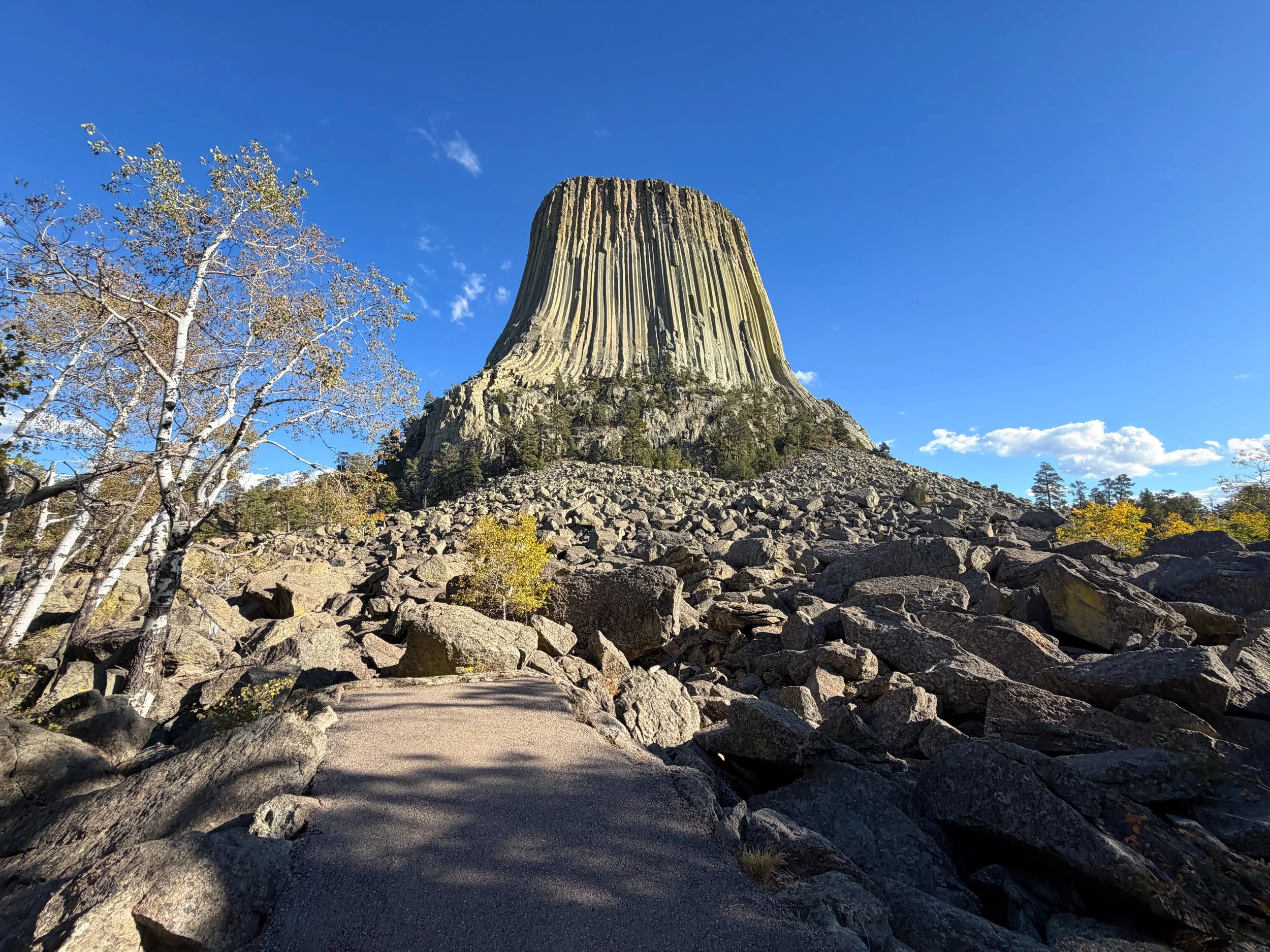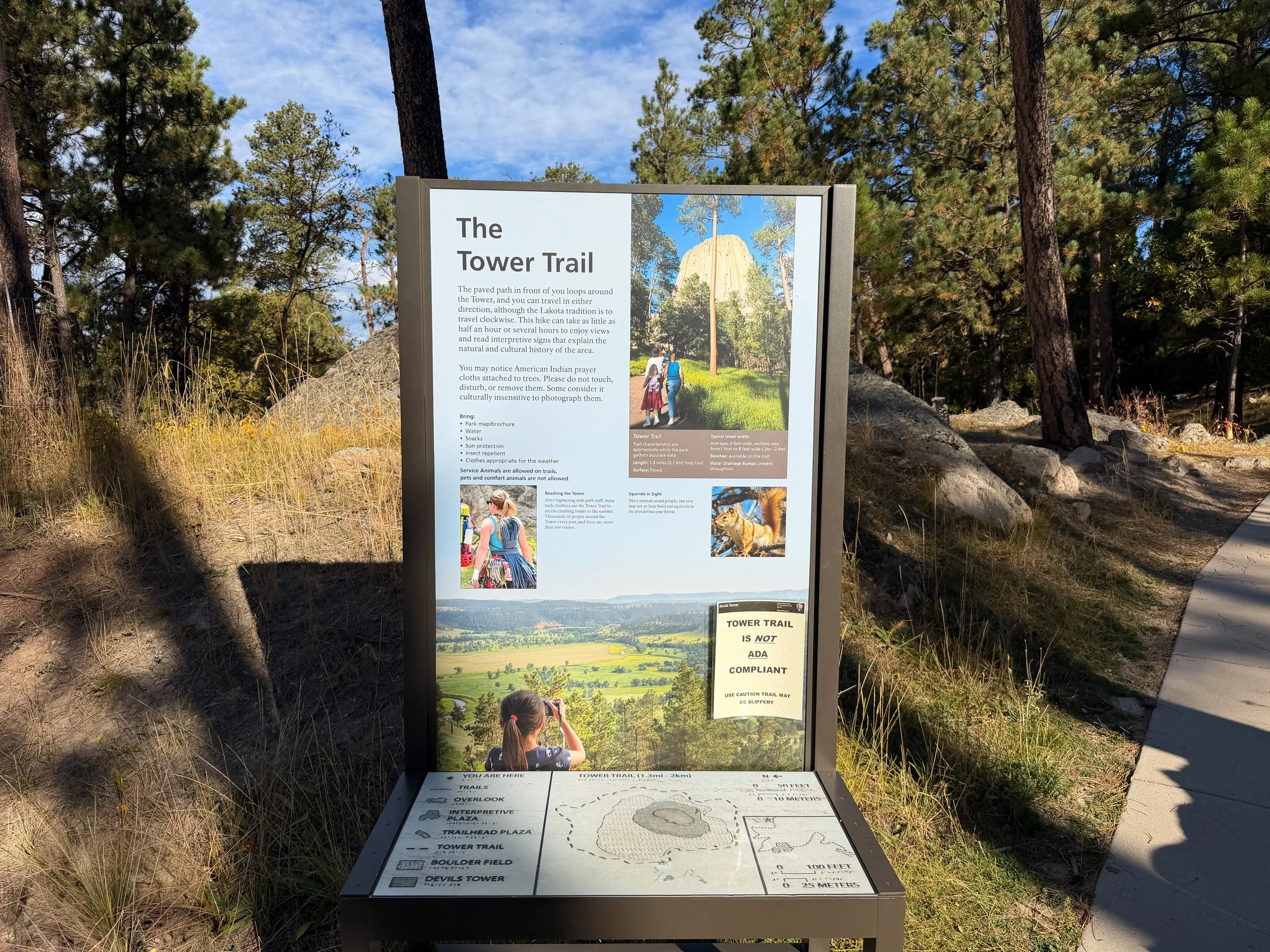 The Tower Trail, also called the Devils Tower Trail, in Devils Tower National Monument, is an easy, paved loop trail that circles the near-vertical rock formation, allowing visitors to see and appreciate Devils Tower from all angles—and, if you’re lucky, spot climbers making their way to the summit!