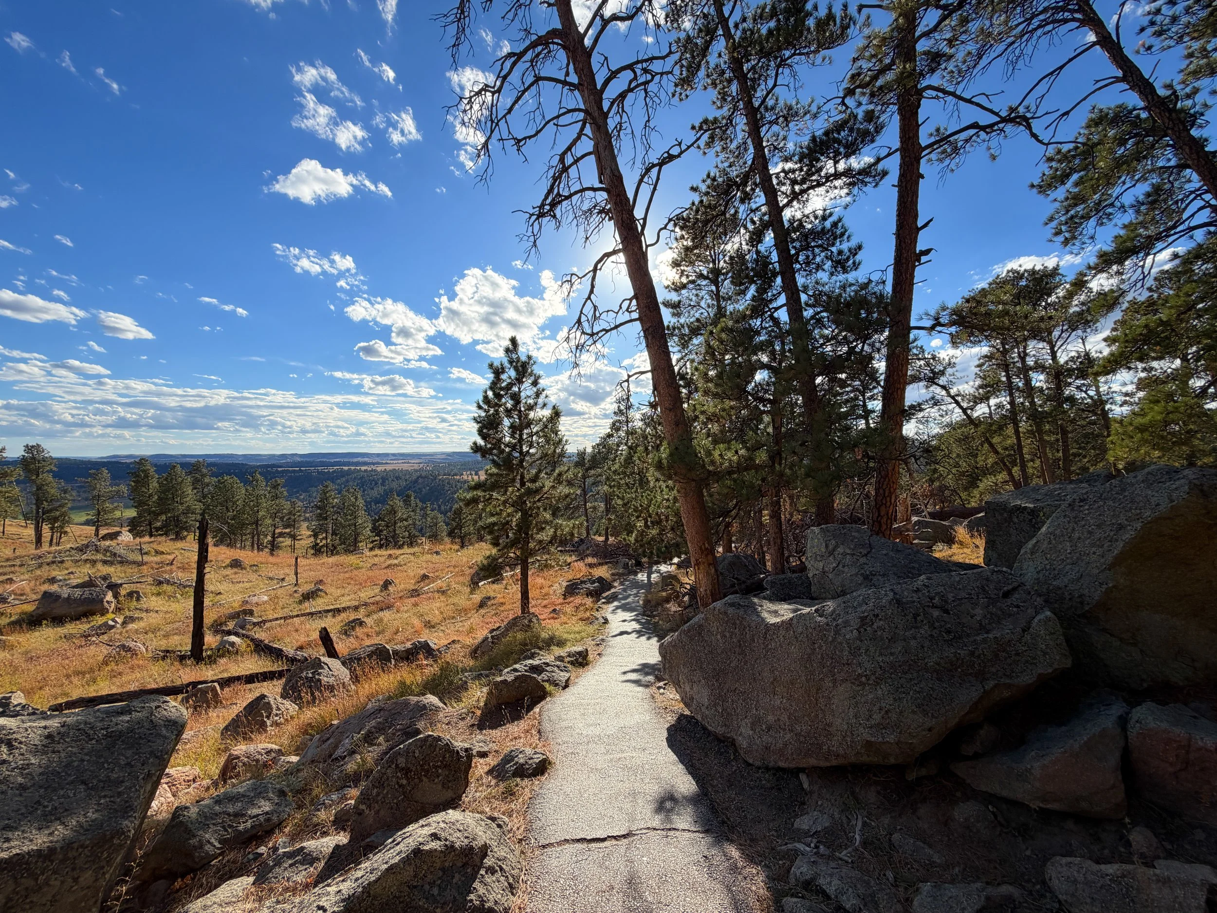 As the Devils Tower Trail makes its way back to the beginning, hikers can see great views looking southeast toward the Black Hills in South Dakota.