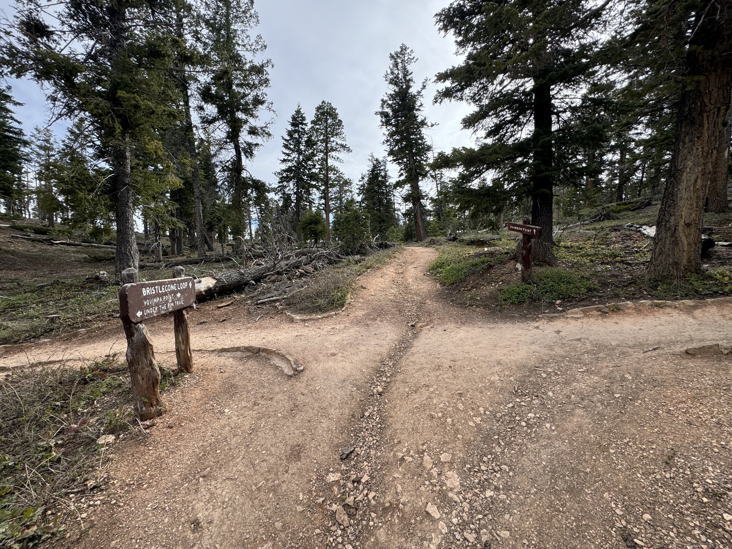 Finally, continue straight (right) at the last junction—the initial split for the Bristlecone Loop Trail—and the parking lot for Rainbow Point will be found shortly ahead.