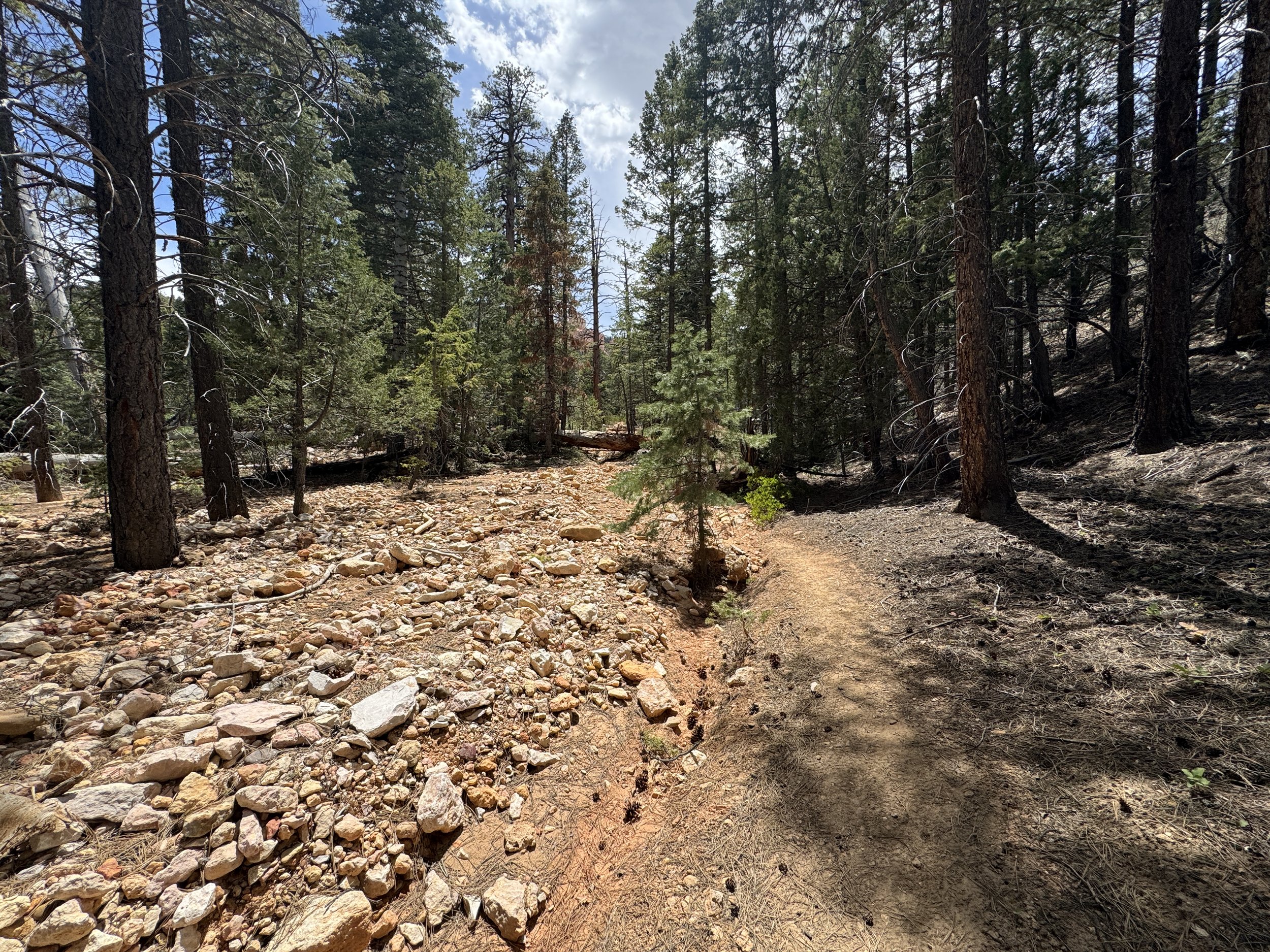 Once at the bottom of Bryce Canyon, the Under-the-Rim Trail begins to parallel the Right Fork of the Yellow Creek until it crosses over, just after the campsite.