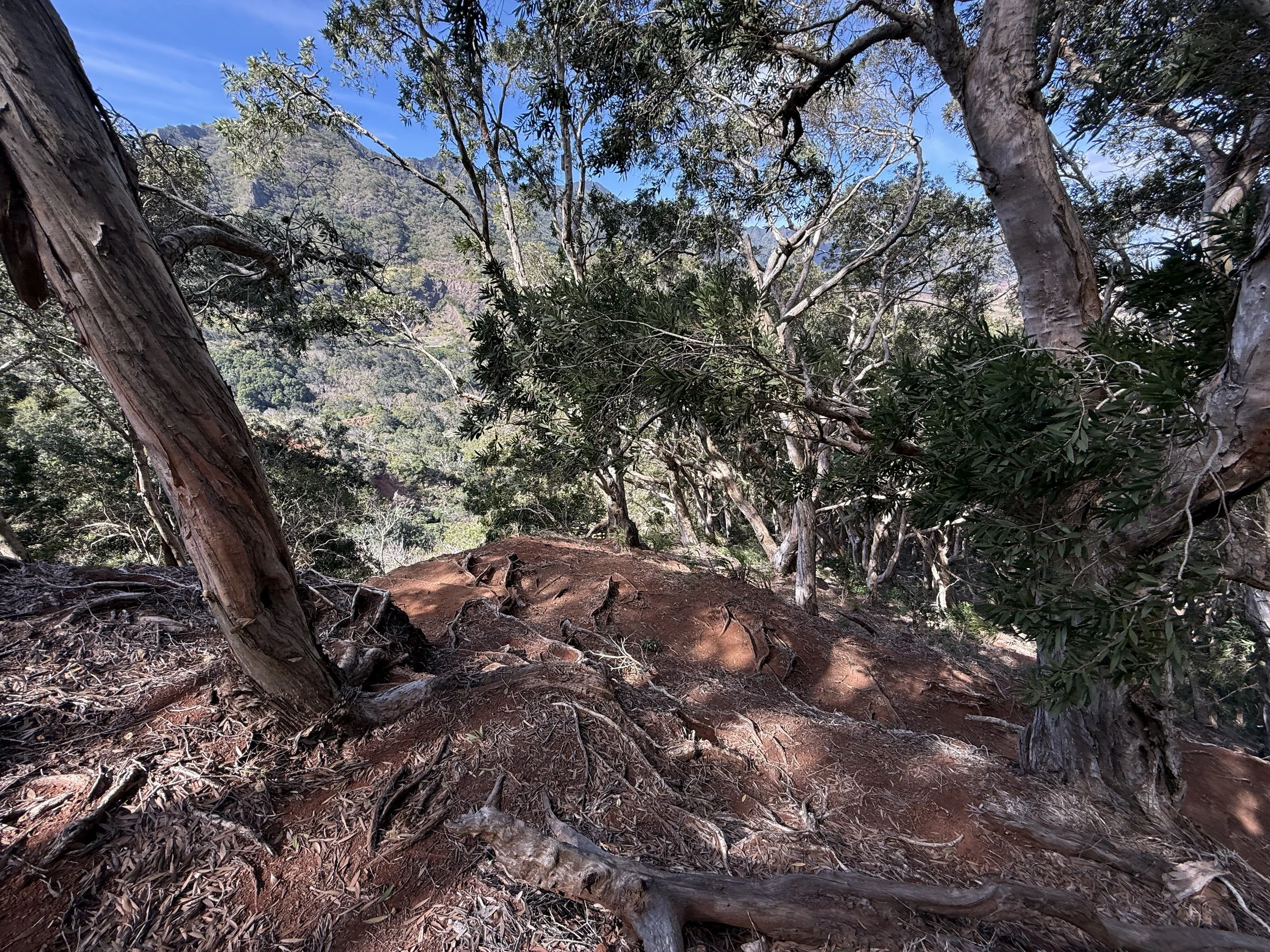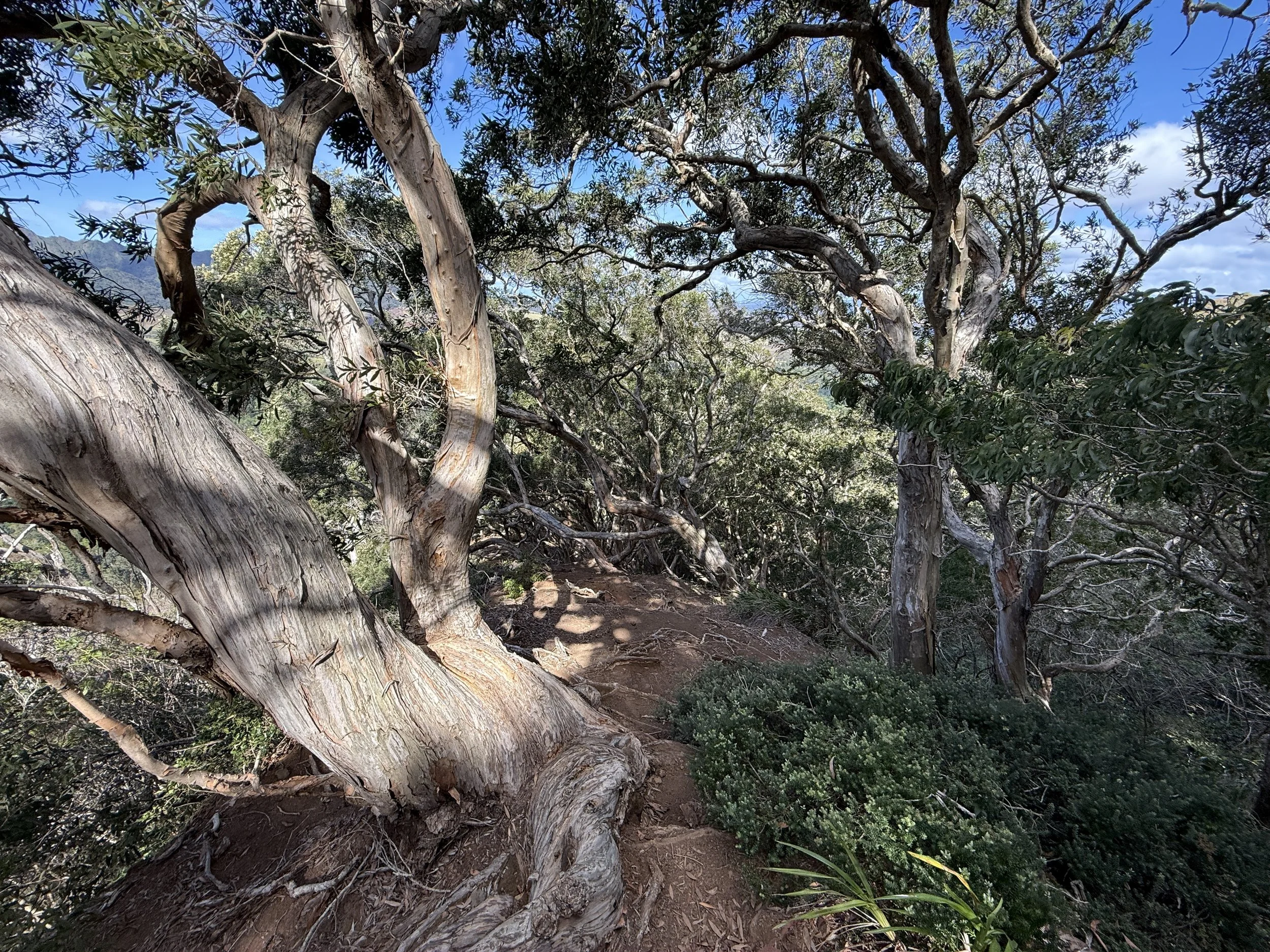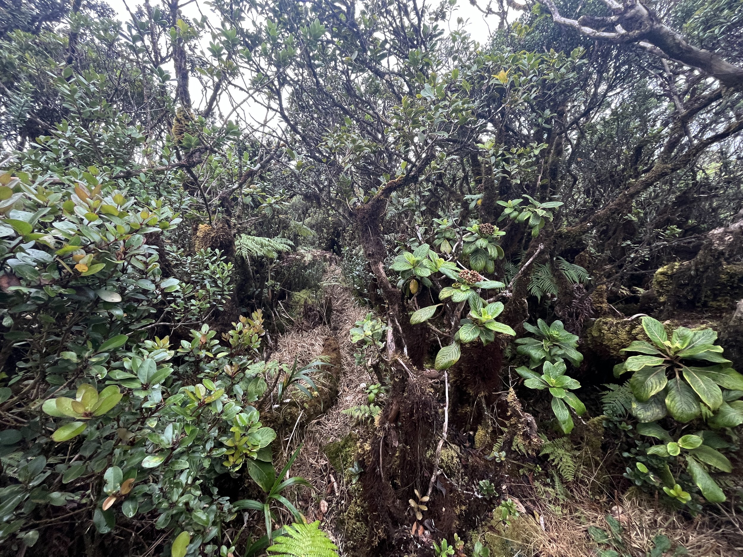 By this, I mean that the WST is covered in invasive Christmas Berry, which is much woodier than Uluhe, making it much more annoying and slow to walk through. On top of that, we spent this entire section hunched over just to take the easiest path through it because the overgrowth gives you no places to stand up comfortably.