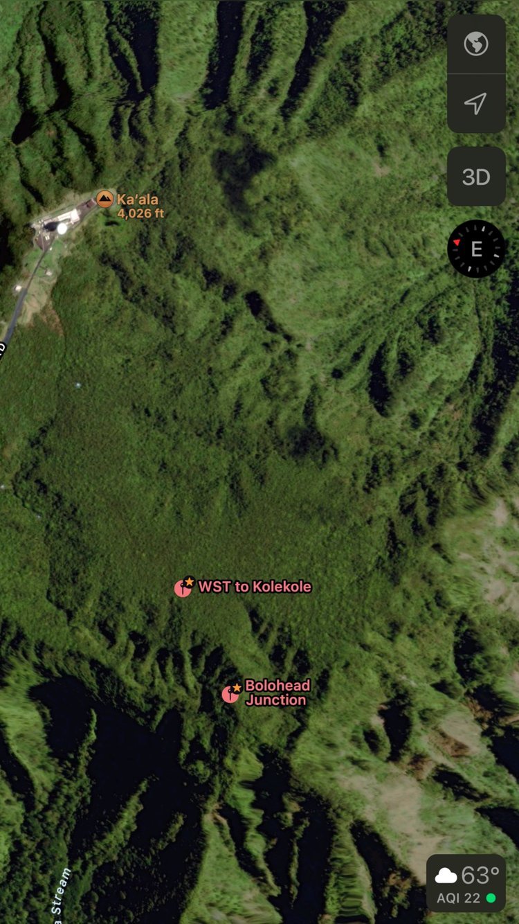 After Kūmakaliʻi, the WST begins to drop steeply down toward Kolekole, but keep an eye out for a sharp right turn that is above Kolekole, leading off the main ridge. I believe that continuing straight on the ridge would cliff out, and you would have to hike back up to find the correct turn. In my experience, this turn should be marked with ribbons.