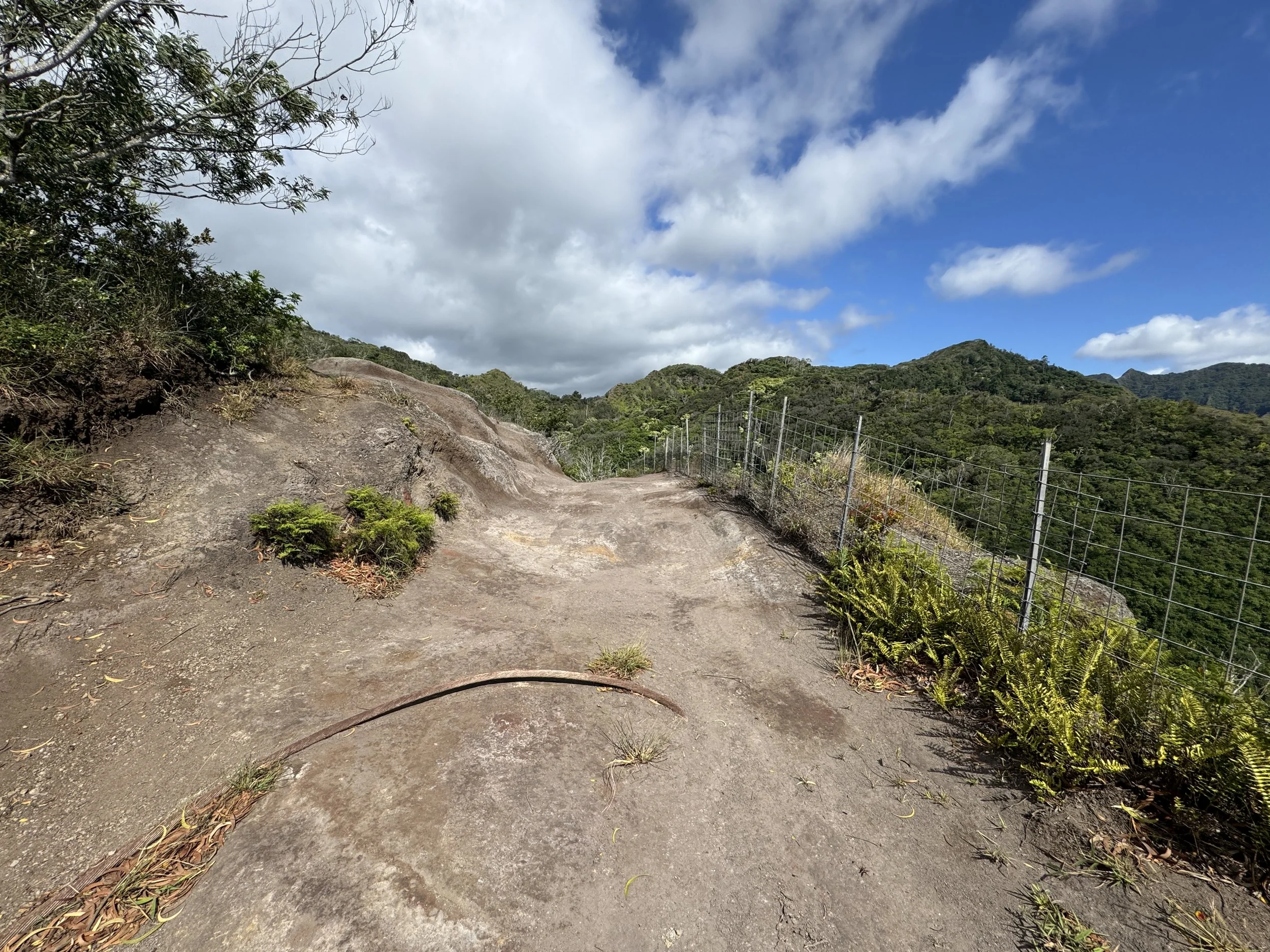 From Puʻu Kaua to Kolekole, the only other true obstacles on the hike are the Gorilla Heads and this awkward 'nipple,' where you will vertically climb the fence like a ladder to get up and down on the far side.
