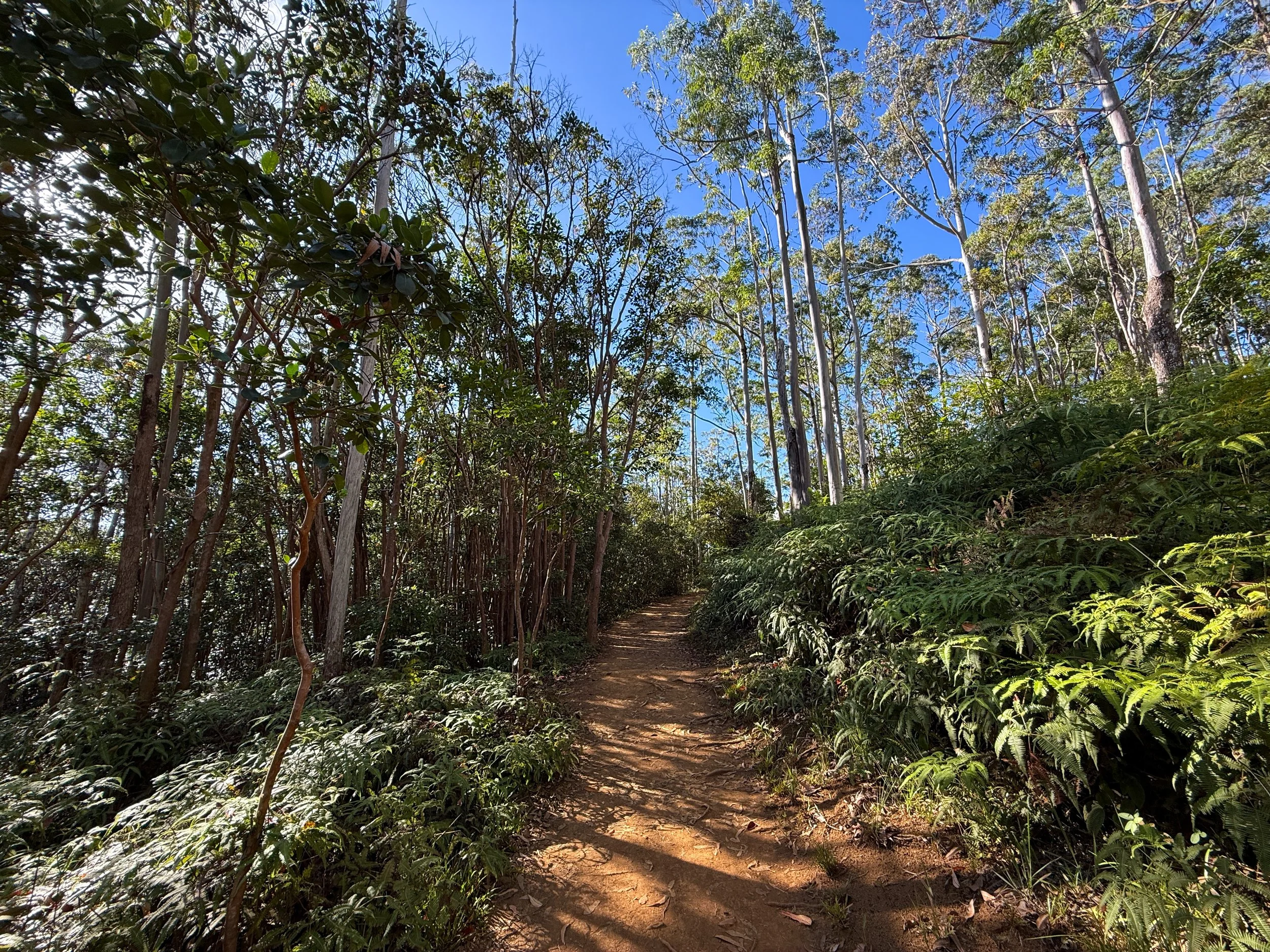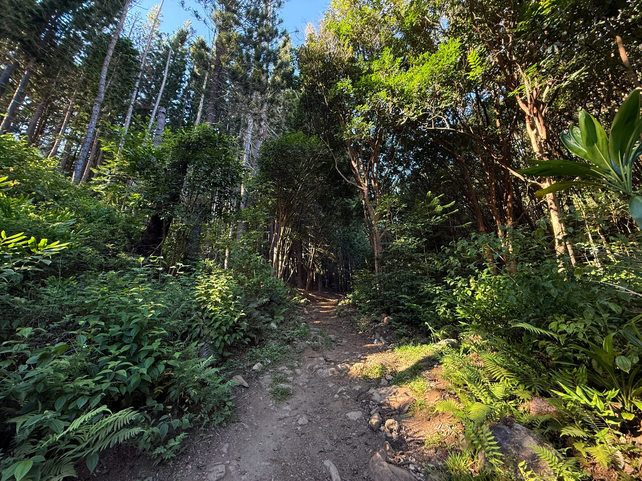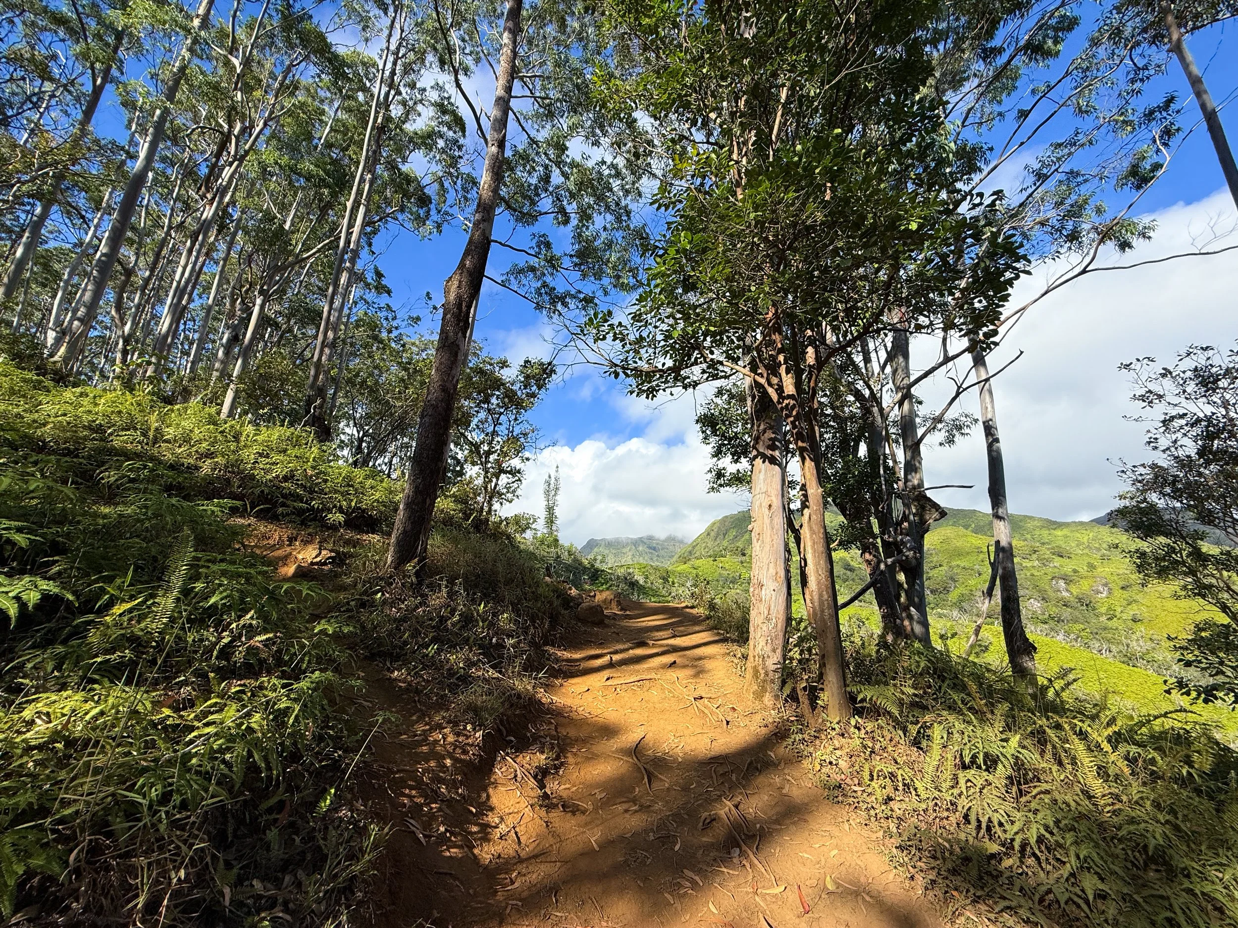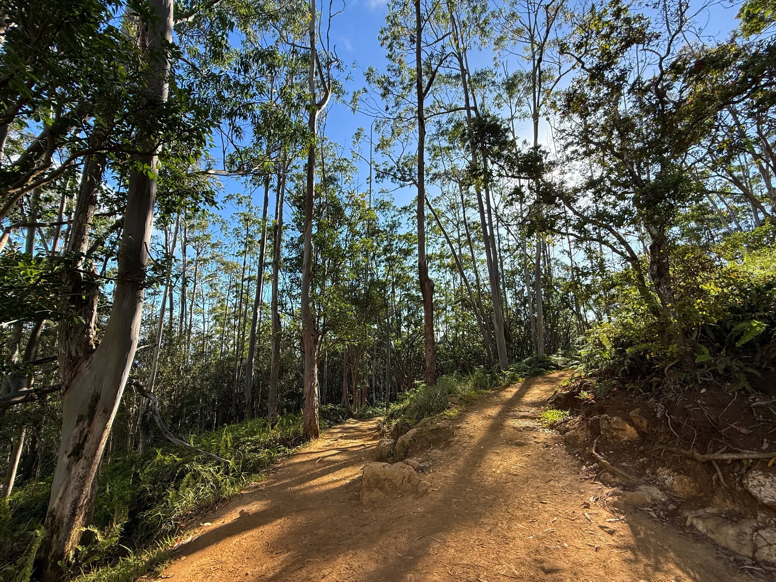 After the fence, the Waiheʻe Ridge Trail winds its way through a mixed Cook Pine–Eucalyptus—Strawberry Guava forest as it climbs above the lower canopy.