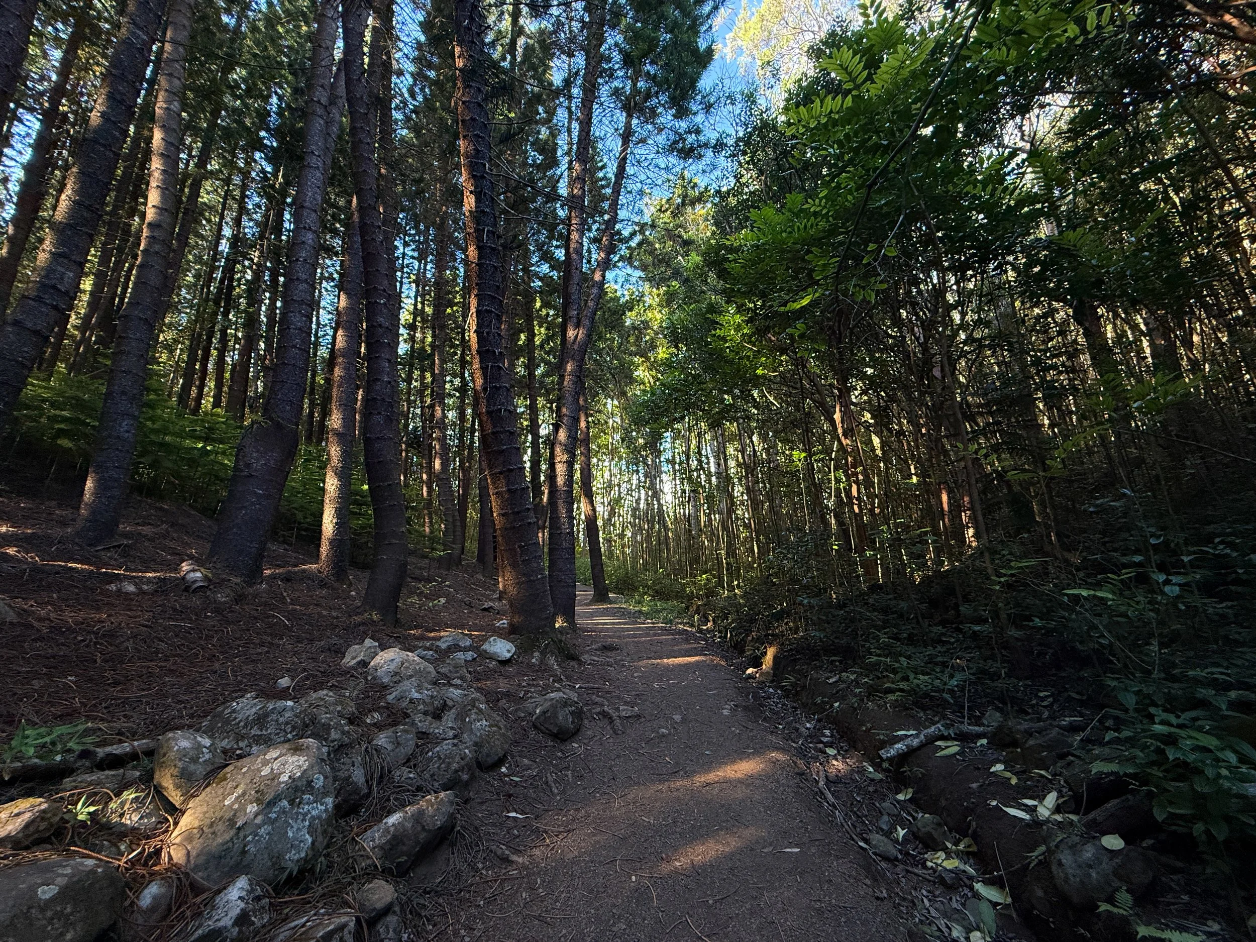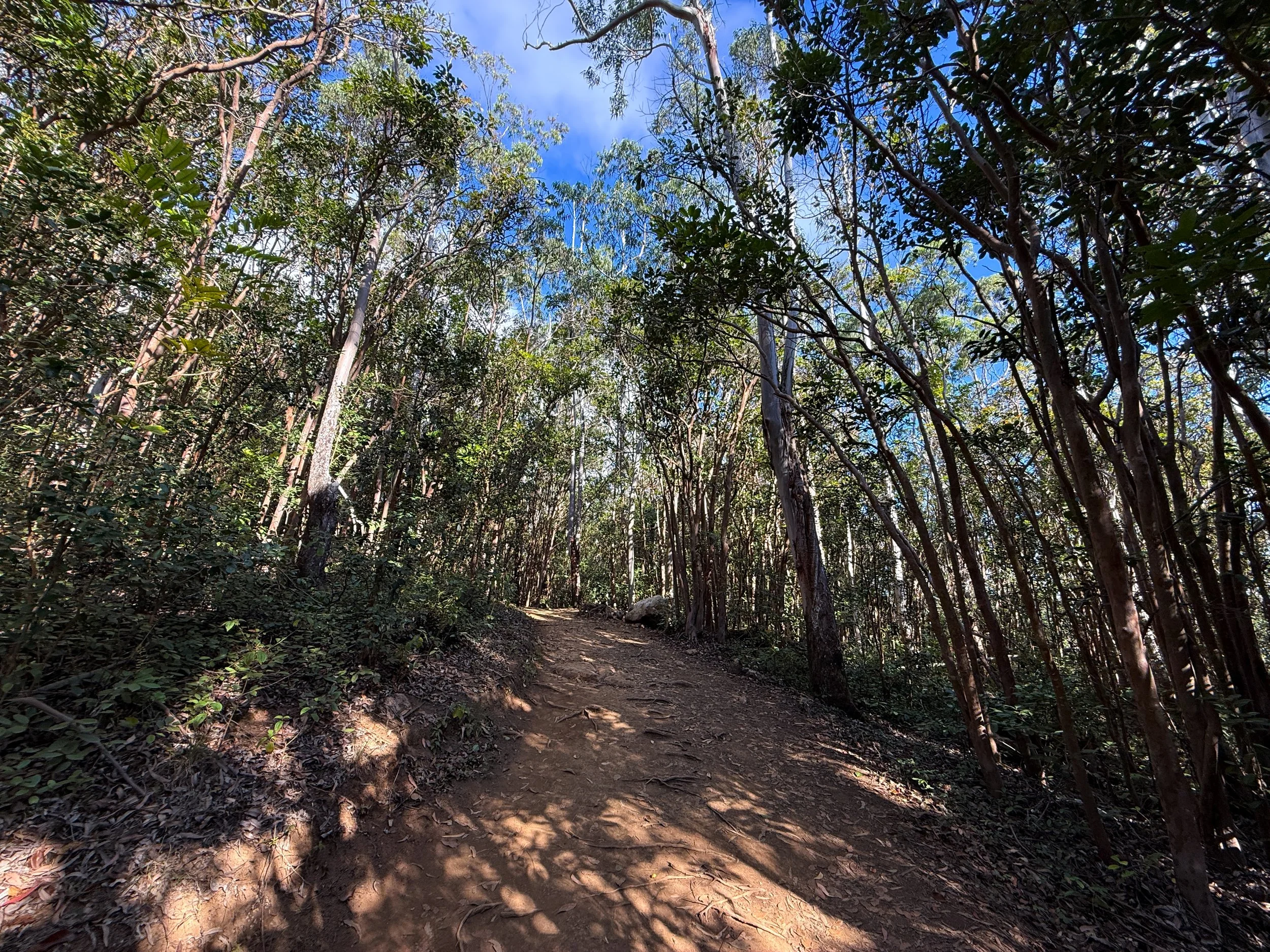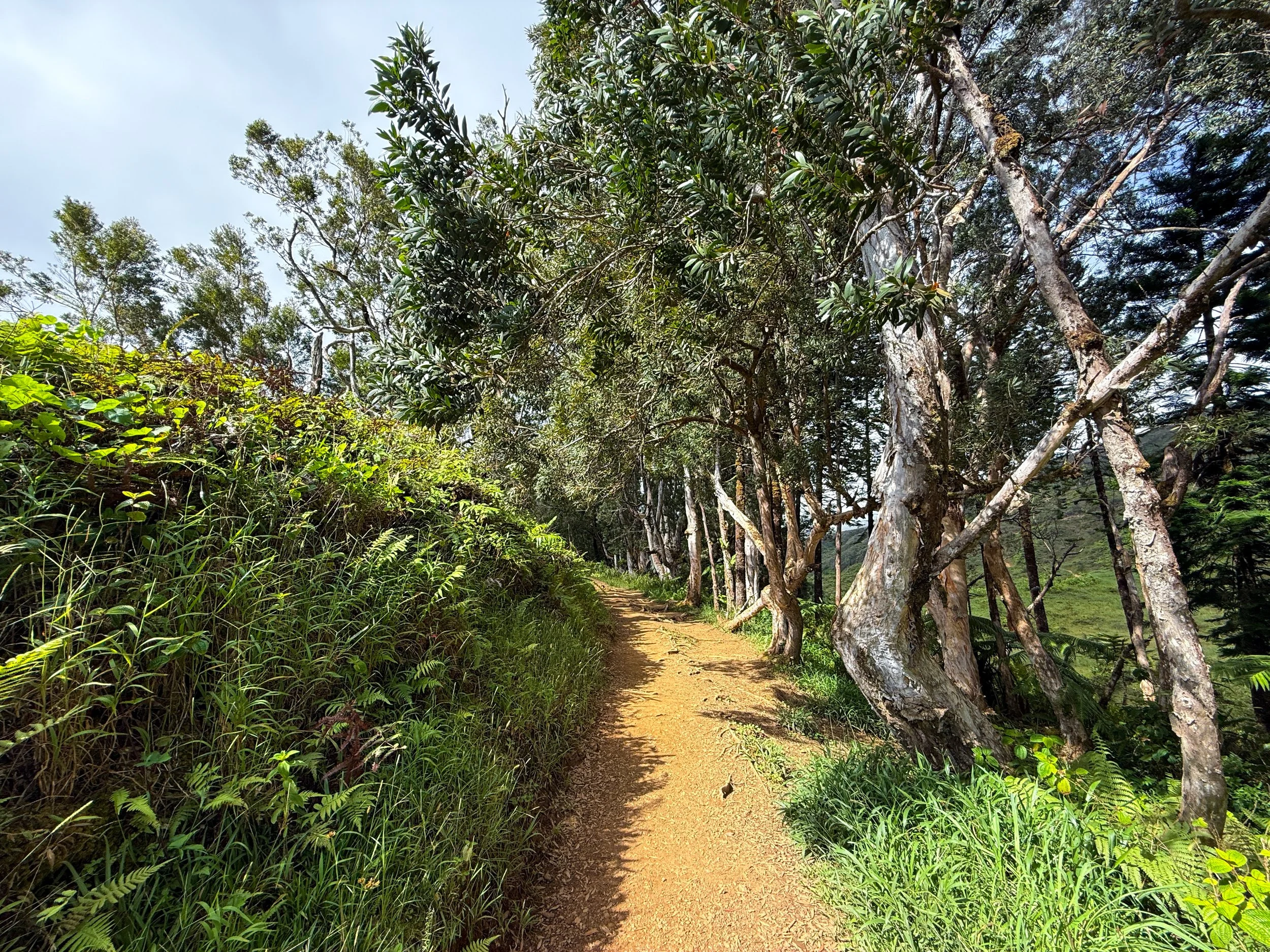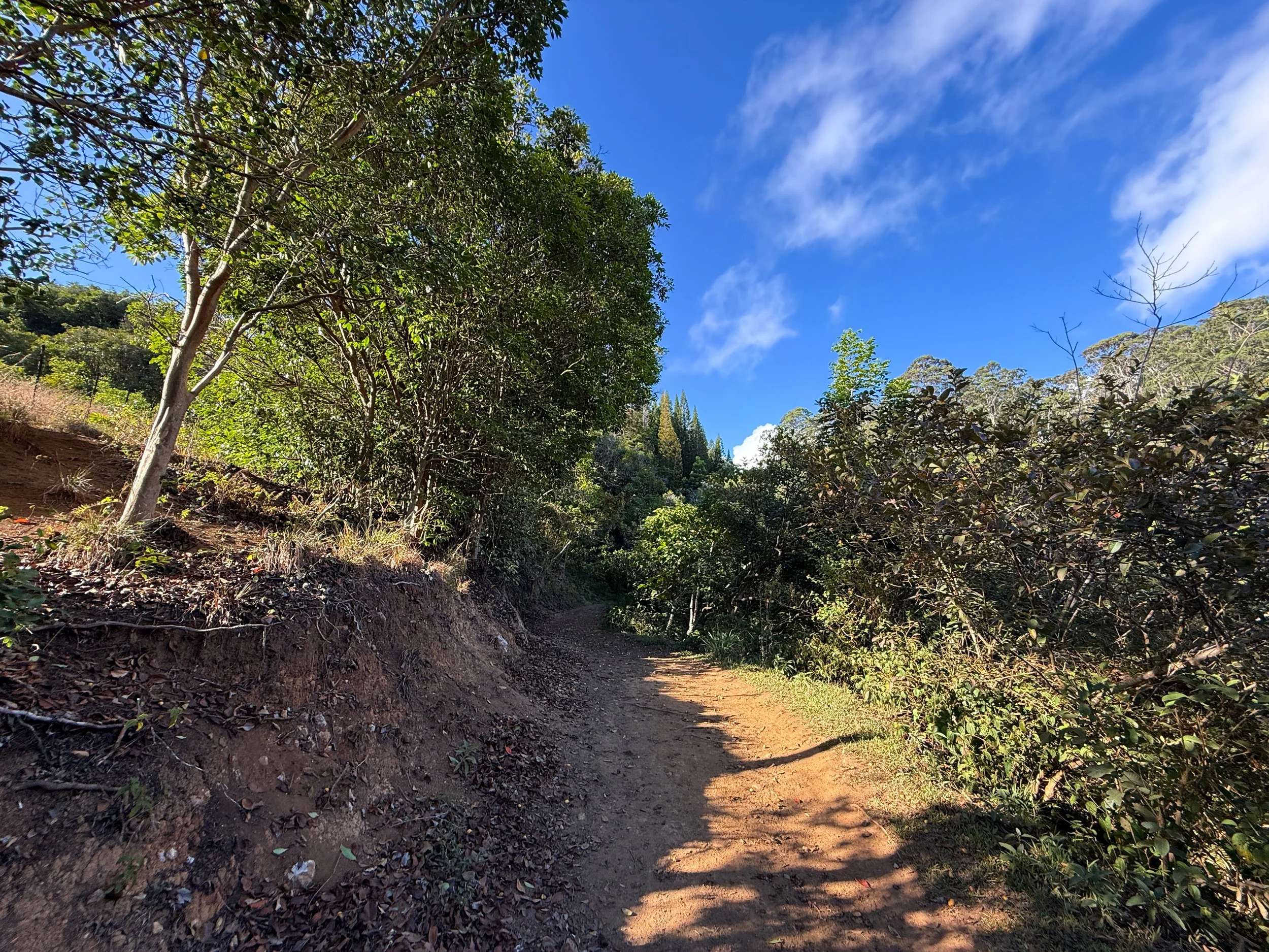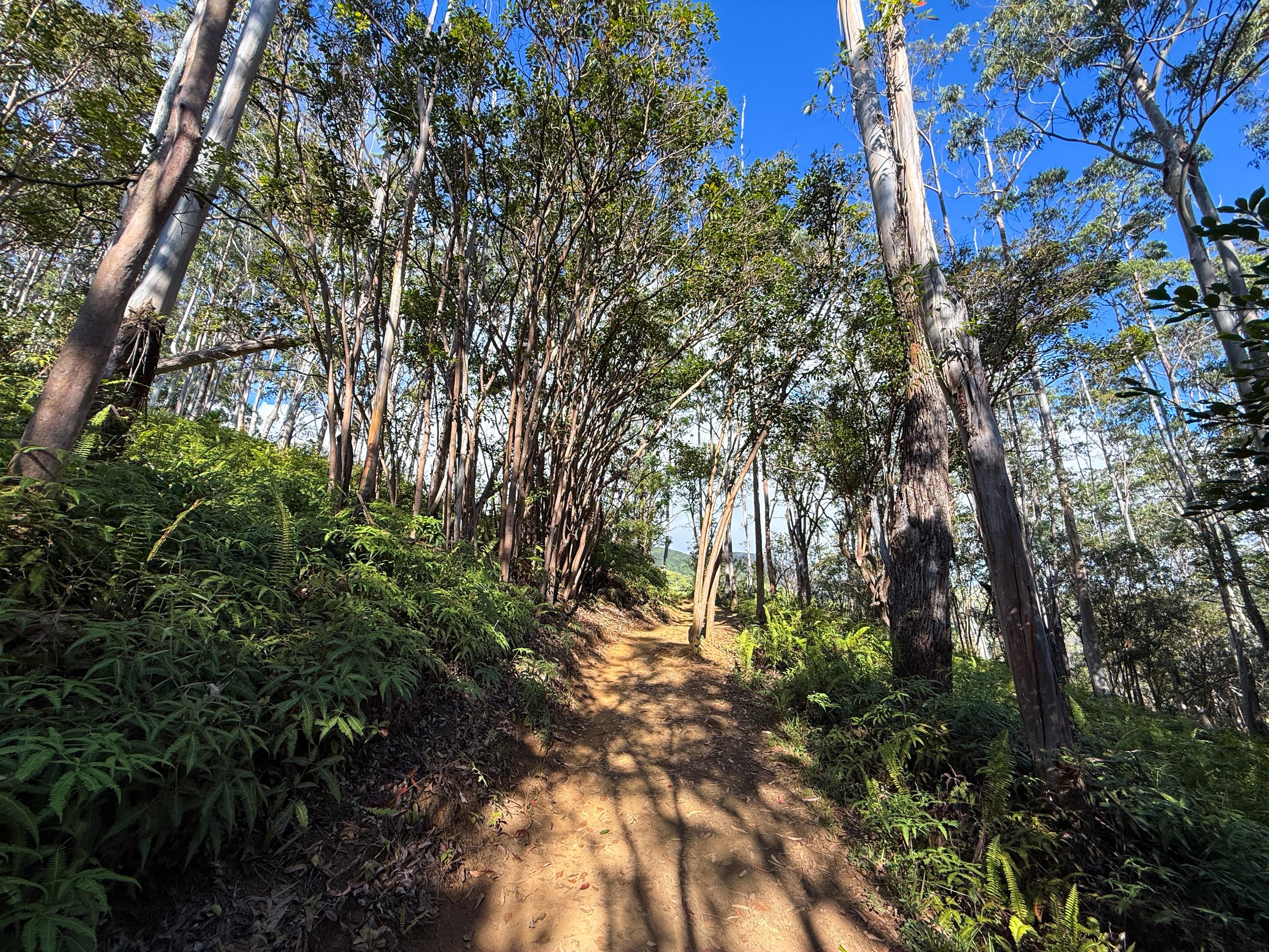 After the fence, the Waiheʻe Ridge Trail winds its way through a mixed Cook Pine–Eucalyptus—Strawberry Guava forest as it climbs above the lower canopy.