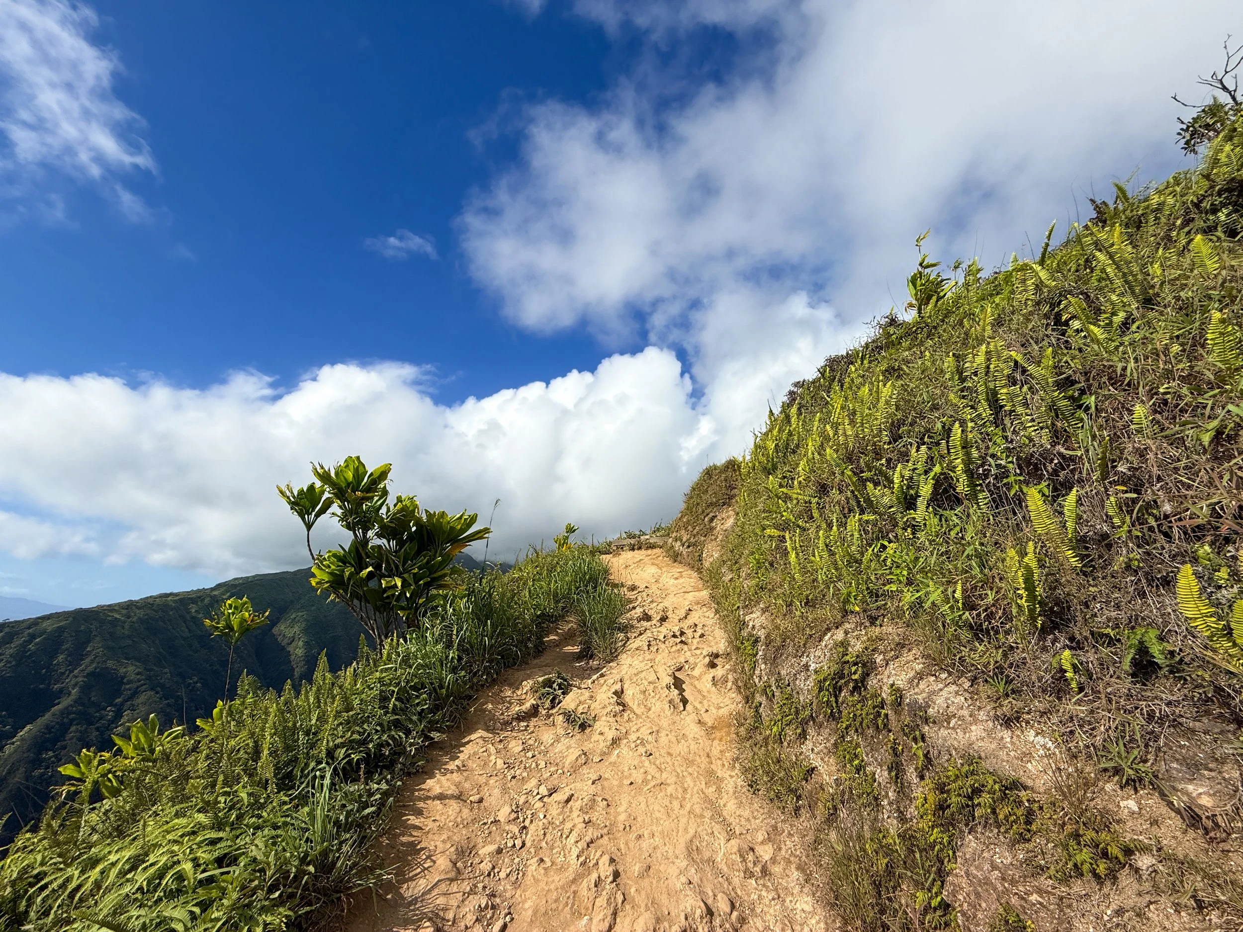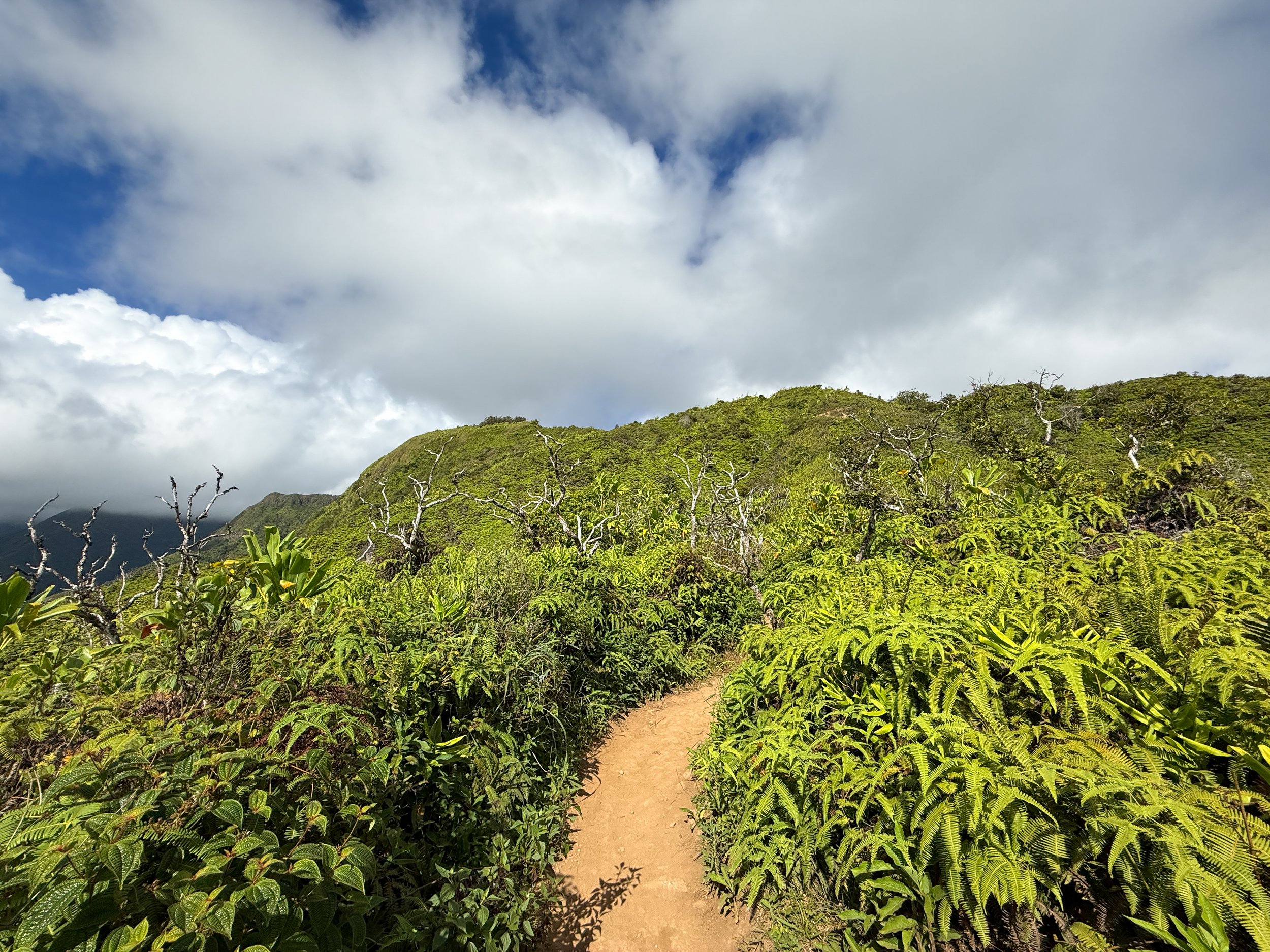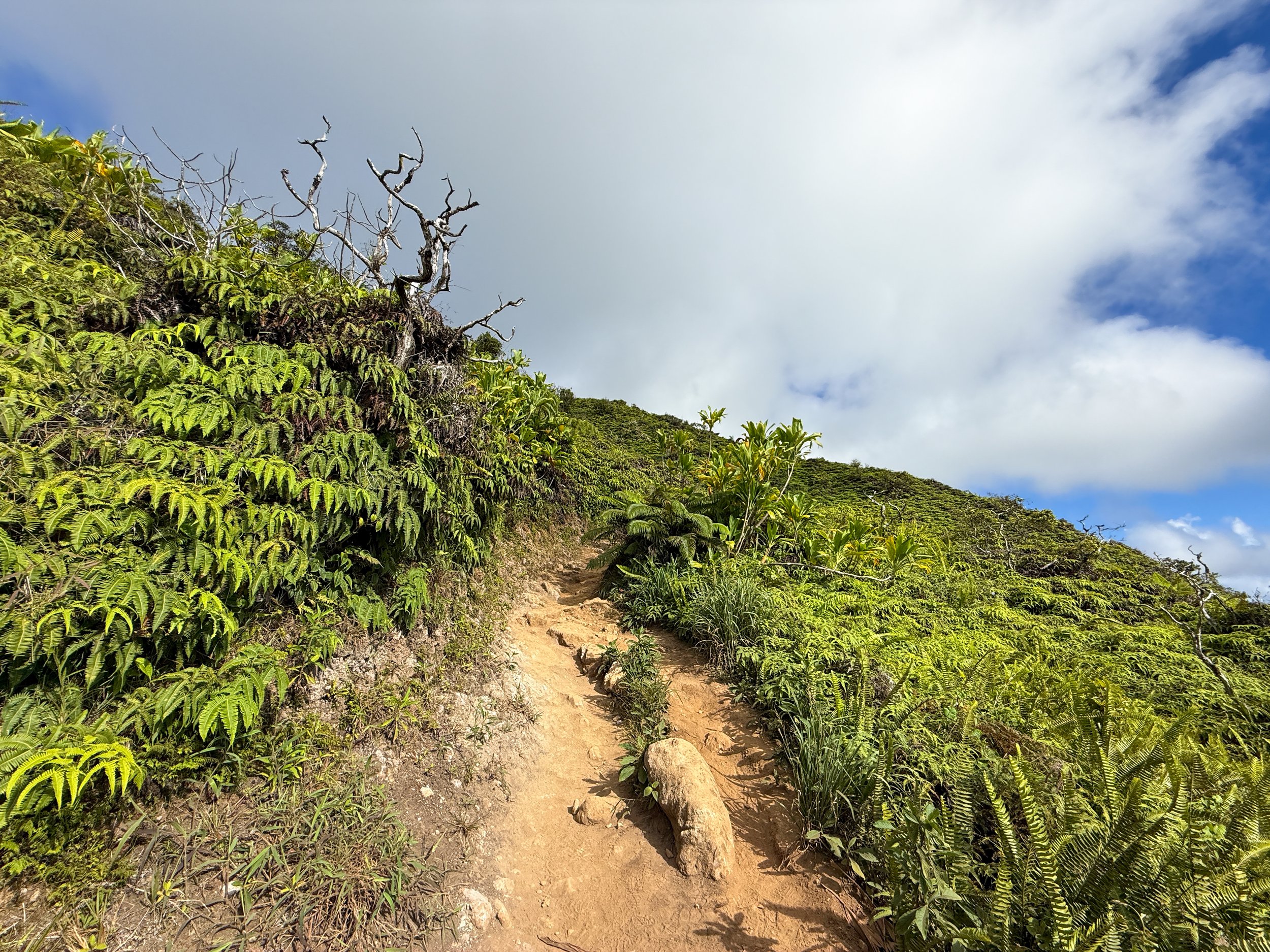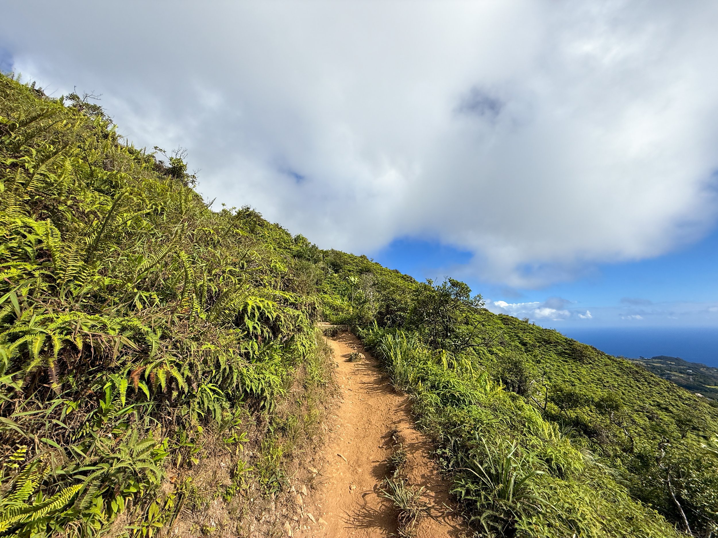 After the Waiheʻe Valley Overlook, the Waiheʻe Ridge Trail follows a slightly flatter section for the next 0.2 miles (0.3 km).