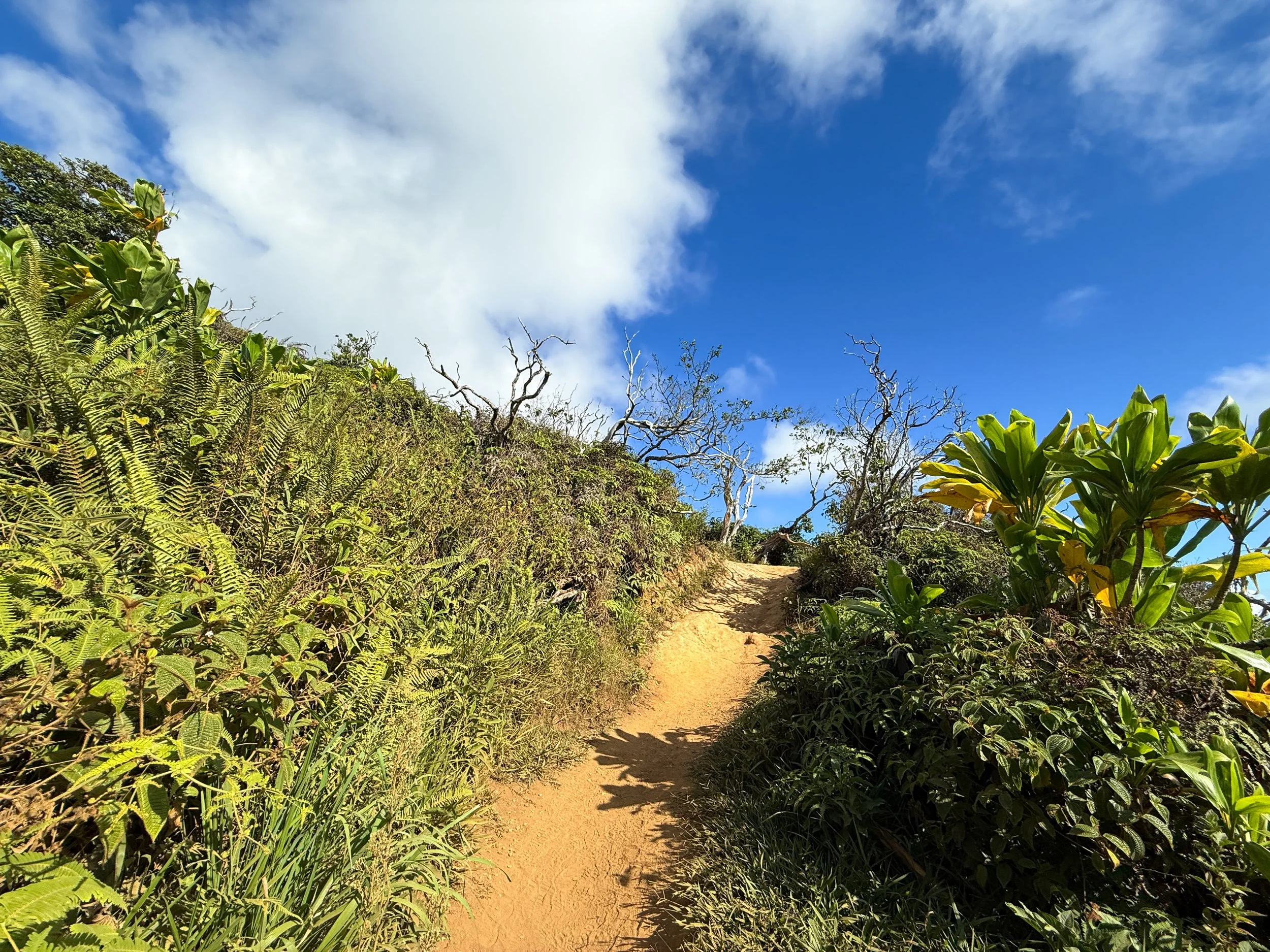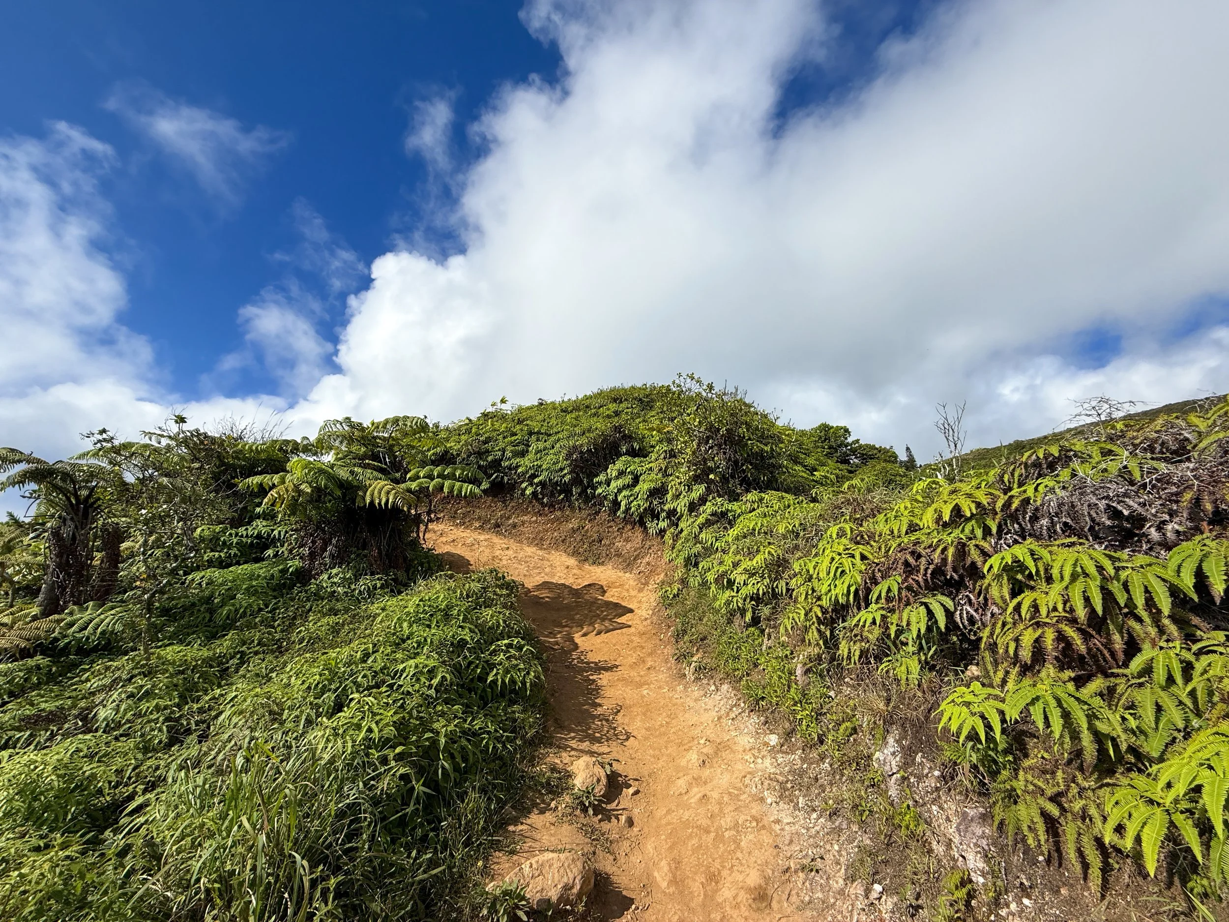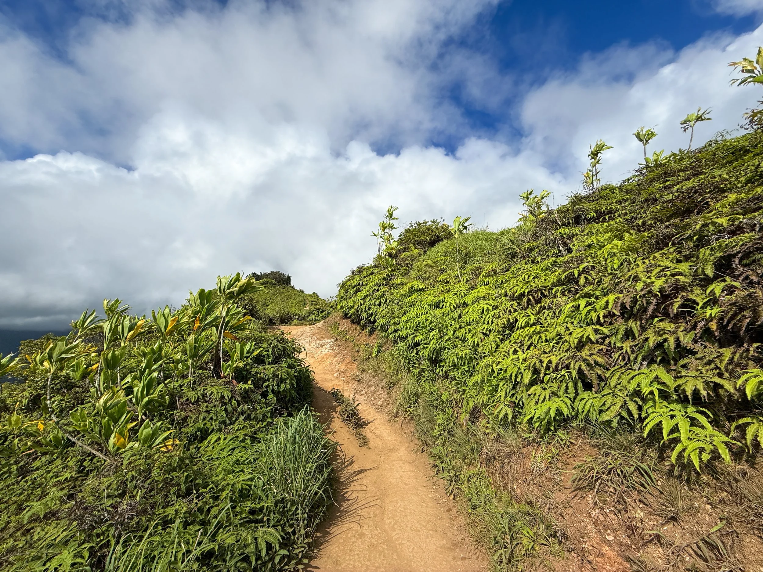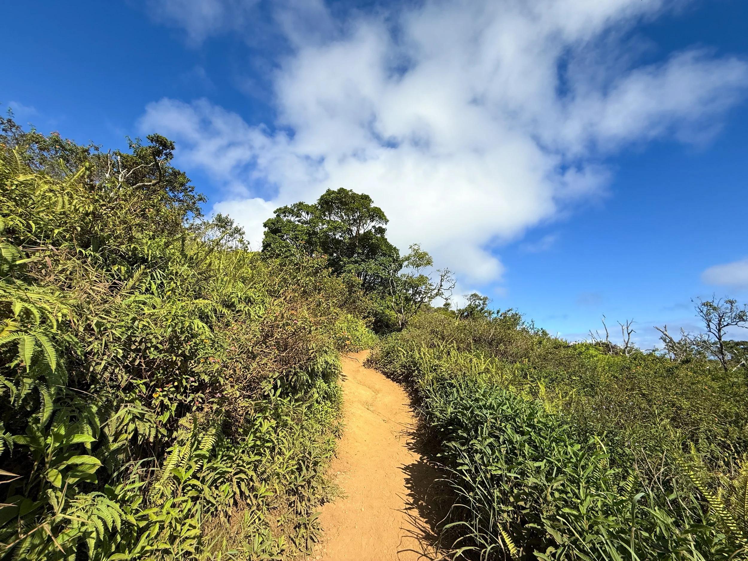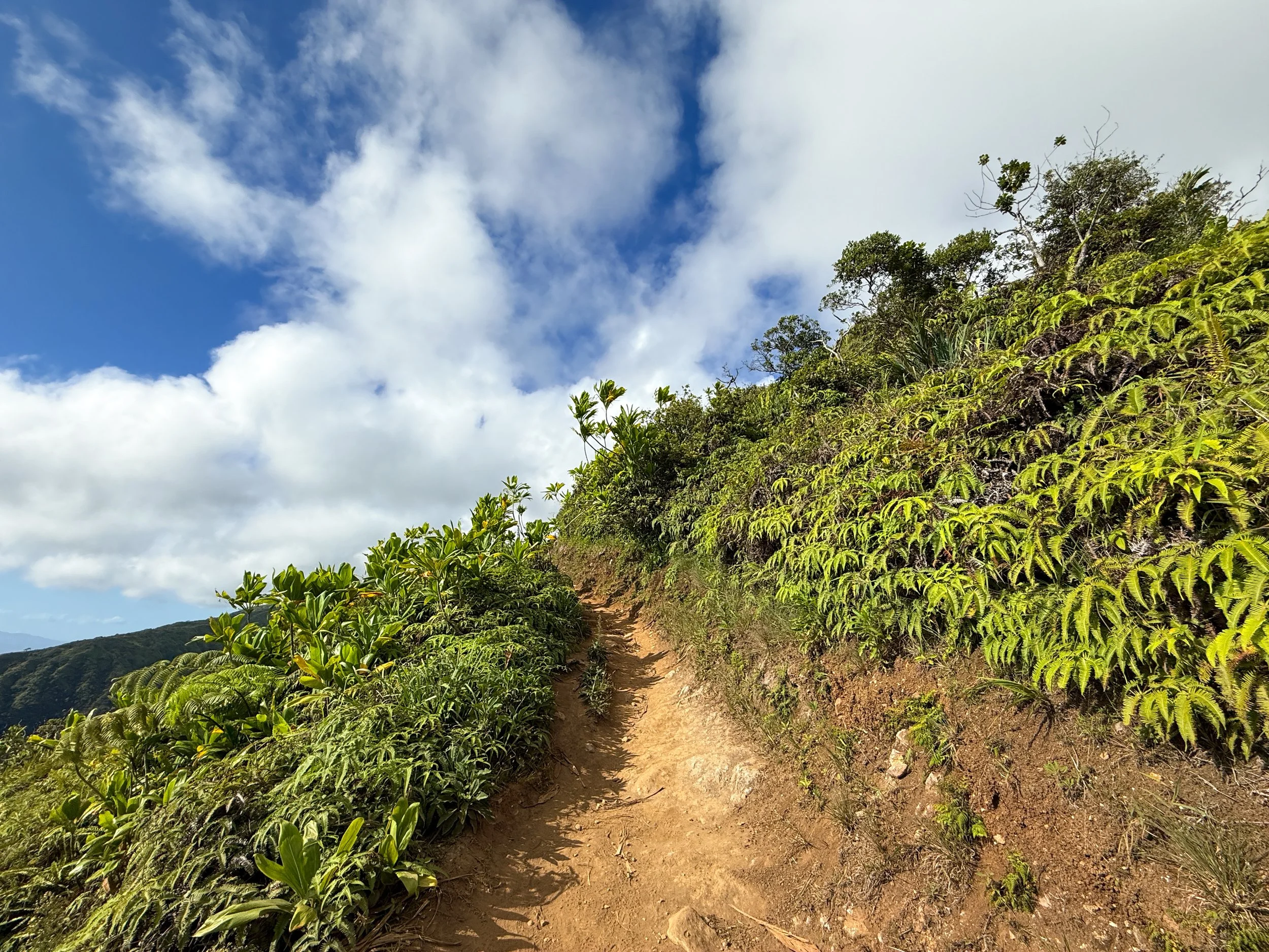 After the Waiheʻe Valley Overlook, the Waiheʻe Ridge Trail follows a slightly flatter section for the next 0.2 miles (0.3 km).