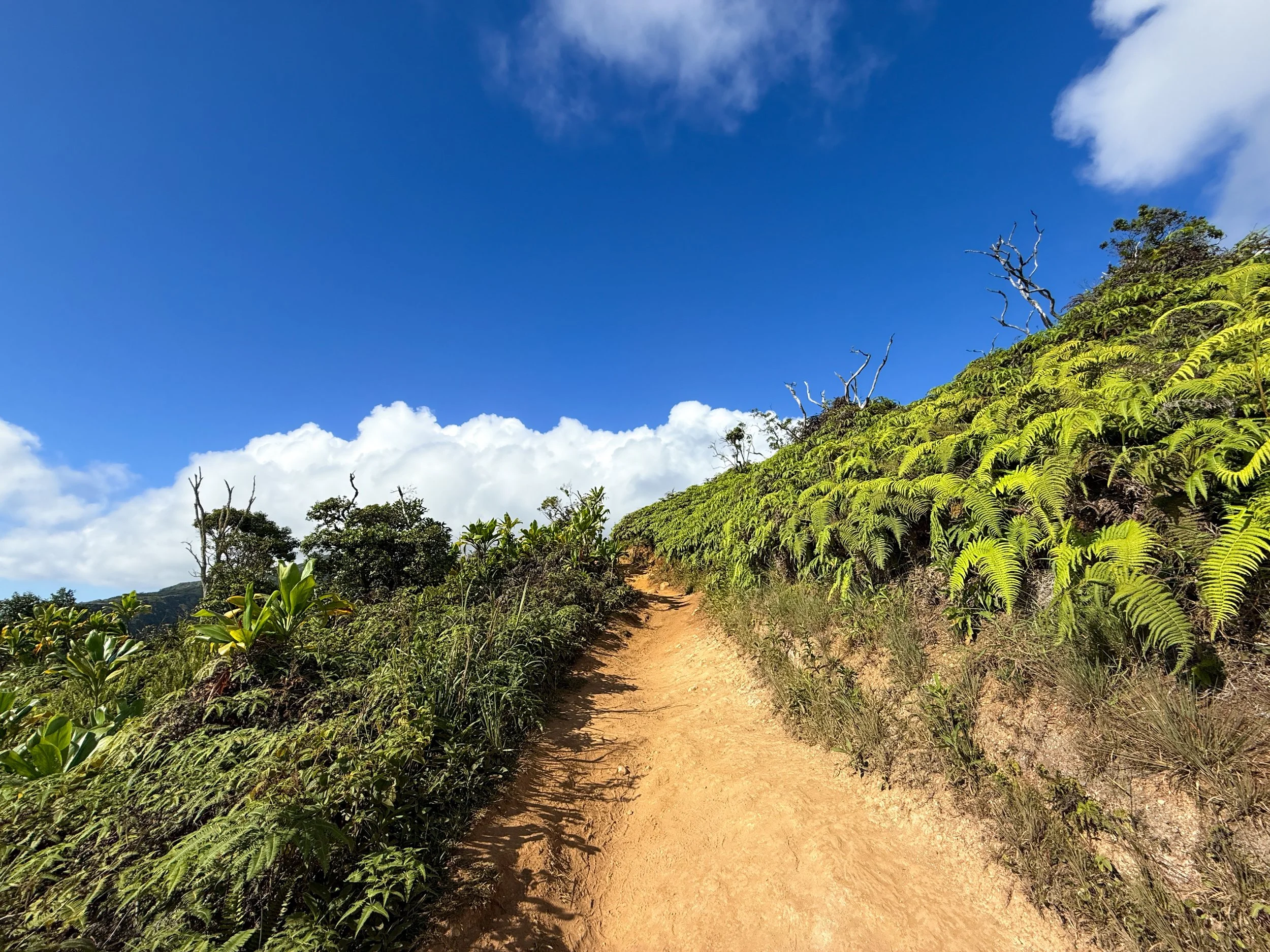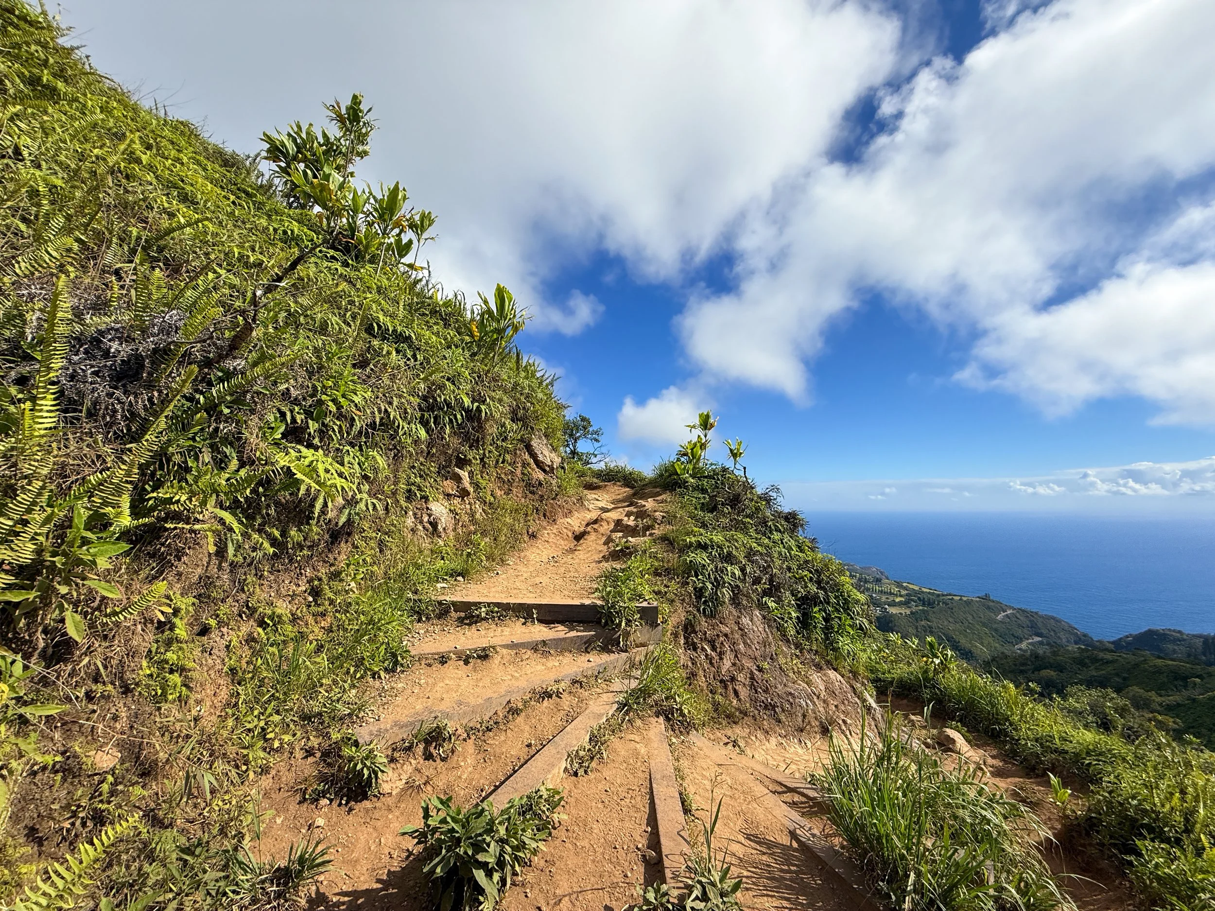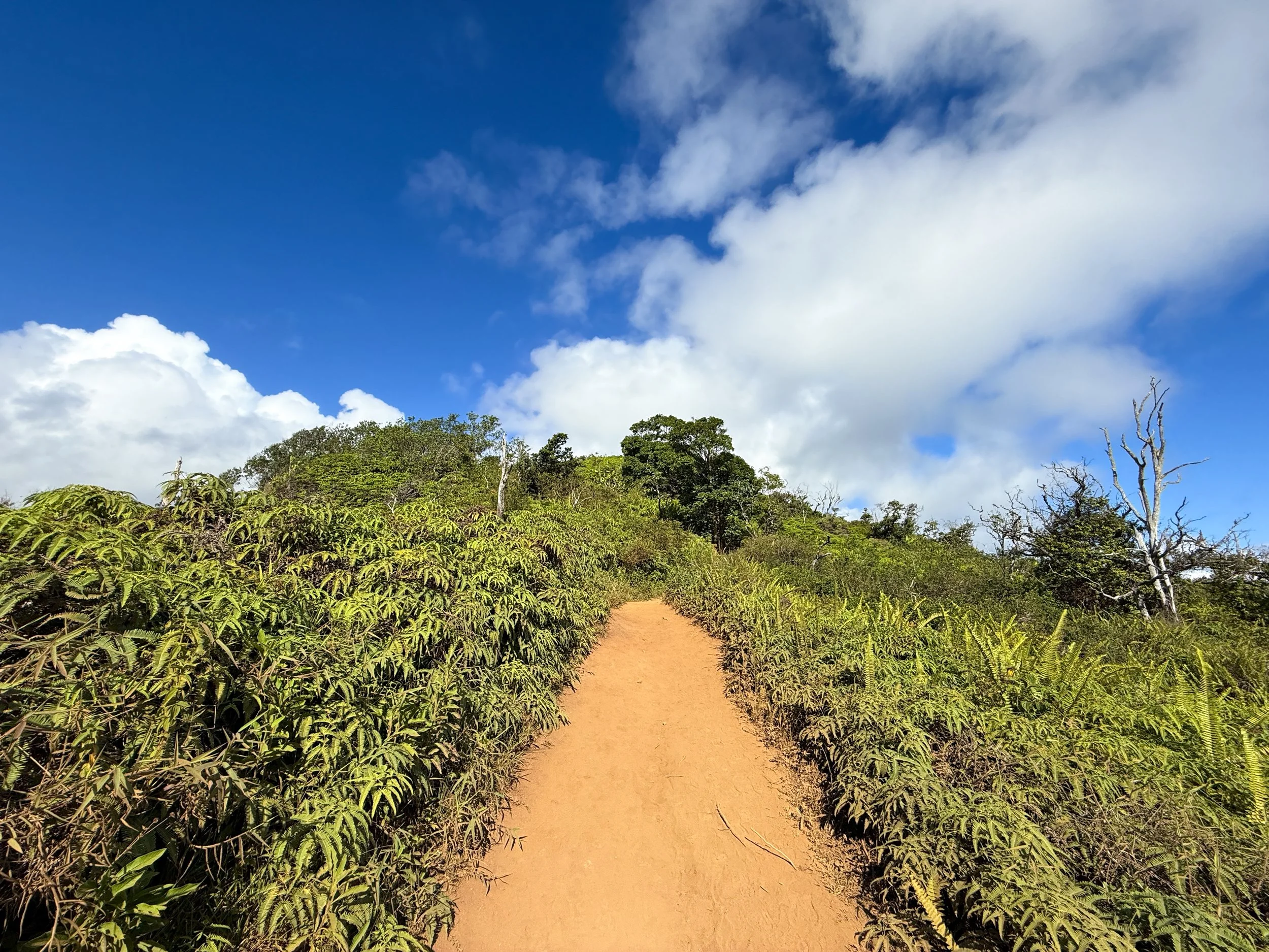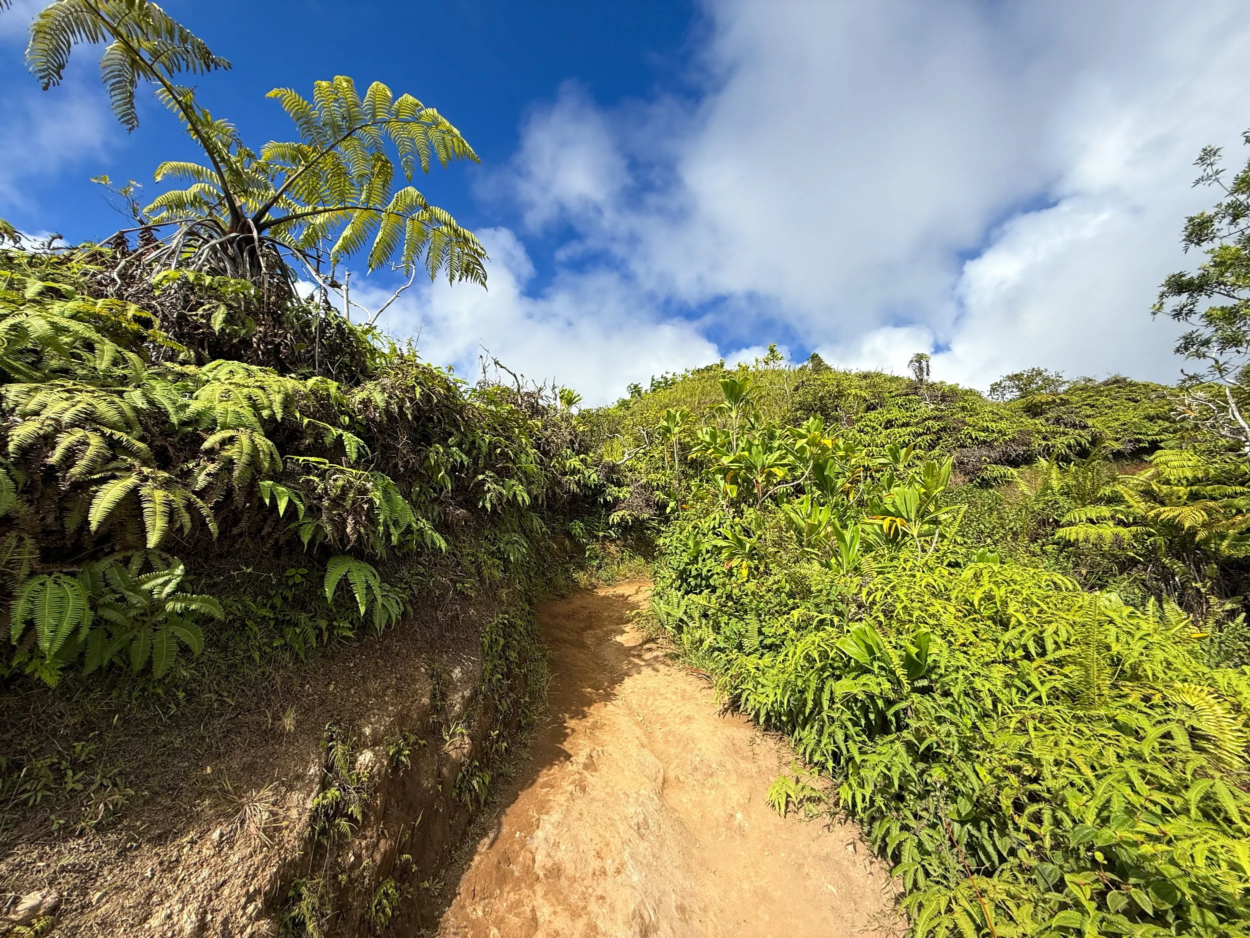 After the Waiheʻe Valley Overlook, the Waiheʻe Ridge Trail follows a slightly flatter section for the next 0.2 miles (0.3 km).