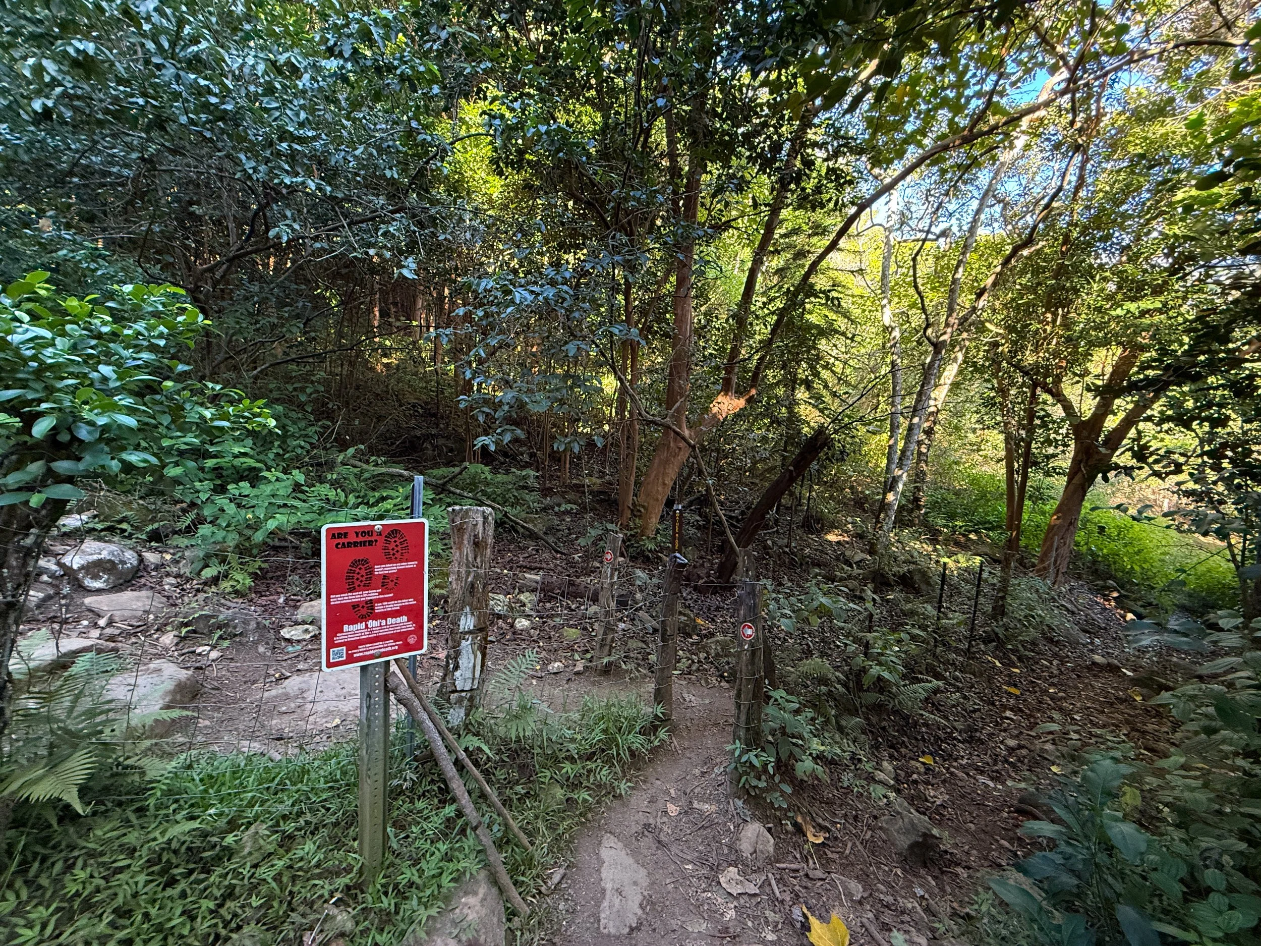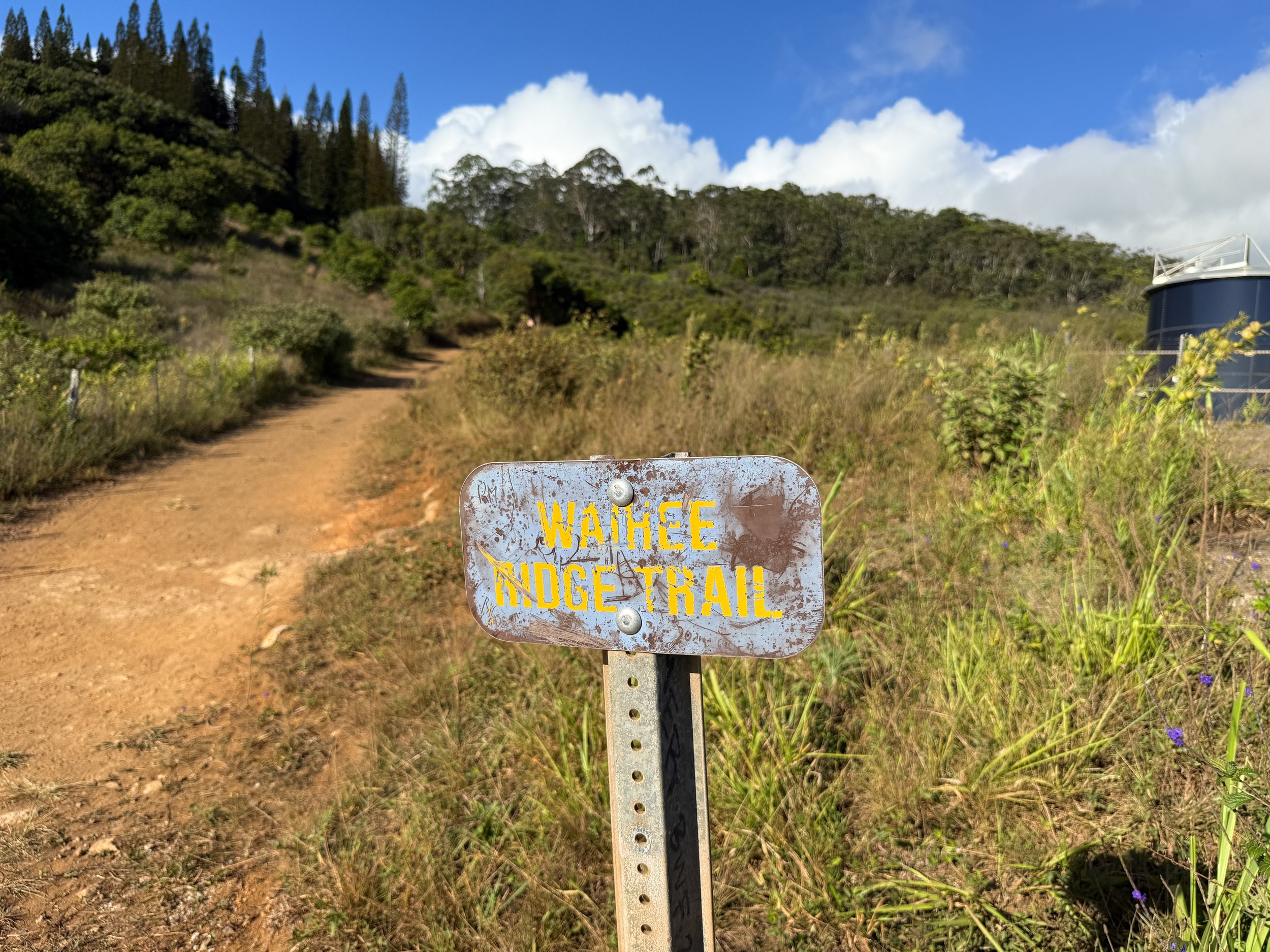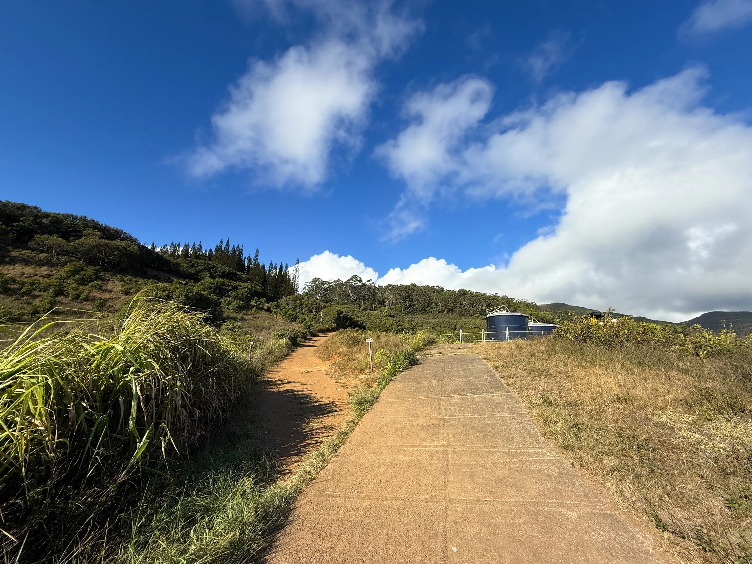 The Waiheʻe Ridge Trail begins up a short but steep 0.1-mile (0.2 km) service road that leads to the Camp Maluhia water tanks at the top of the hill, before it branches off onto the actual trail.