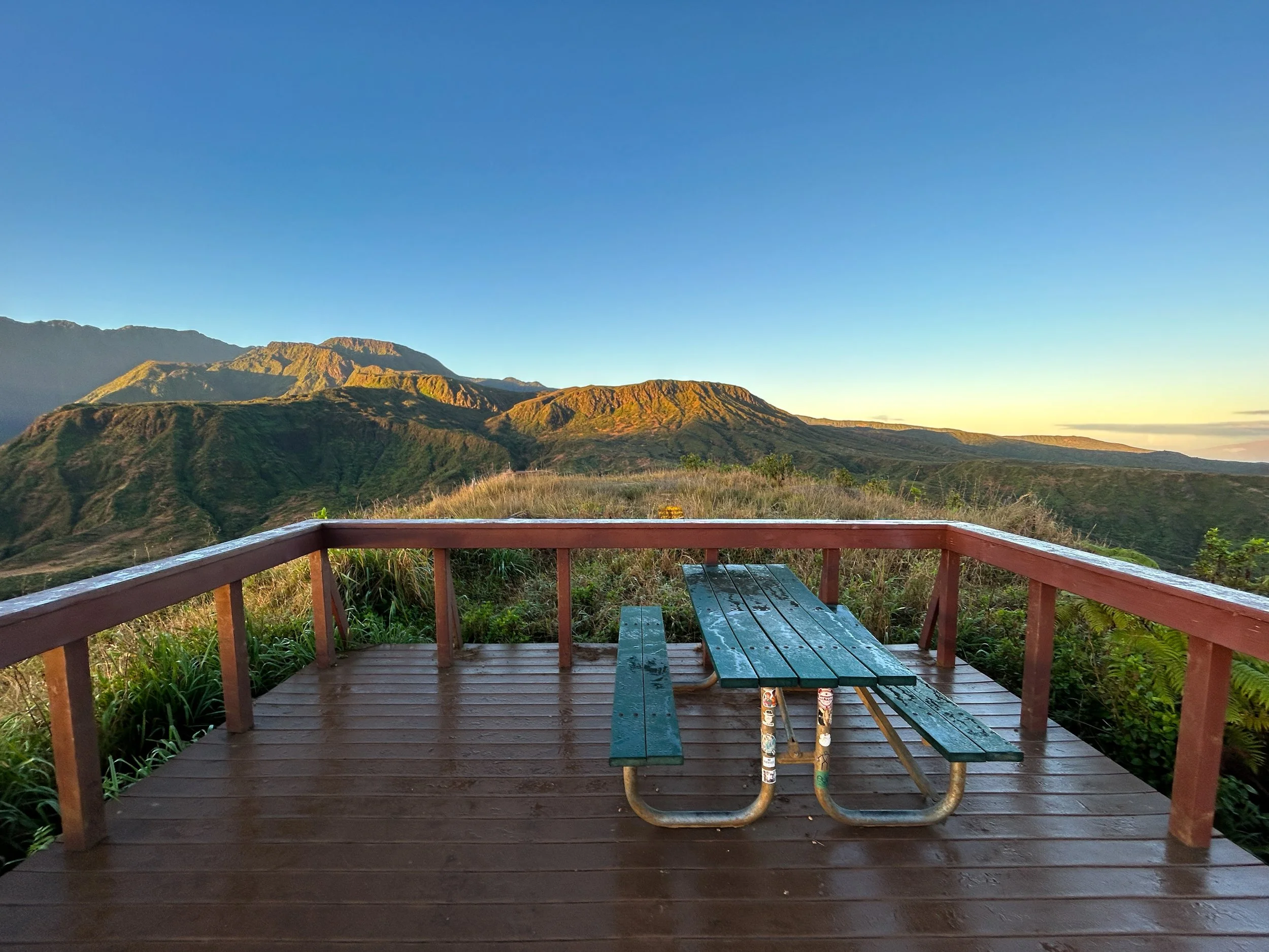 That said, the summit is only about halfway up the West Maui Mountains (Puʻu Kukui), but on a clear day, like in the sunrise photo below, hikers can get amazing views of Waiheʻe Valley, Keahikauō (the circular summit closest to the platform), and ʻEke Crater, one of the most prominent volcanic landmarks on the northeast side of the watershed.