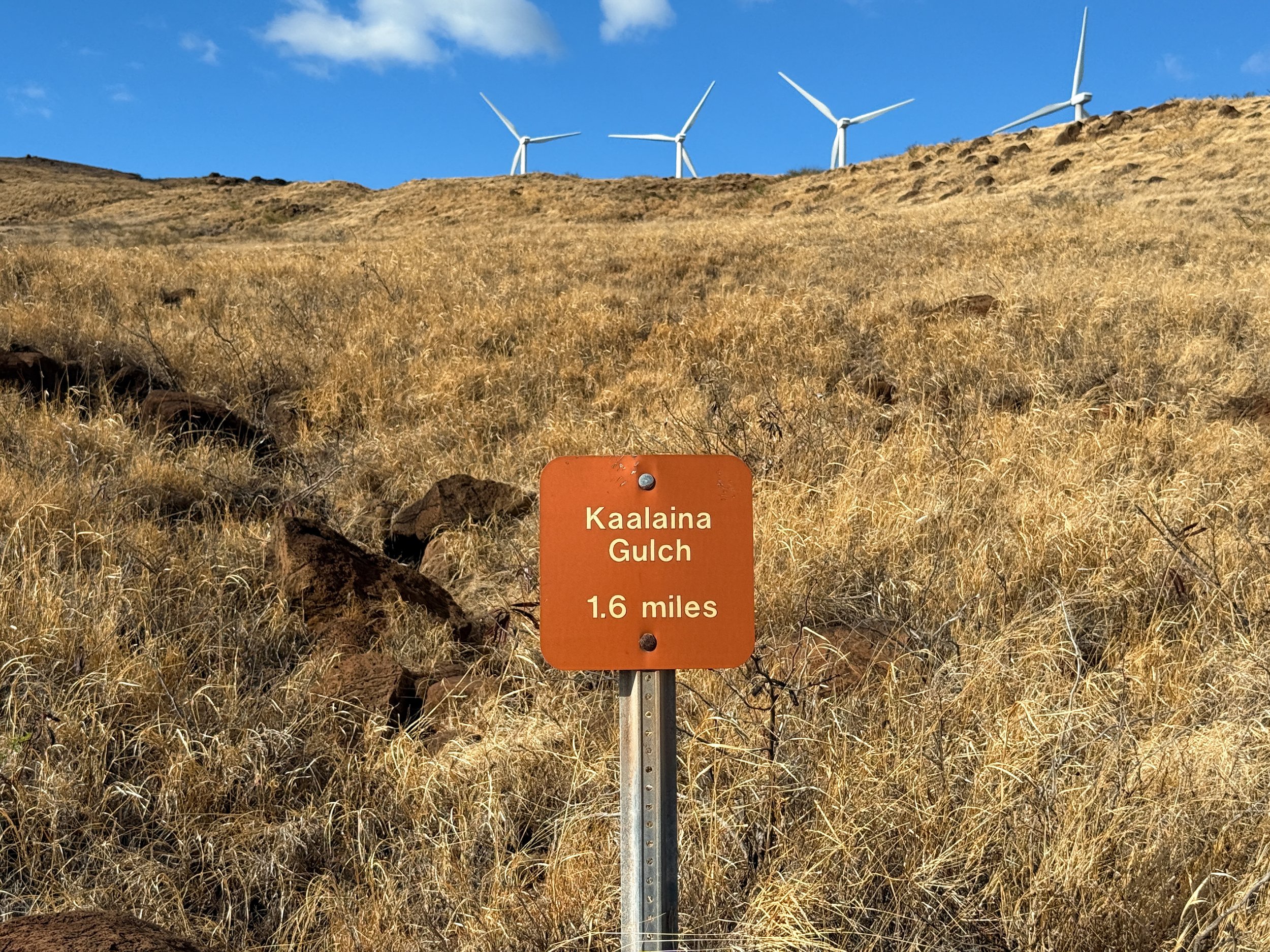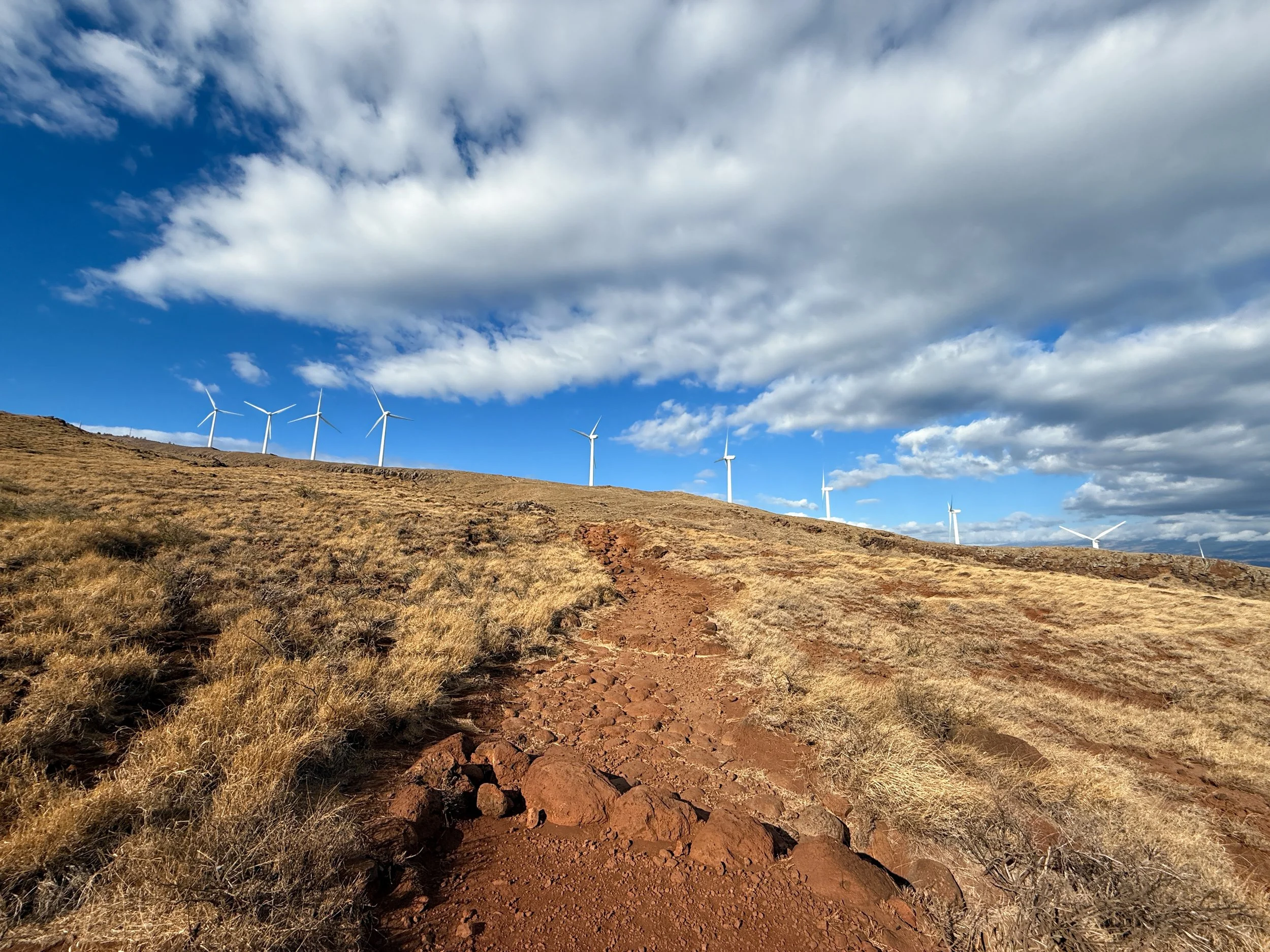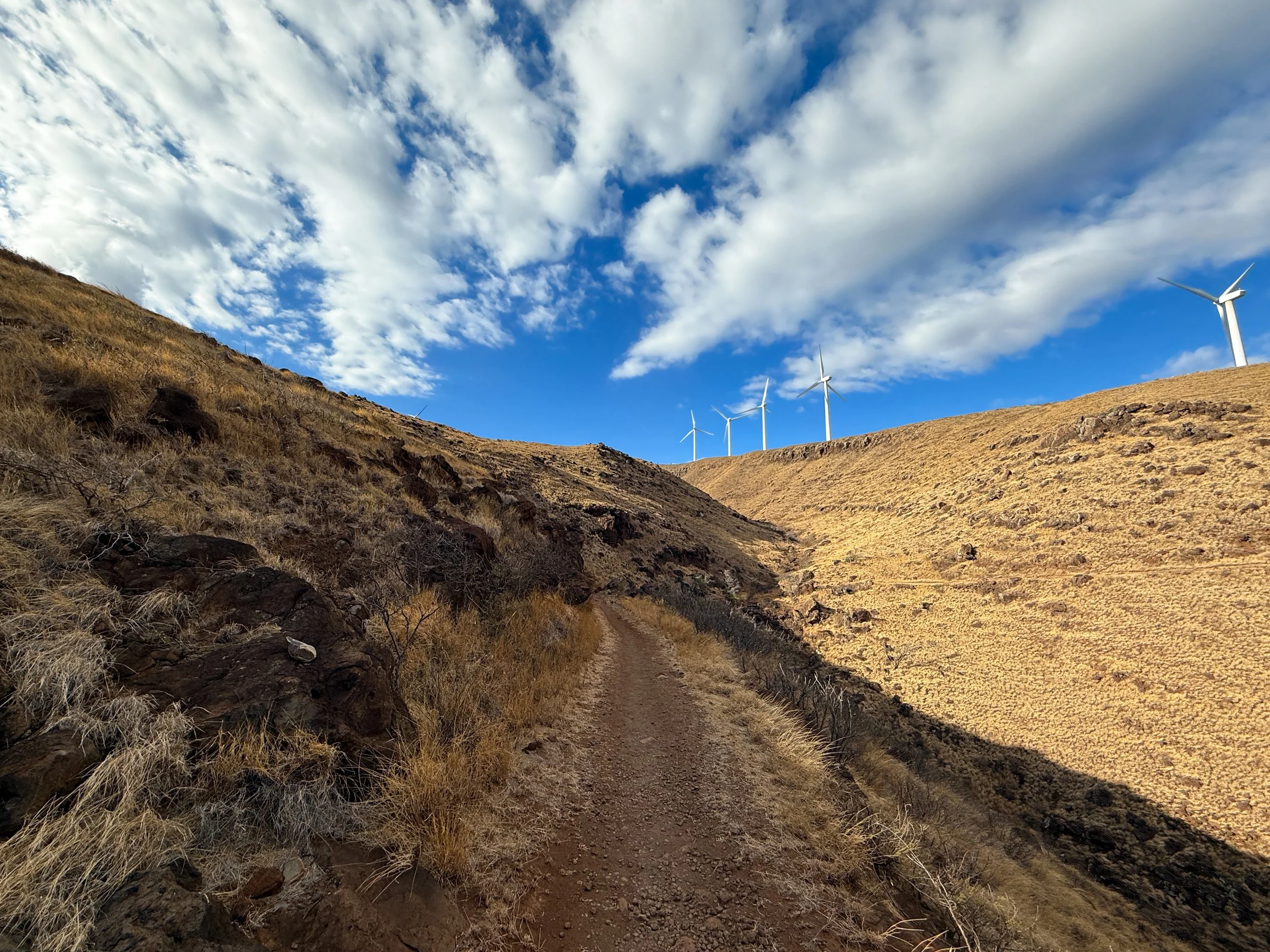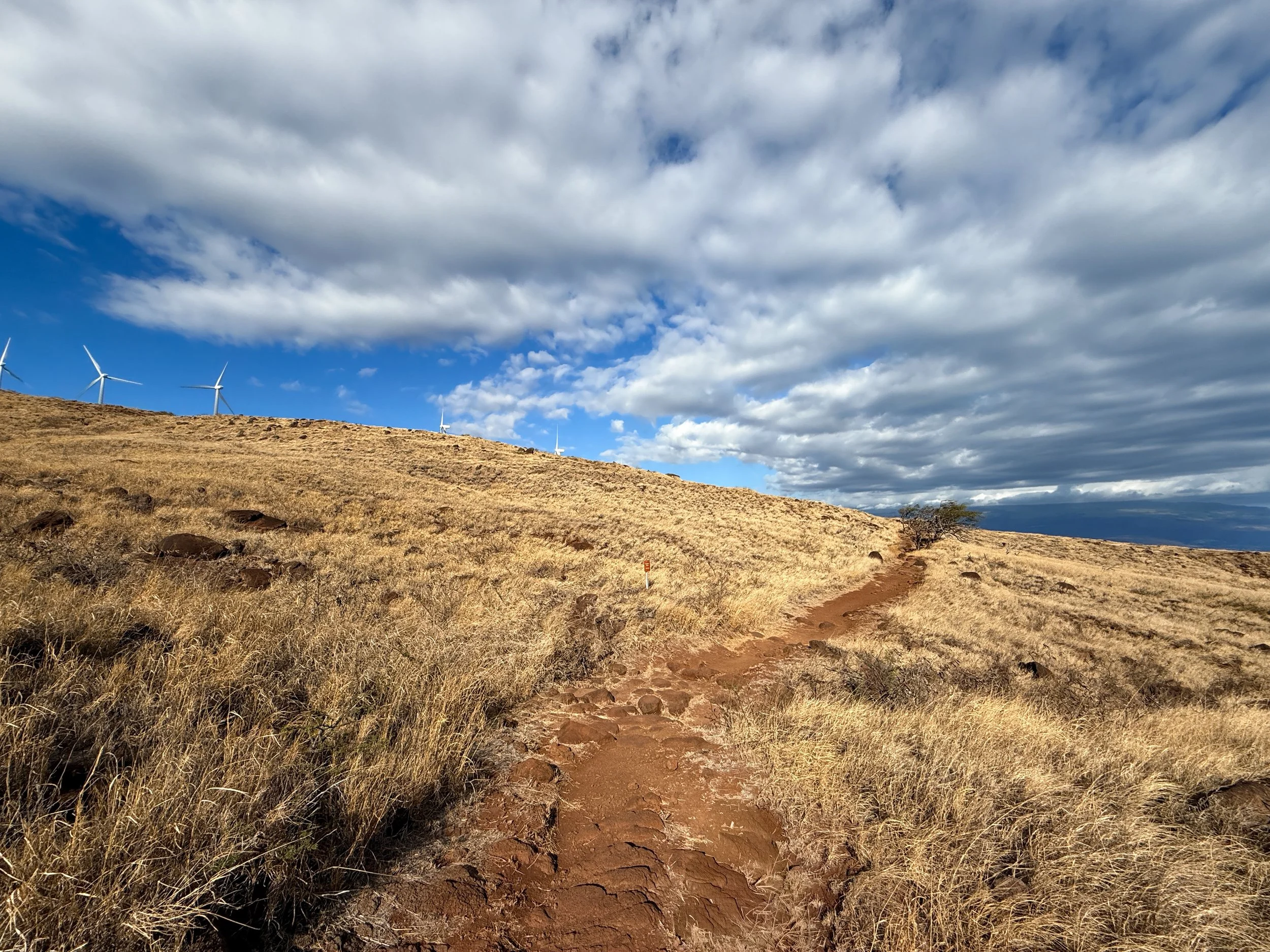 Just before Kaheawa Pastures Access Road, the West Lāhainā Pali Trail climbs 3 switchbacks to reach the windmills on Kealaloloa Ridge.