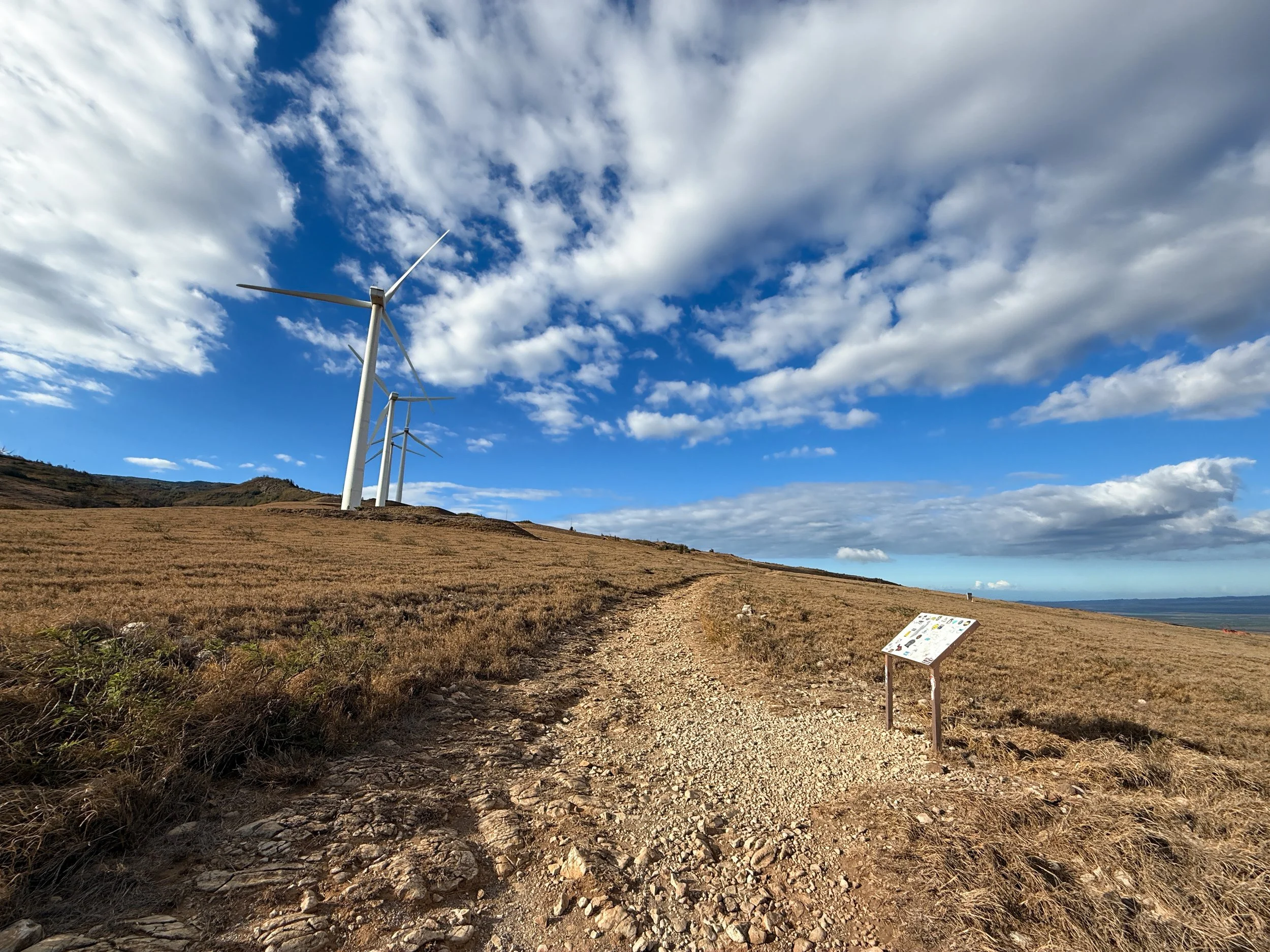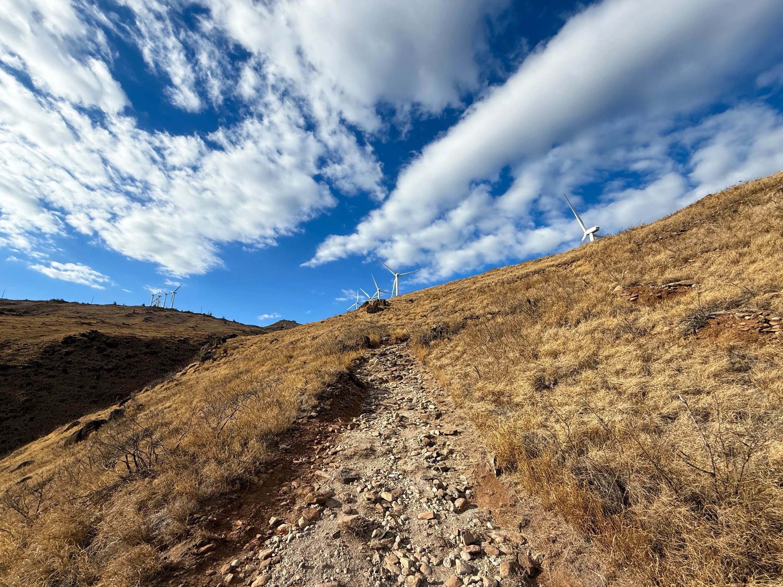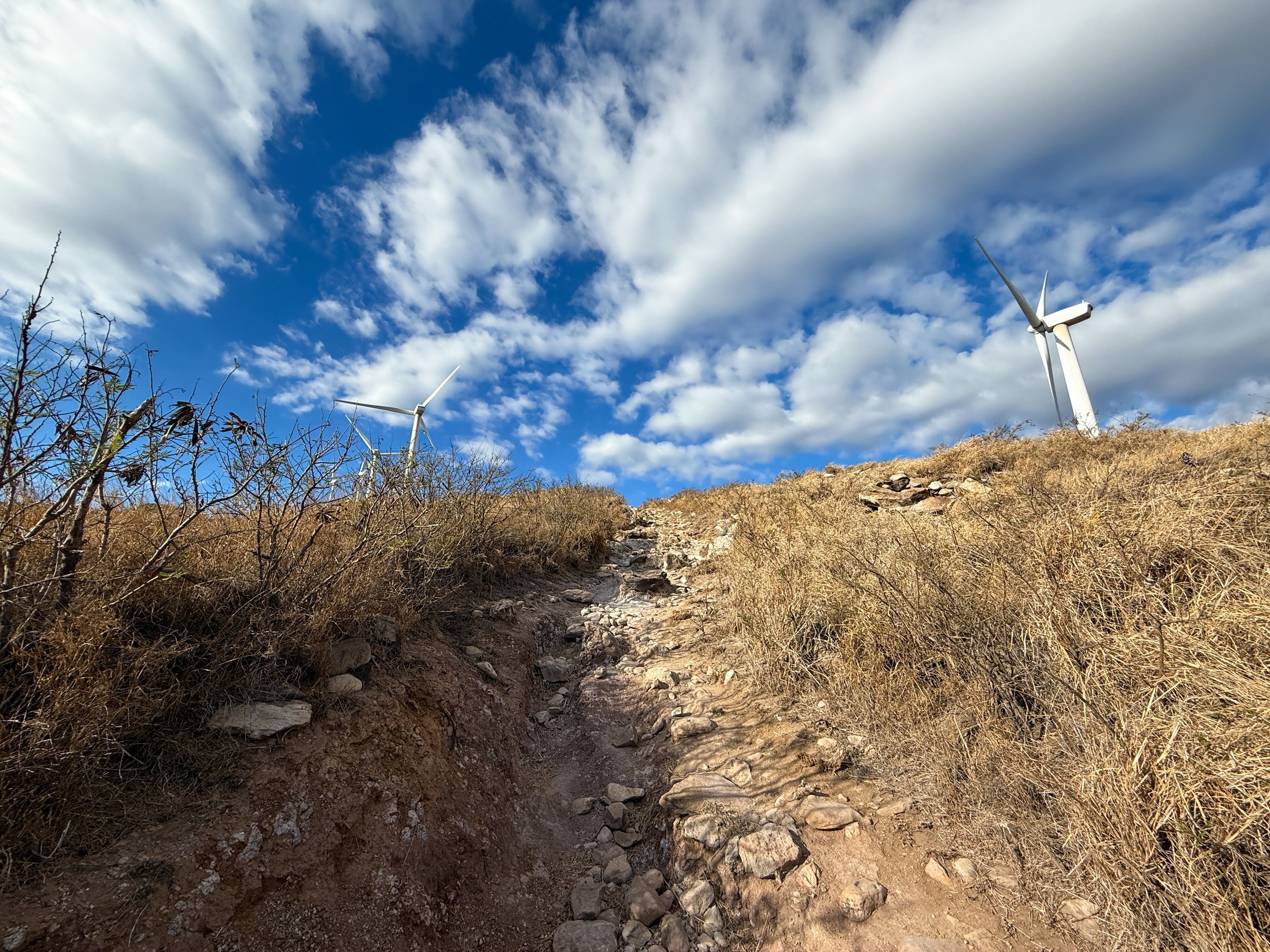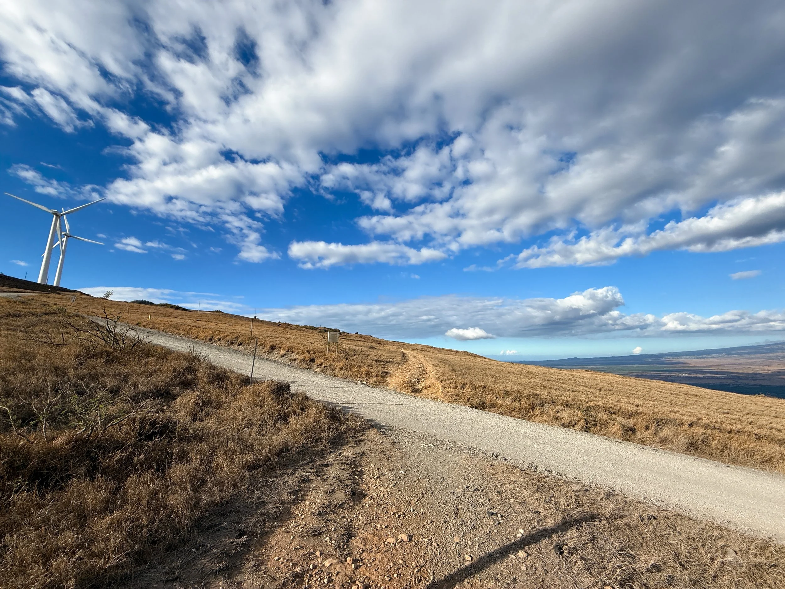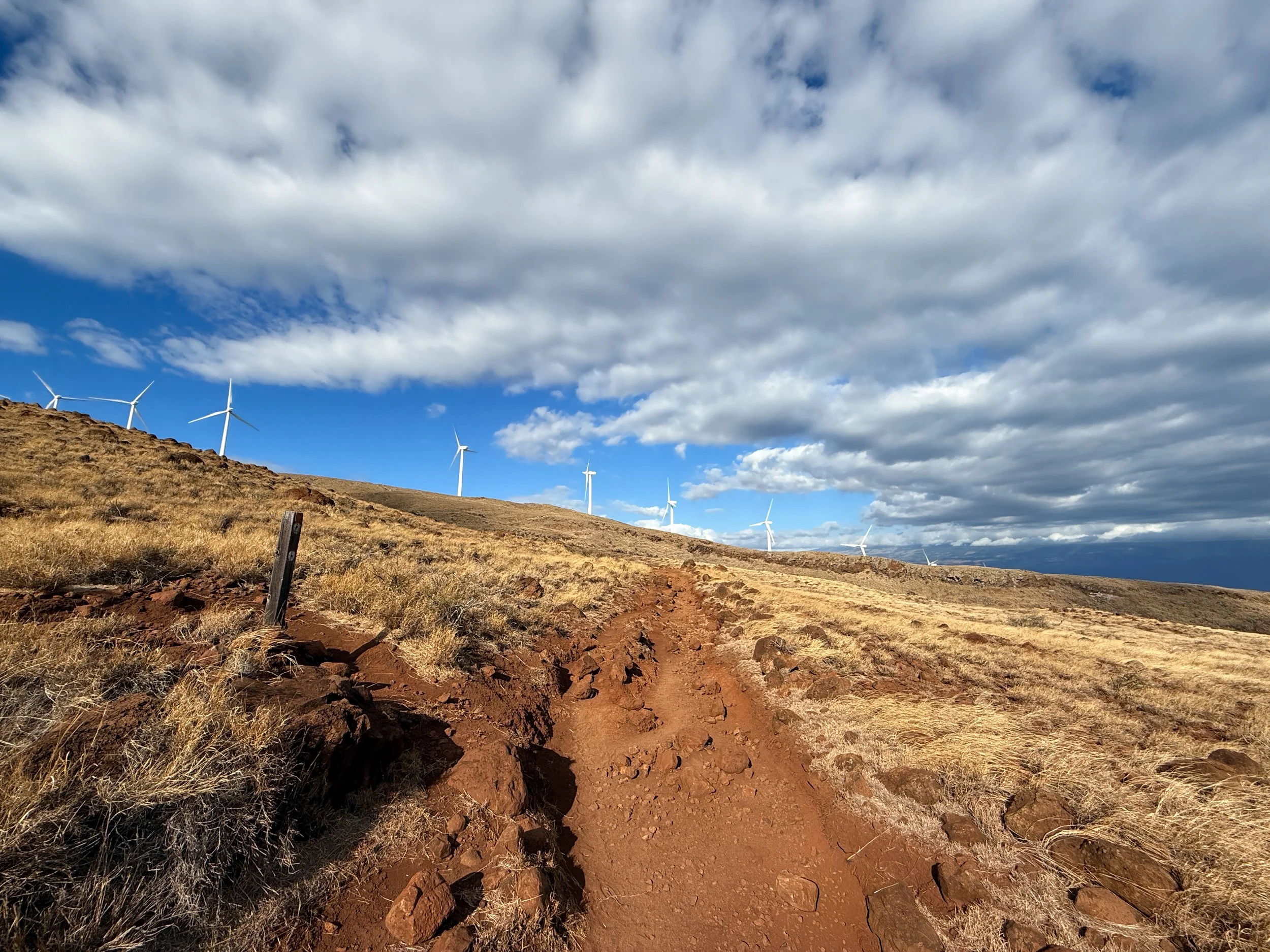 Just before Kaheawa Pastures Access Road, the West Lāhainā Pali Trail climbs 3 switchbacks to reach the windmills on Kealaloloa Ridge.