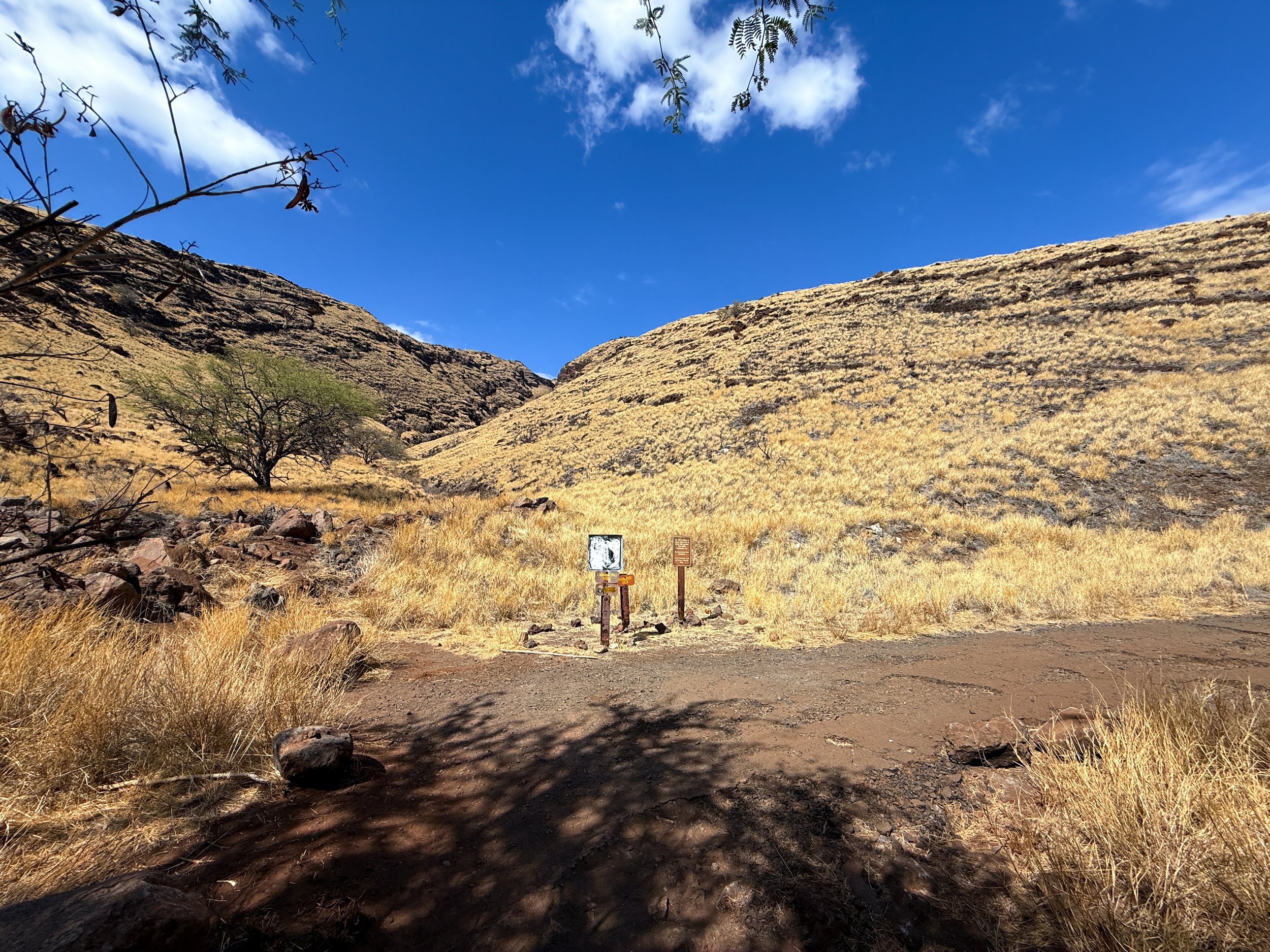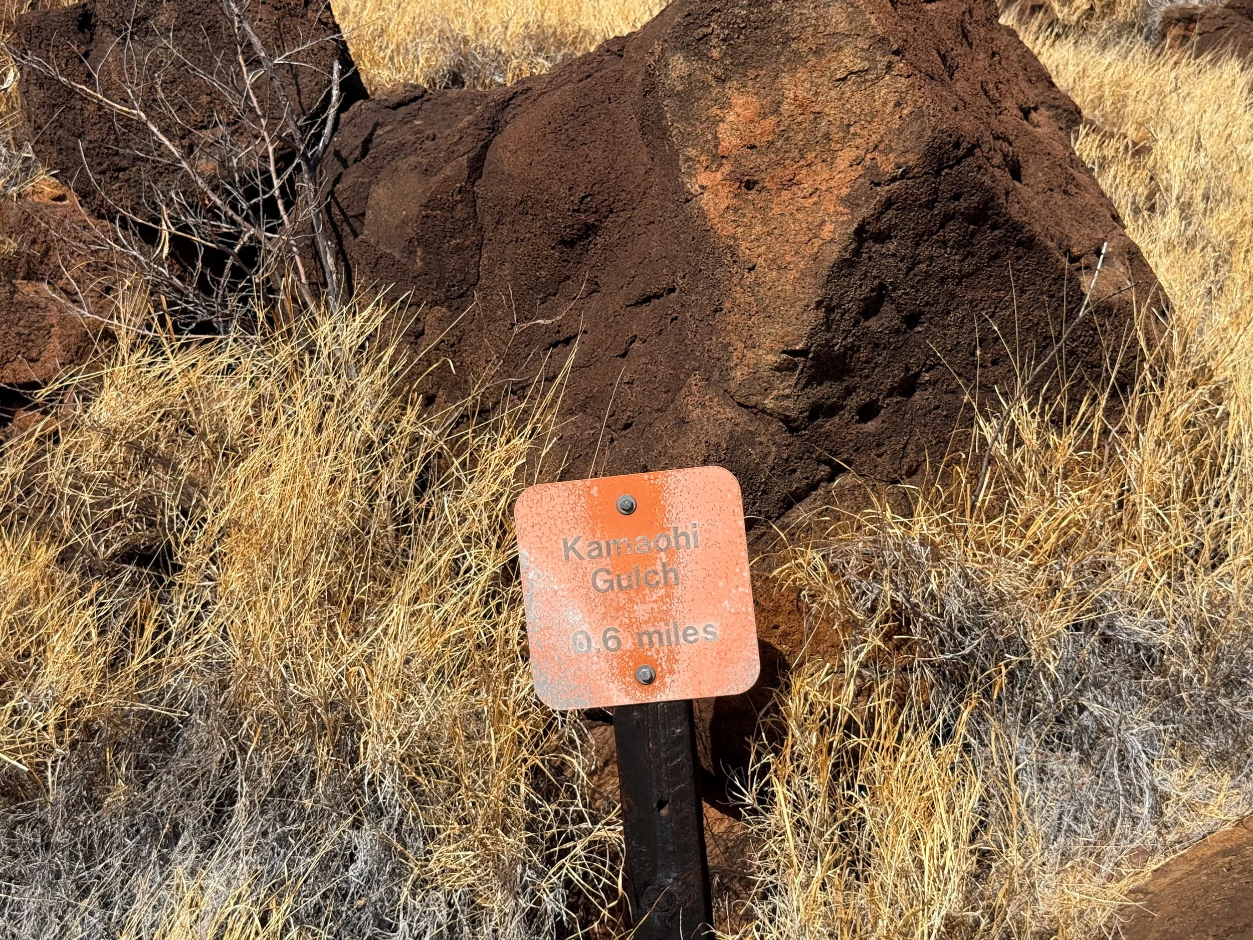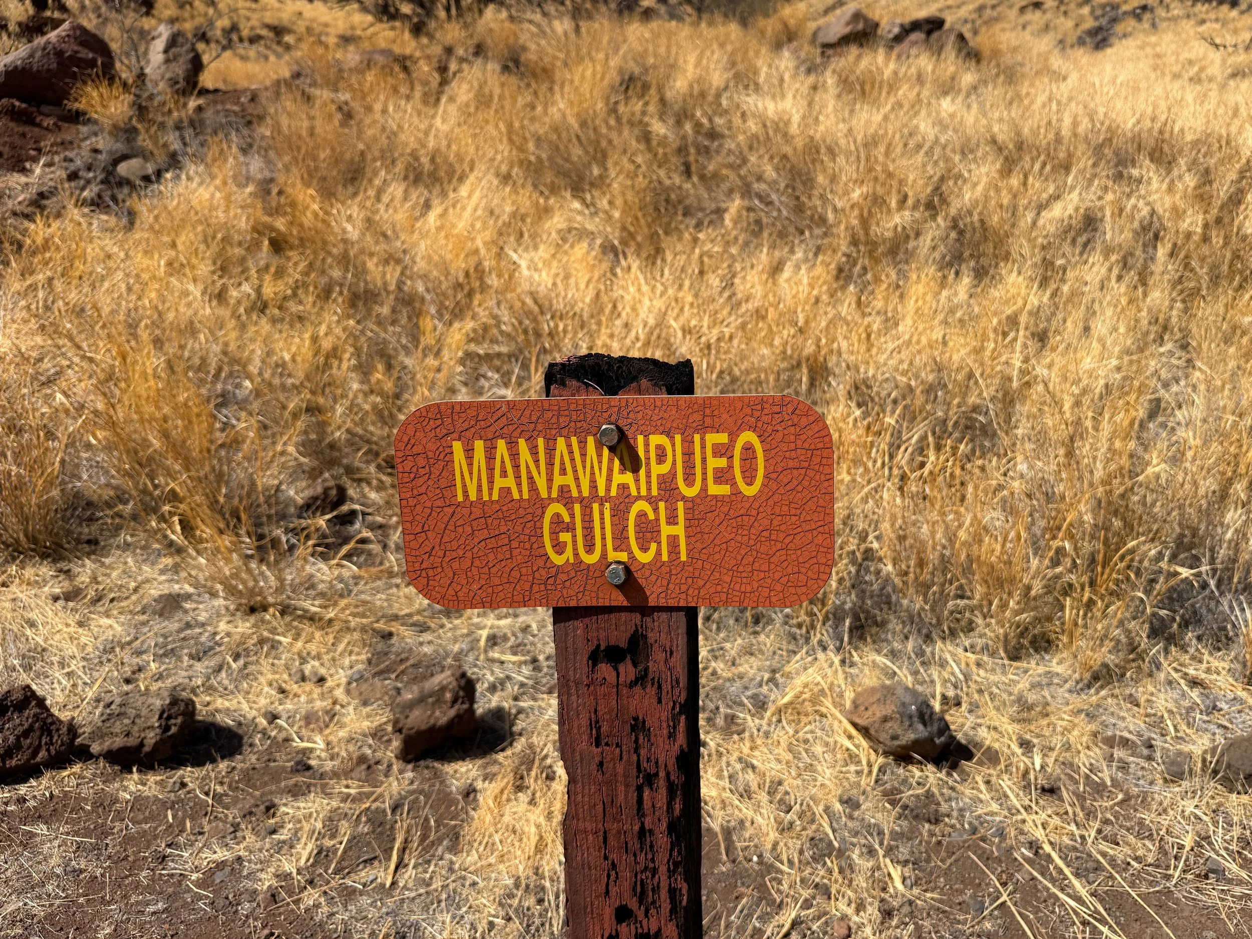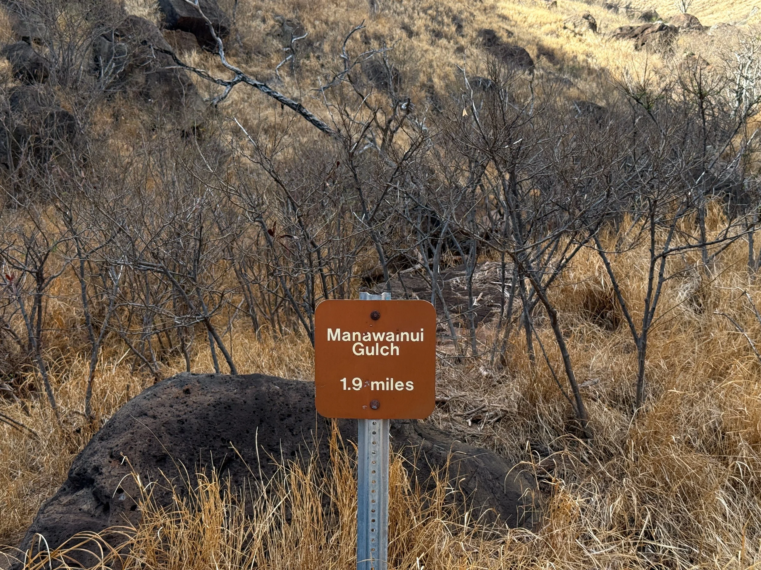 Manawainui Gulch is the last named gulch on the West Lāhainā Pali Trail, and it’s a nice sign that only 0.4 miles (0.6 km) remain before the end of the hike.