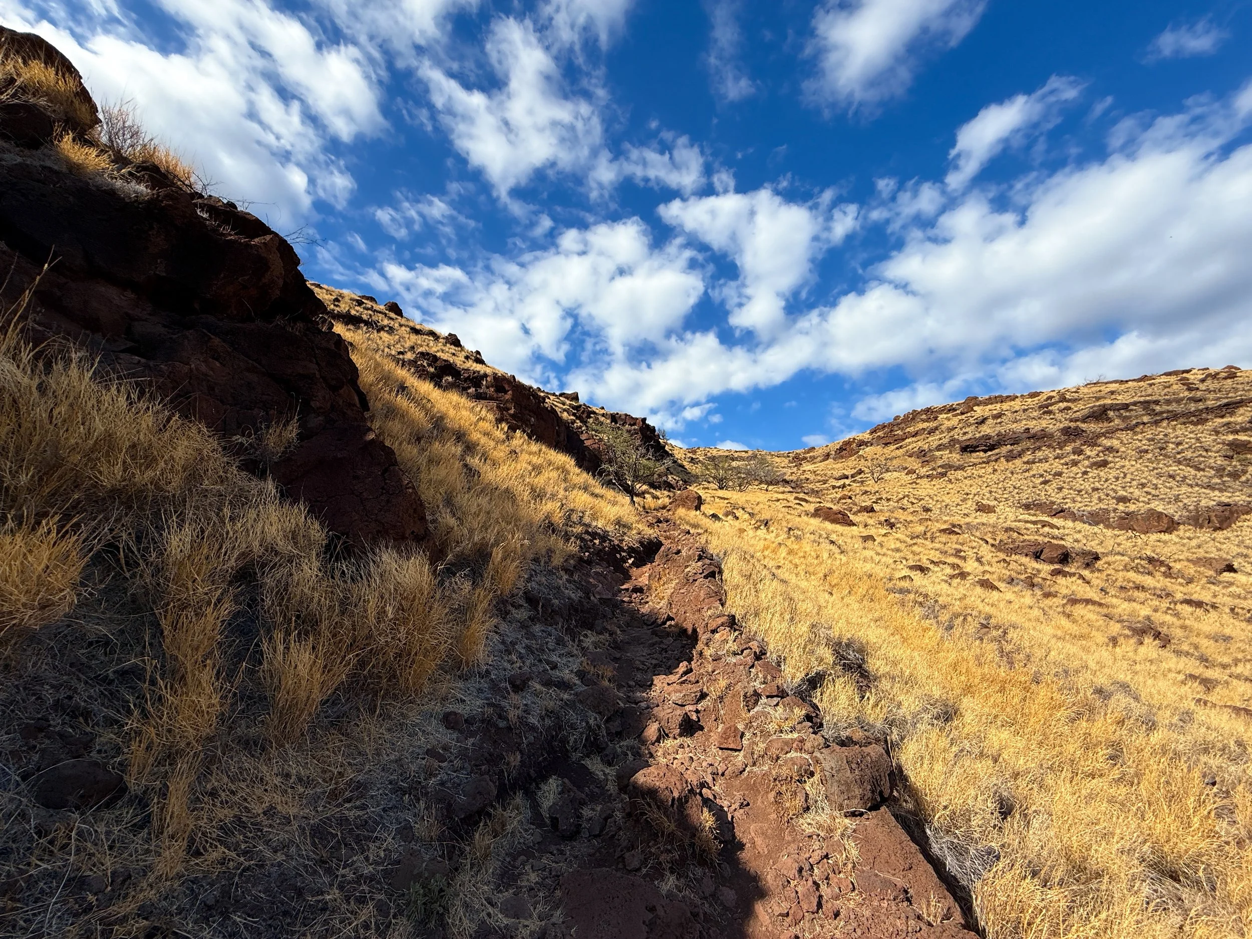 This is where the West Lāhainā Pali Trail enters the last gulch before the final switchbacks up to Kaheawa Pastures Access Road.
