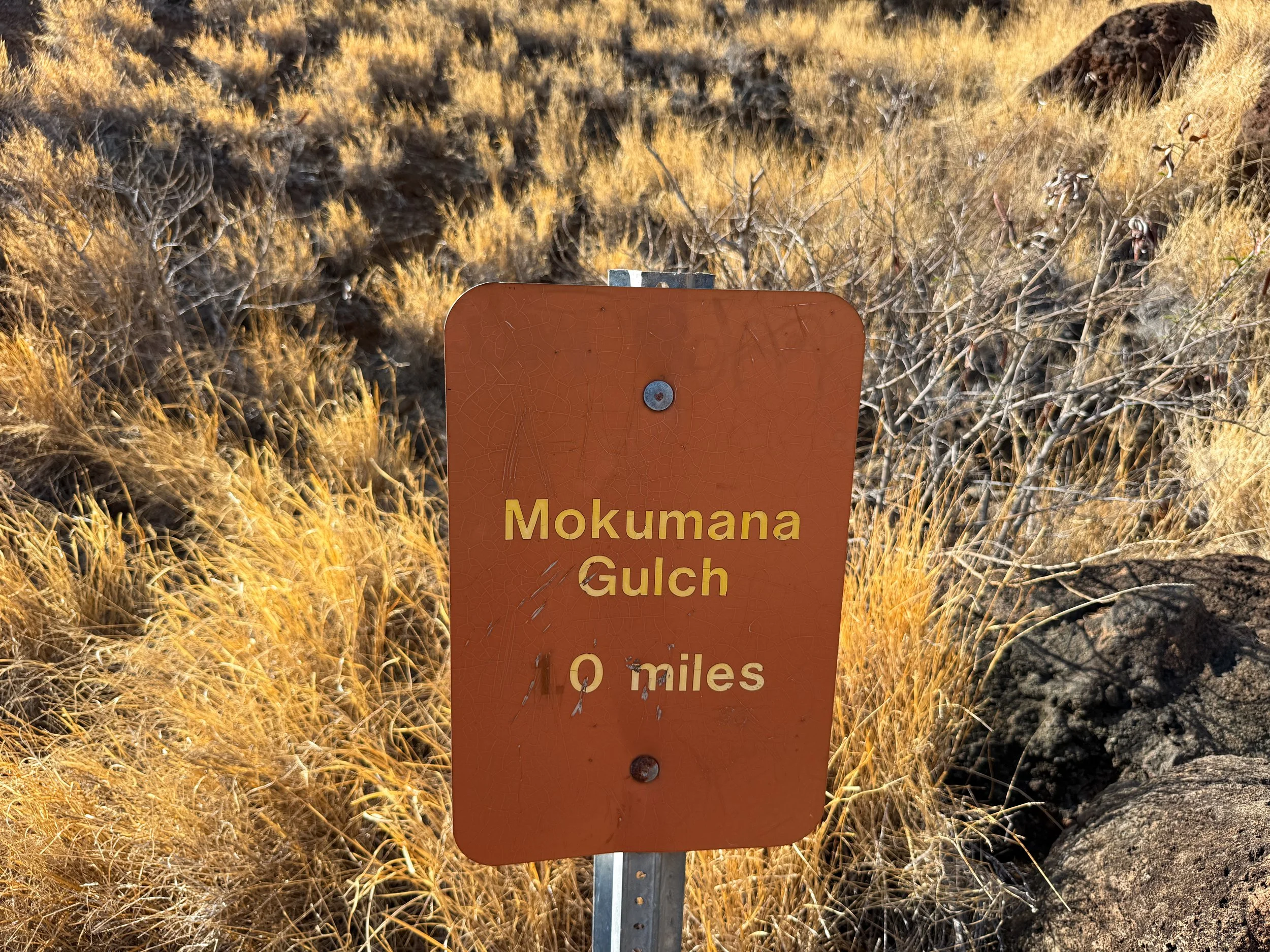 Mokumana Gulch is roughly the 1.0-mile (1.6 km) mark on the West Lāhainā Pali Trail, meaning there is about 1.3 miles (2.1 km) left before Kealaloloa Ridge and the start of the East Lāhainā Pali Trail.